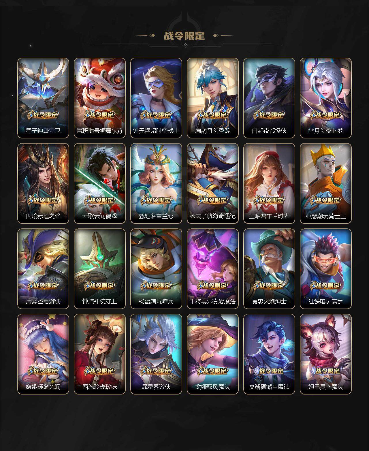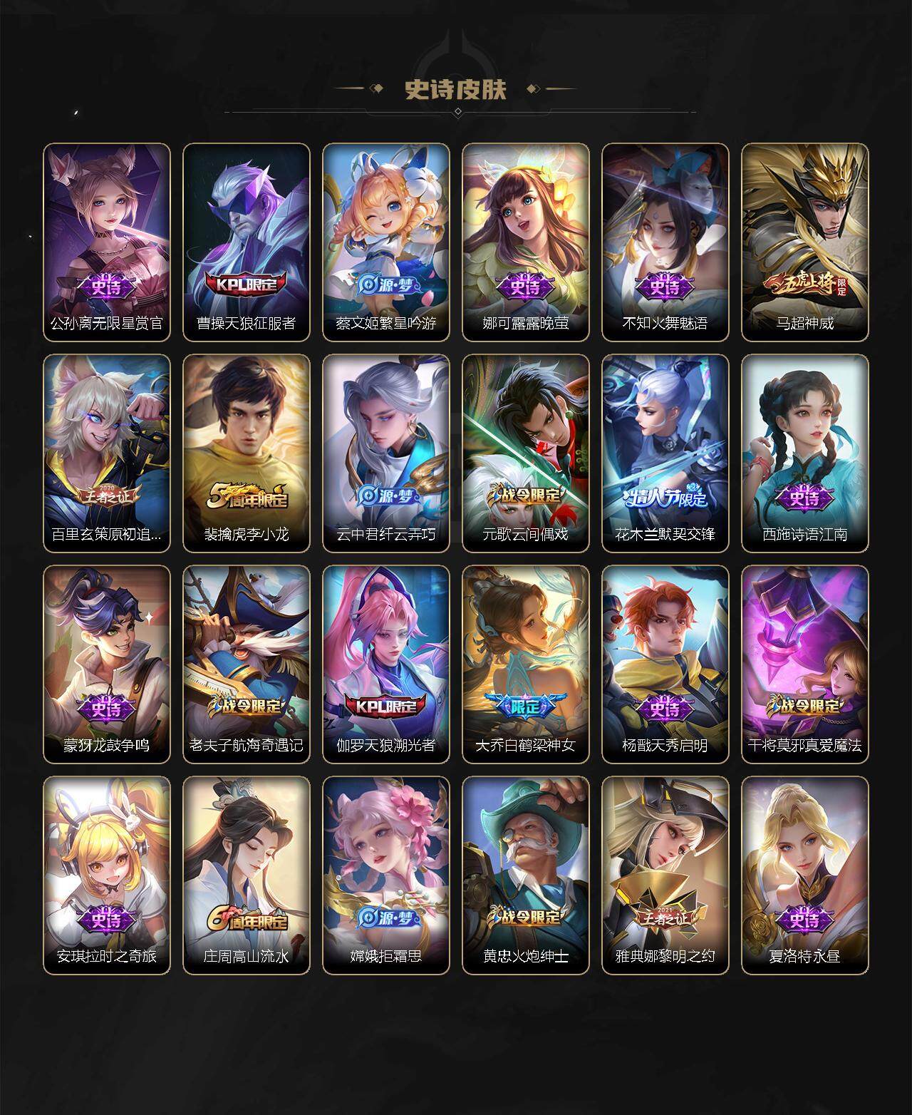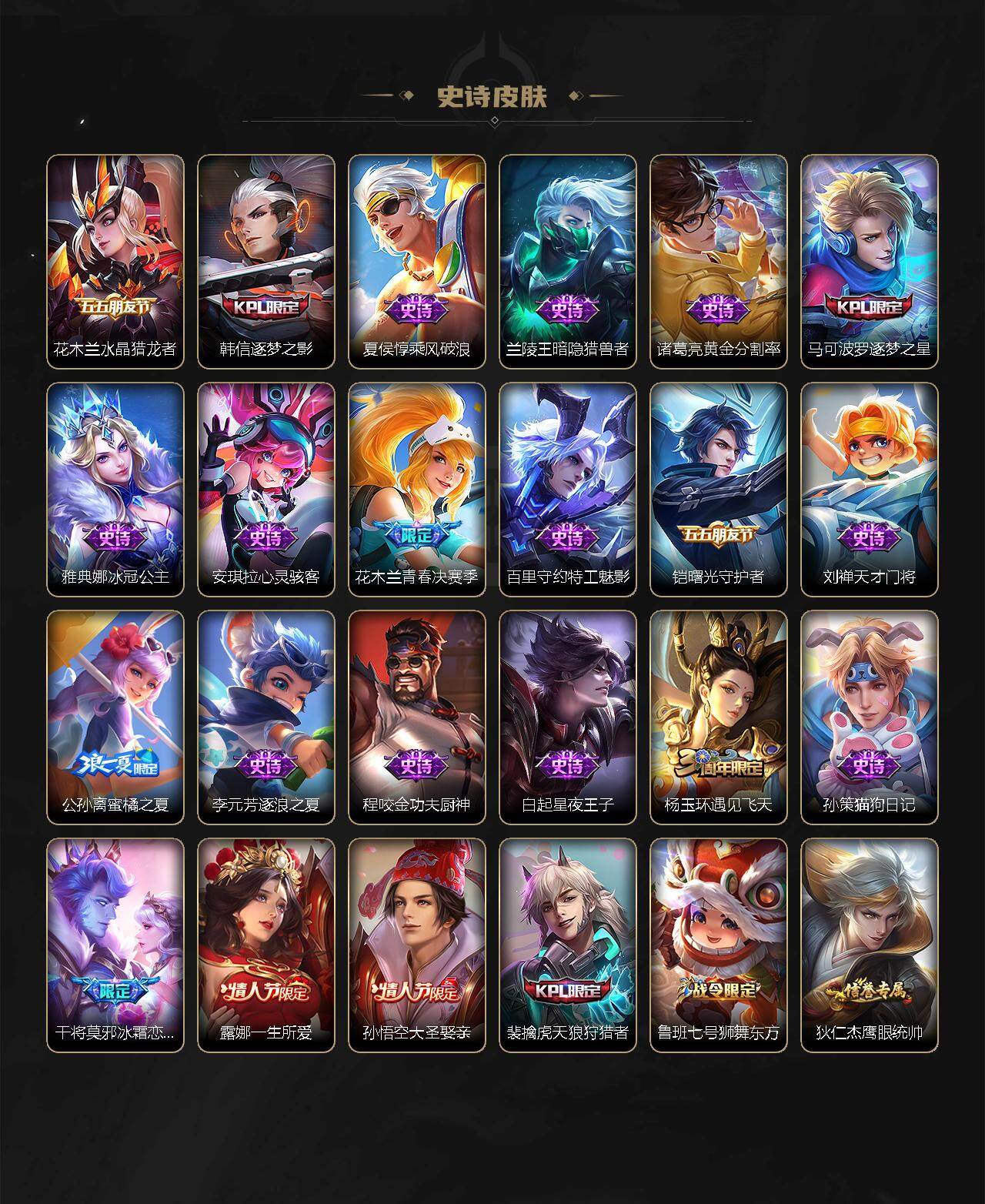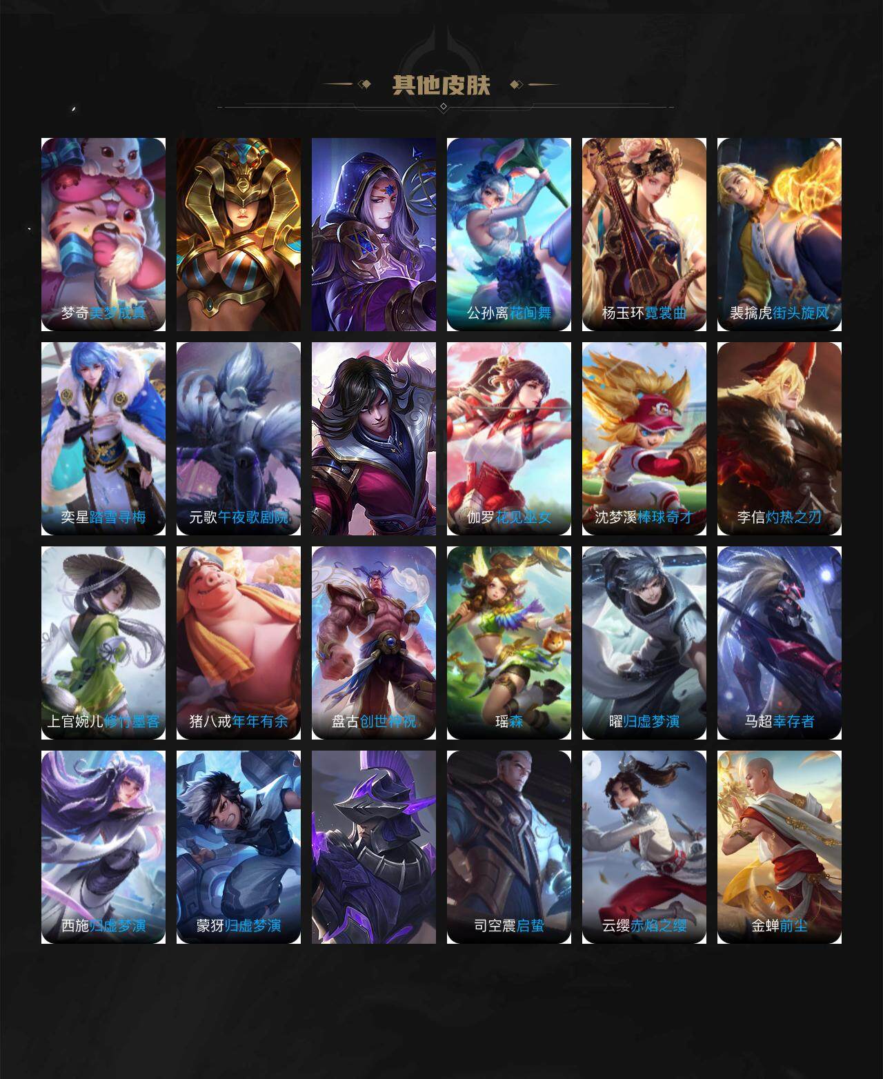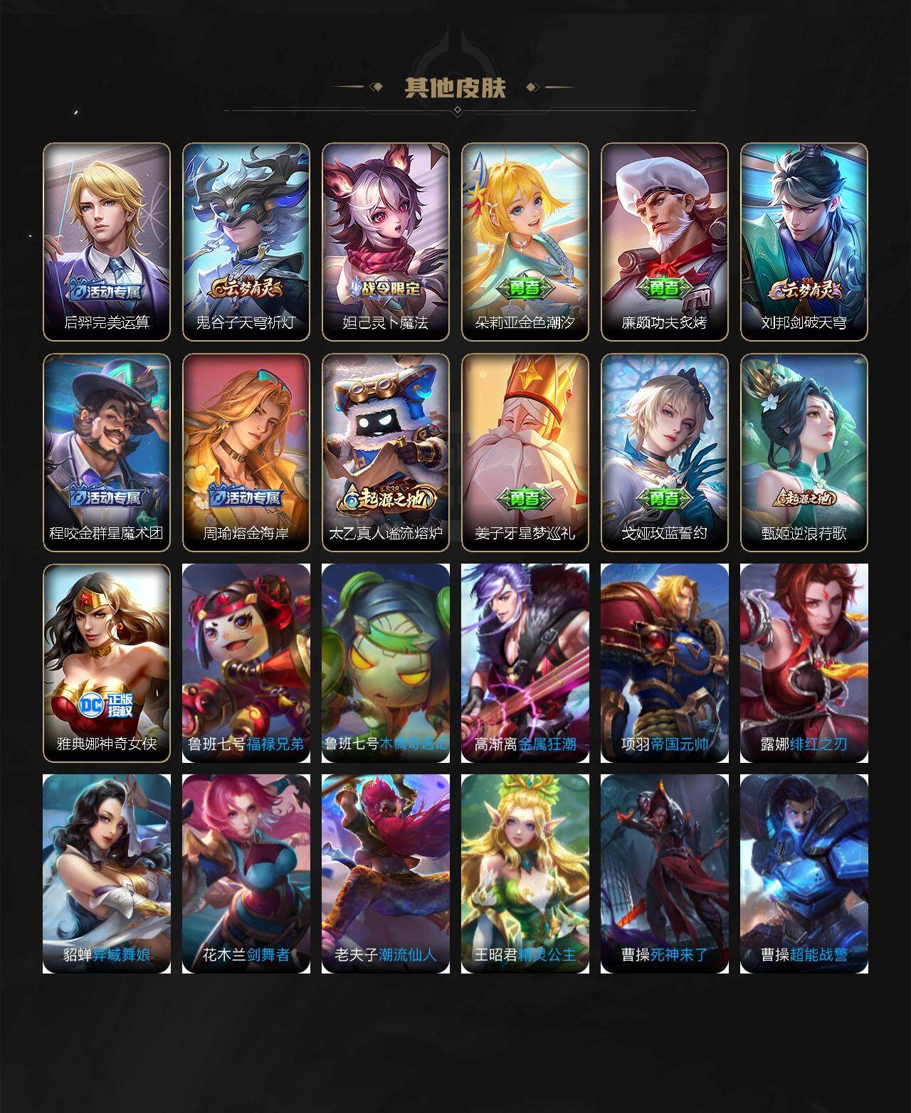 【限定皮肤】:白起狰,狄仁杰阴阳师,赵云皇家上将,赵云引擎之心,墨子神迹守卫,嬴政优雅恋人,孙尚香异界灵契,鲁班七号狮舞东方,庄周高山流水,高渐离死亡摇滚,钟无艳超时空战士,扁鹊奇幻香踪,白起夜都怪侠,芈月重明,芈月幻夜卜梦,吕布天魔缭乱,周瑜赤莲之焰,元歌云间偶戏,元歌无心,夏侯惇朔风刀,甄姬落雪兰心,曹操烛龙,曹操天狼征服者,典韦穷奇,马可波罗逐梦之星,马可波罗山海玄木吟,狄仁杰魔术师,狄仁杰万华元夜,达摩沙漠行僧,项羽海滩派对,老夫子圣诞老人,老夫子醍醐杖,老夫子航海奇遇记,关羽冰锋战神,关羽武圣,程咬金演武夺筹,露娜一生所爱,韩信逐梦之影,王昭君午后时光,王昭君星穹之声,兰陵王金庭之子,花木兰青春决赛季,花木兰默契交锋,不知火舞绯月行,亚瑟潮玩骑士王,孙悟空至尊宝,孙悟空大圣娶亲,孙悟空齐天大圣,牛魔御旌,后羿圣弓游侠,李元芳云中旅人,虞姬启明星使,钟馗神迹守卫,钟馗驱傩正仪,杨玉环遇见飞天,杨戬永曜之星,杨戬潮玩骑兵,干将莫邪冰霜恋舞曲,干将莫邪真爱魔法,雅典娜黎明之约,蔡文姬繁星吟游,太乙真人饕餮,鬼谷子原初探秘者,鬼谷子五谷丰年,大乔白鹤梁神女,黄忠火炮绅士,苏烈千军破阵,百里玄策白虎志,百里玄策原初追逐者,弈星混沌棋,梦奇顽趣,公孙离蜜橘之夏,公孙离祈雪灵祝,沈梦溪大漠名商,明世隐疑决卦,裴擒虎天狼狩猎者,裴擒虎李小龙,裴擒虎擒涛扼浪,狂铁御狮,狂铁电玩高手,米莱狄御霄,云中君纤云弄巧,伽罗太华,伽罗天狼溯光者,盾山御銮,嫦娥拒霜思,嫦娥暖冬兔眠,曜李逍遥 ,西施玲珑珍味,鲁班大师探海日志,桑启海盐诗旅,夏洛特浮生妄,暃星界游侠,戈娅驭风魔法,艾琳女武神,张良古海寻踪,蒙恬荣光圣徽,高渐离燃音魔法,