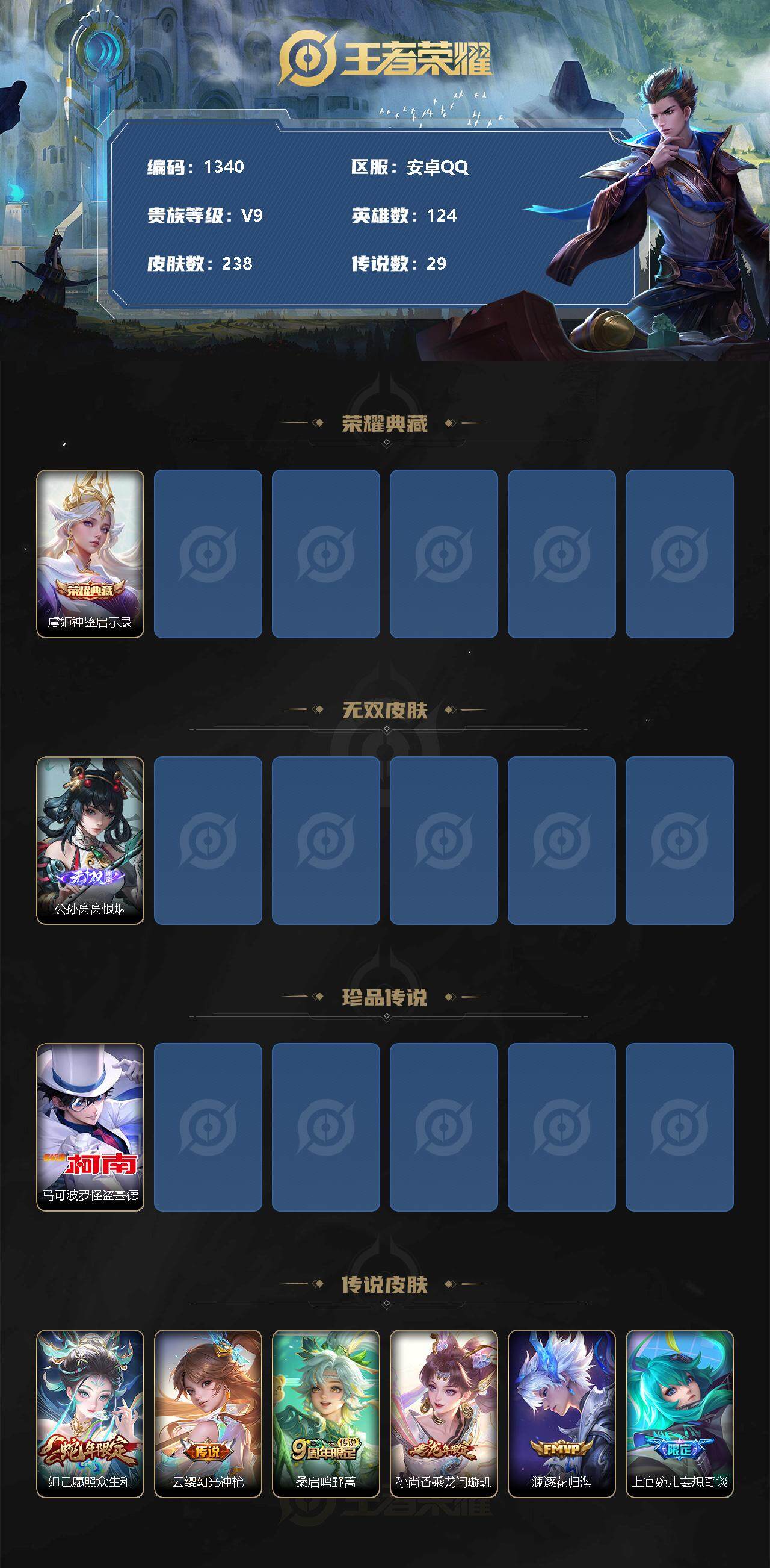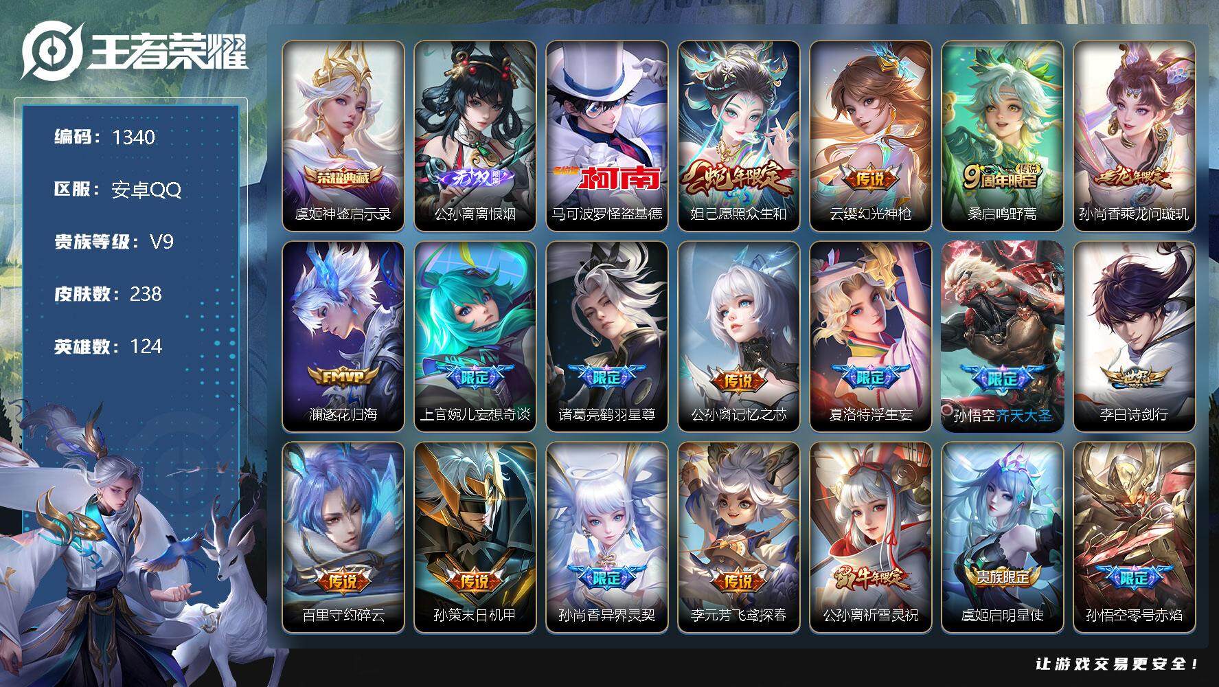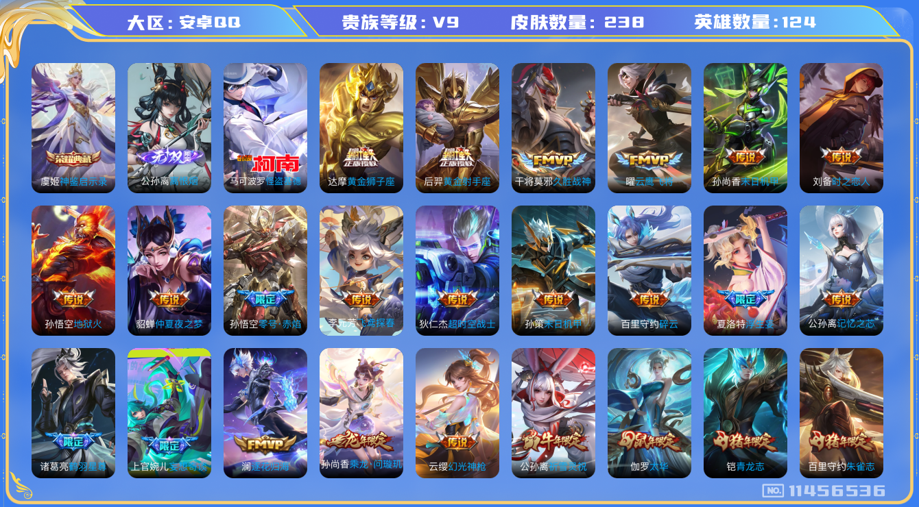 [11456536]【商品标题】:安卓Q-V9-最强王者段位-124英雄-238皮肤-1典藏-0珍品无双-1无双-1珍品传说-29传说-62史诗