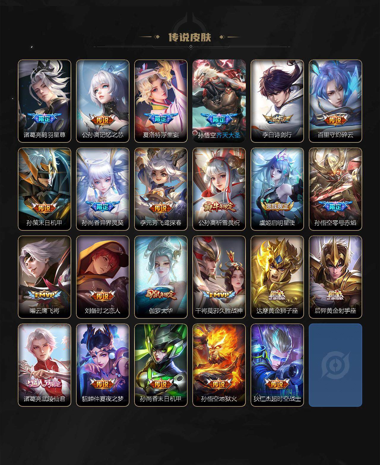 【传说皮肤】:妲己愿照众生和,云缨幻光神枪,桑启鸣野蒿,孙尚香乘龙问璇玑,澜逐花归海,上官婉儿妄想奇谈,诸葛亮鹤羽星尊,公孙离记忆之芯,夏洛特浮生妄,孙悟空齐天大圣,李白诗剑行,百里守约碎云,孙策末日机甲,孙尚香异界灵契,李元芳飞鸢探春,公孙离祈雪灵祝,虞姬启明星使,孙悟空零号赤焰,曜云鹰飞将,刘备时之恋人,伽罗太华,干将莫邪久胜战神,达摩黄金狮子座,后羿黄金射手座,诸葛亮武陵仙君,貂蝉仲夏夜之梦,孙尚香末日机甲,孙悟空地狱火,狄仁杰超时空战士