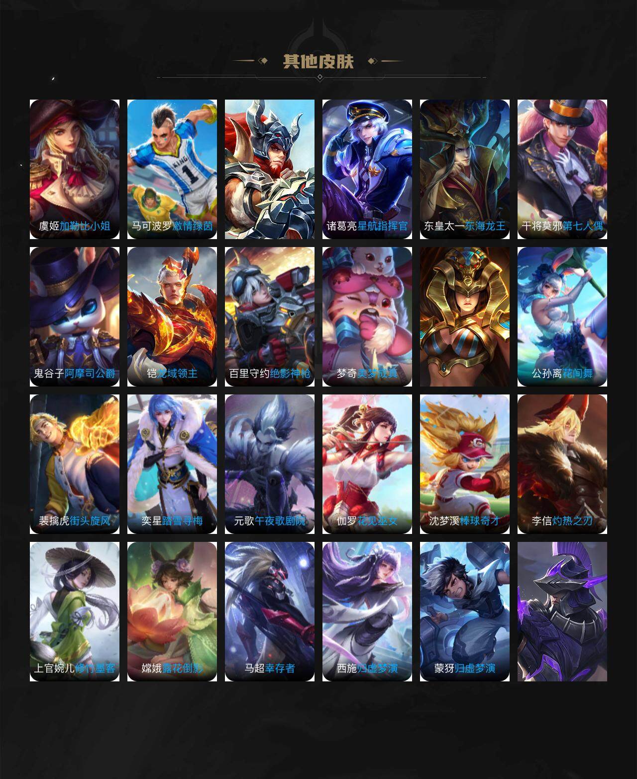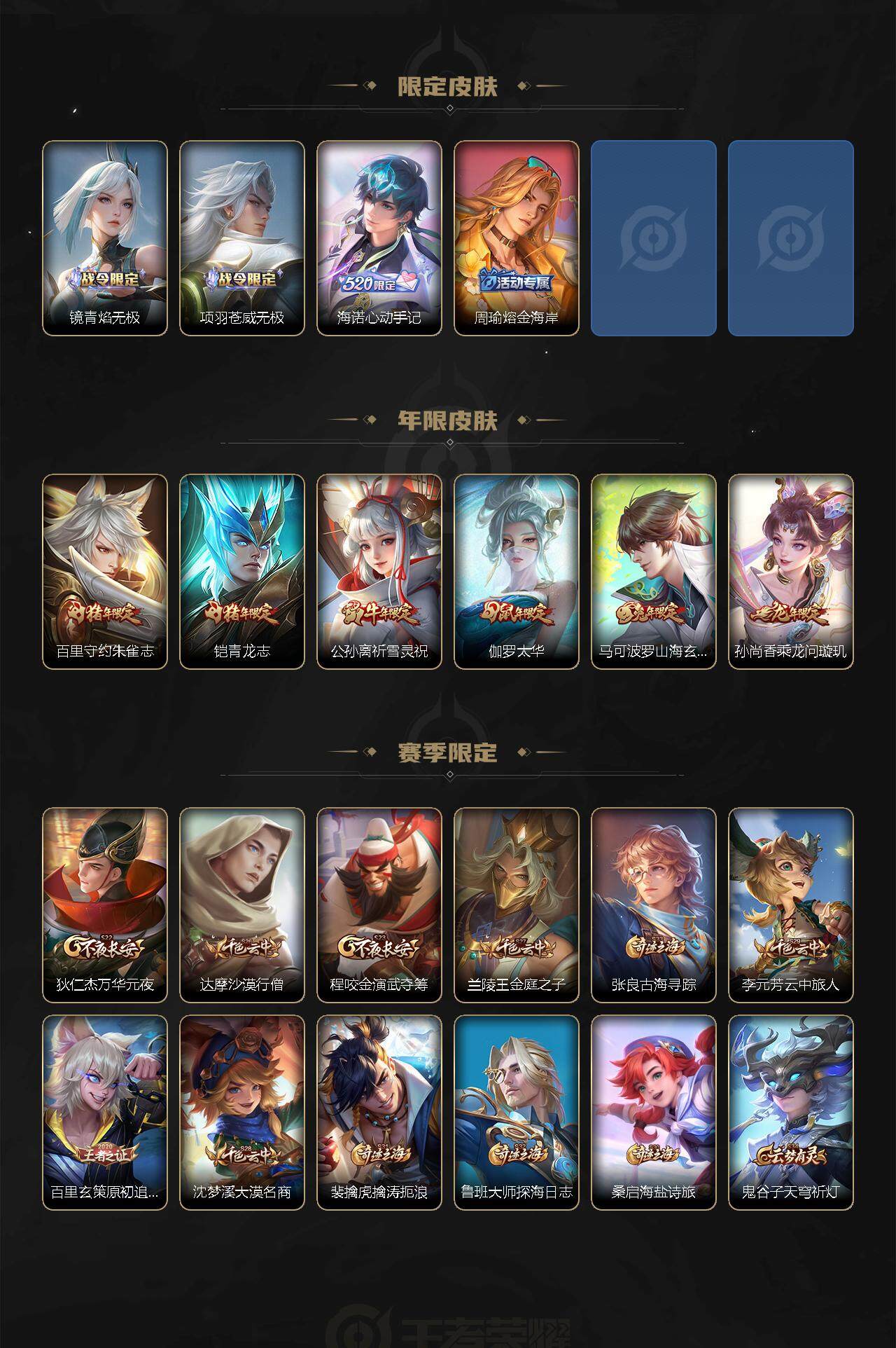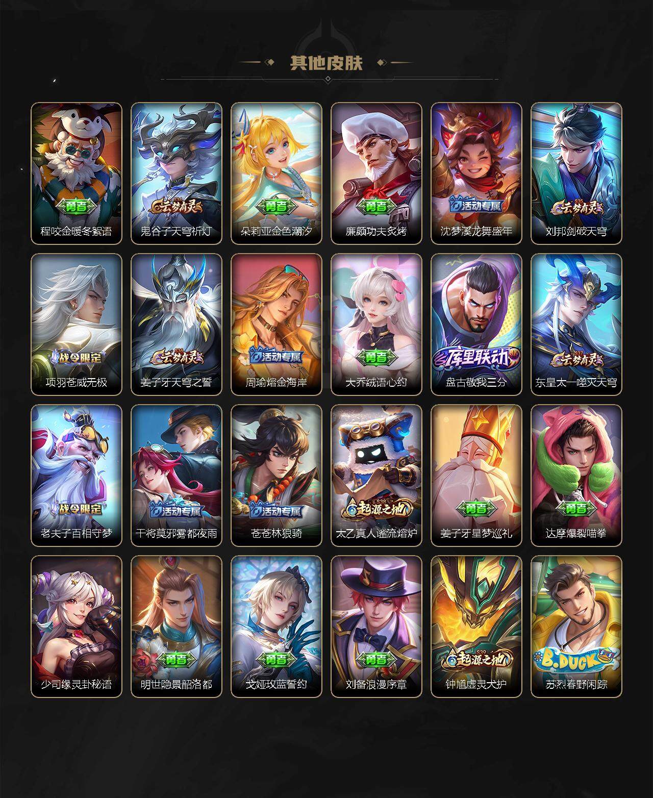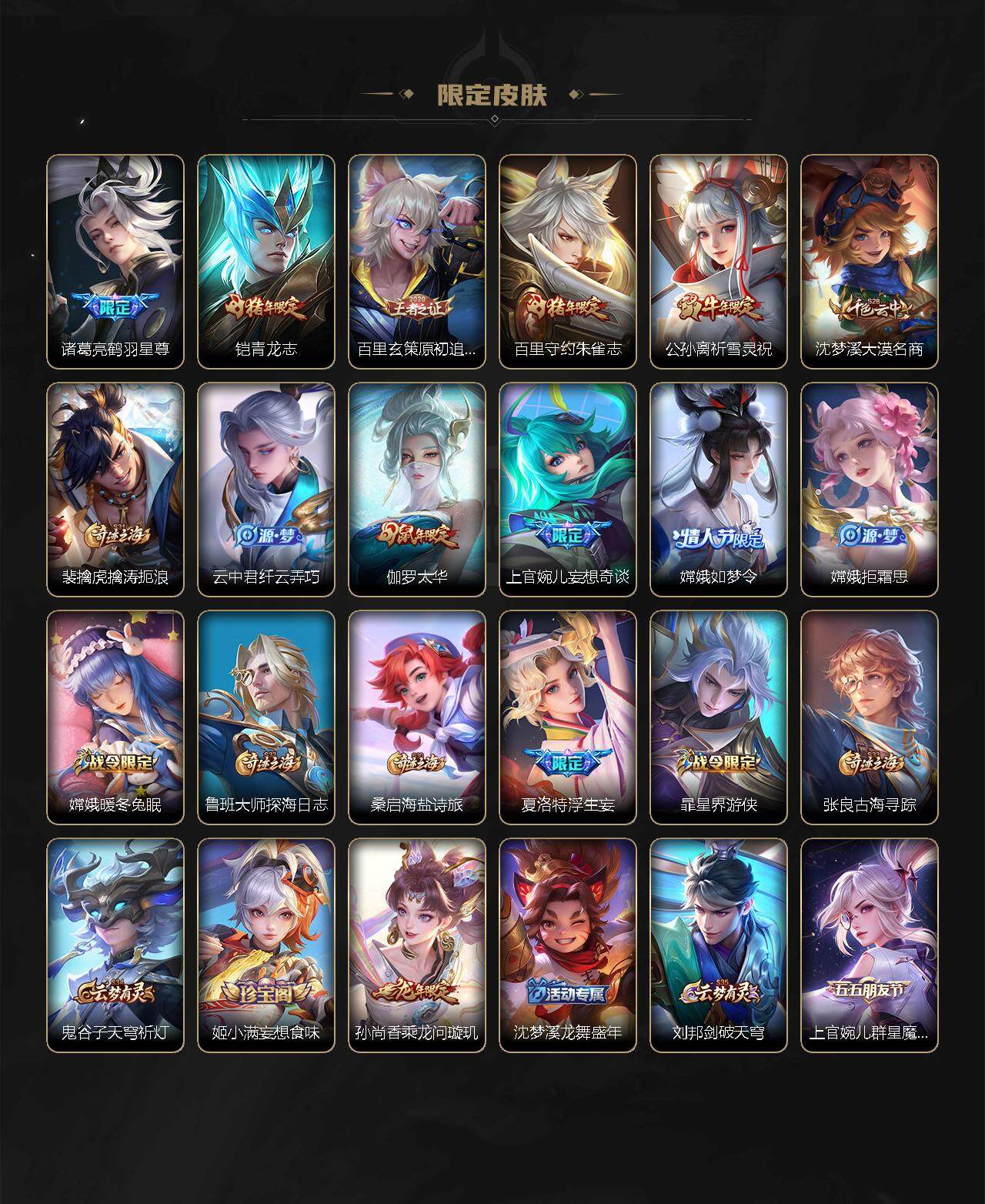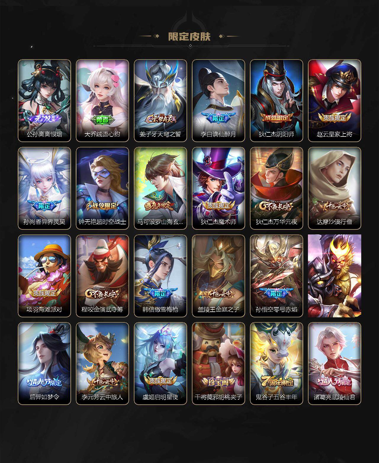 【限定皮肤】:公孙离离恨烟,大乔绒语心约,姜子牙天穹之誓,李白谪仙醉月,狄仁杰阴阳师,赵云皇家上将,孙尚香异界灵契,钟无艳超时空战士,马可波罗山海玄木吟,狄仁杰魔术师,狄仁杰万华元夜,达摩沙漠行僧,项羽海滩派对,程咬金演武夺筹,韩信傲雪梅枪,兰陵王金庭之子,孙悟空零号赤焰,孙悟空齐天大圣,后羿如梦令,李元芳云中旅人,虞姬启明星使,干将莫邪胡桃夹子,鬼谷子五谷丰年,诸葛亮武陵仙君,诸葛亮鹤羽星尊,铠青龙志,百里玄策原初追逐者,百里守约朱雀志,公孙离祈雪灵祝,沈梦溪大漠名商,裴擒虎擒涛扼浪,云中君纤云弄巧,伽罗太华,上官婉儿妄想奇谈,嫦娥如梦令,嫦娥拒霜思,嫦娥暖冬兔眠,鲁班大师探海日志,桑启海盐诗旅,夏洛特浮生妄,暃星界游侠,张良古海寻踪,鬼谷子天穹祈灯,姬小满妄想食味,孙尚香乘龙问璇玑,沈梦溪龙舞盛年,刘邦剑破天穹,上官婉儿群星魔术团,镜青焰无极,项羽苍威无极,海诺心动手记,周瑜熔金海岸