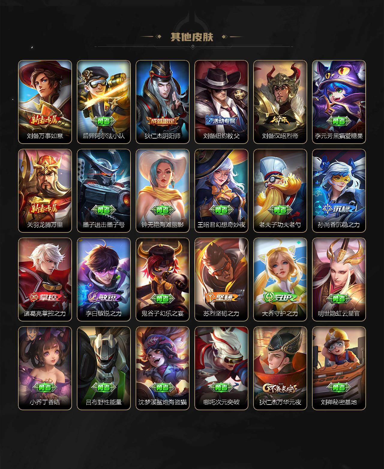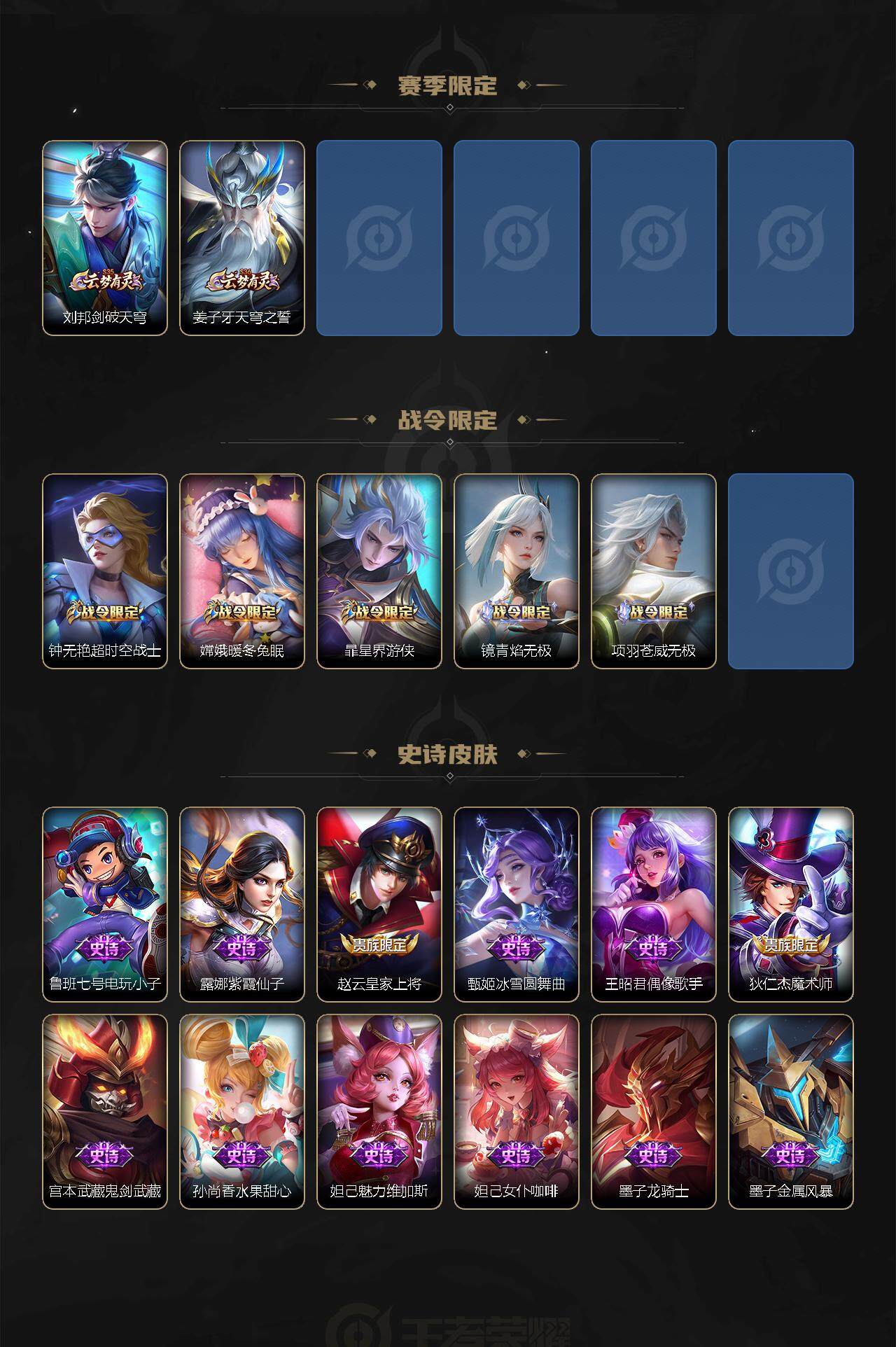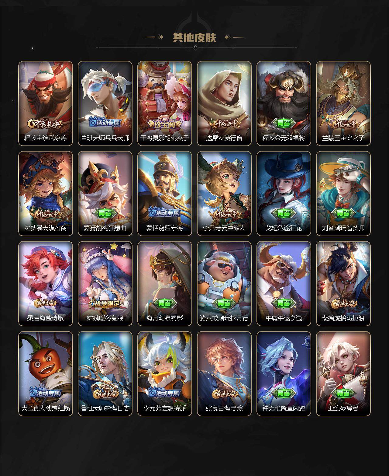 【赛季限定】:狄仁杰万华元夜,达摩沙漠行僧,程咬金演武夺筹,兰陵王金庭之子,张良古海寻踪,李元芳云中旅人,百里玄策原初追逐者,沈梦溪大漠名商,裴擒虎擒涛扼浪,鲁班大师探海日志,桑启海盐诗旅,鬼谷子天穹祈灯,刘邦剑破天穹,姜子牙天穹之誓