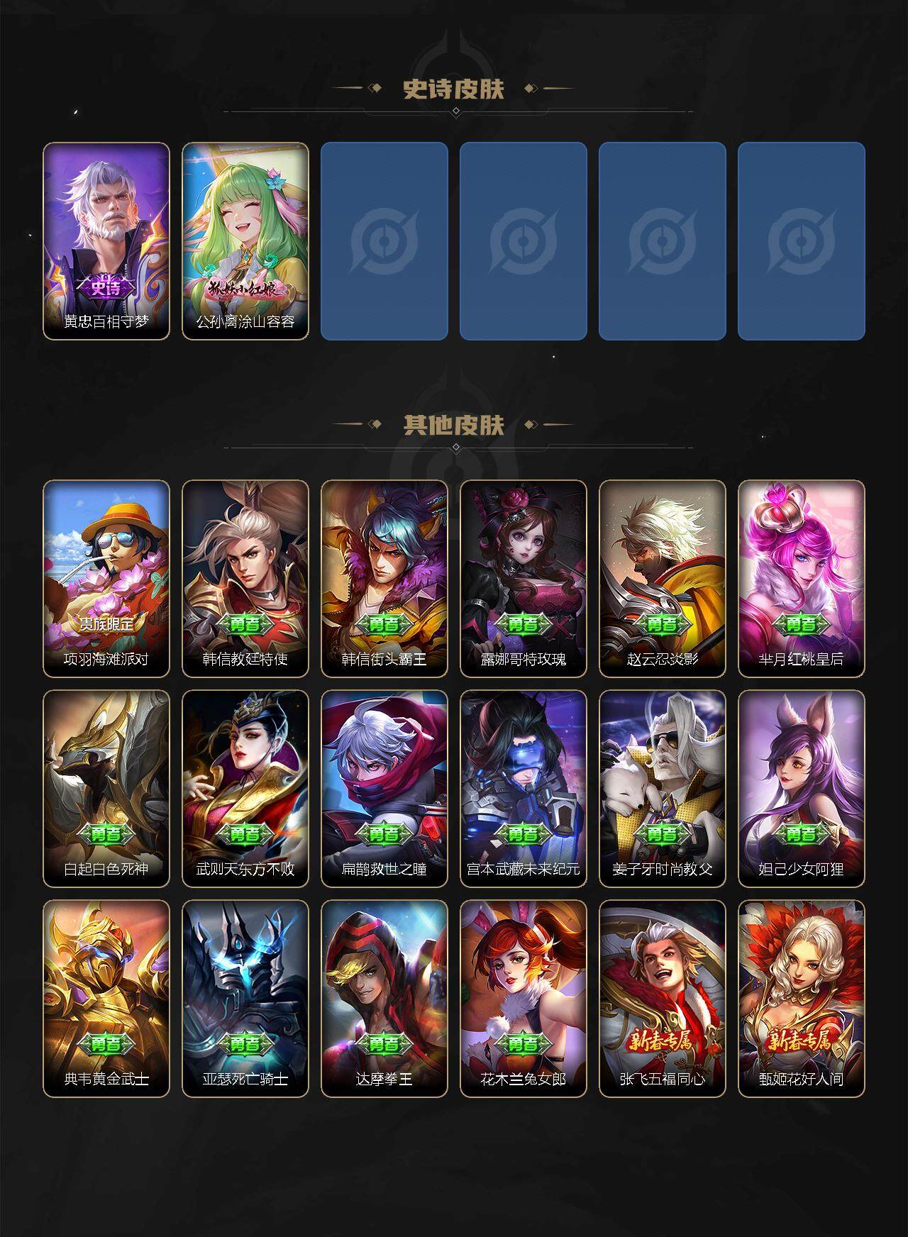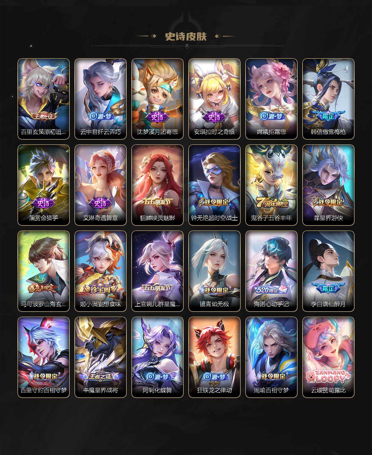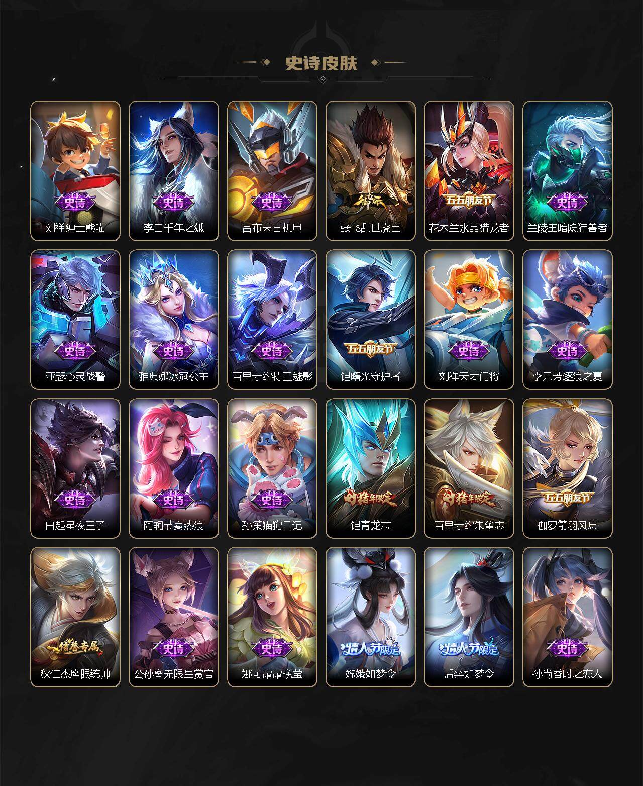【史诗皮肤】:鲁班七号电玩小子,露娜紫霞仙子,赵云皇家上将,甄姬冰雪圆舞曲,王昭君偶像歌手,狄仁杰魔术师,宫