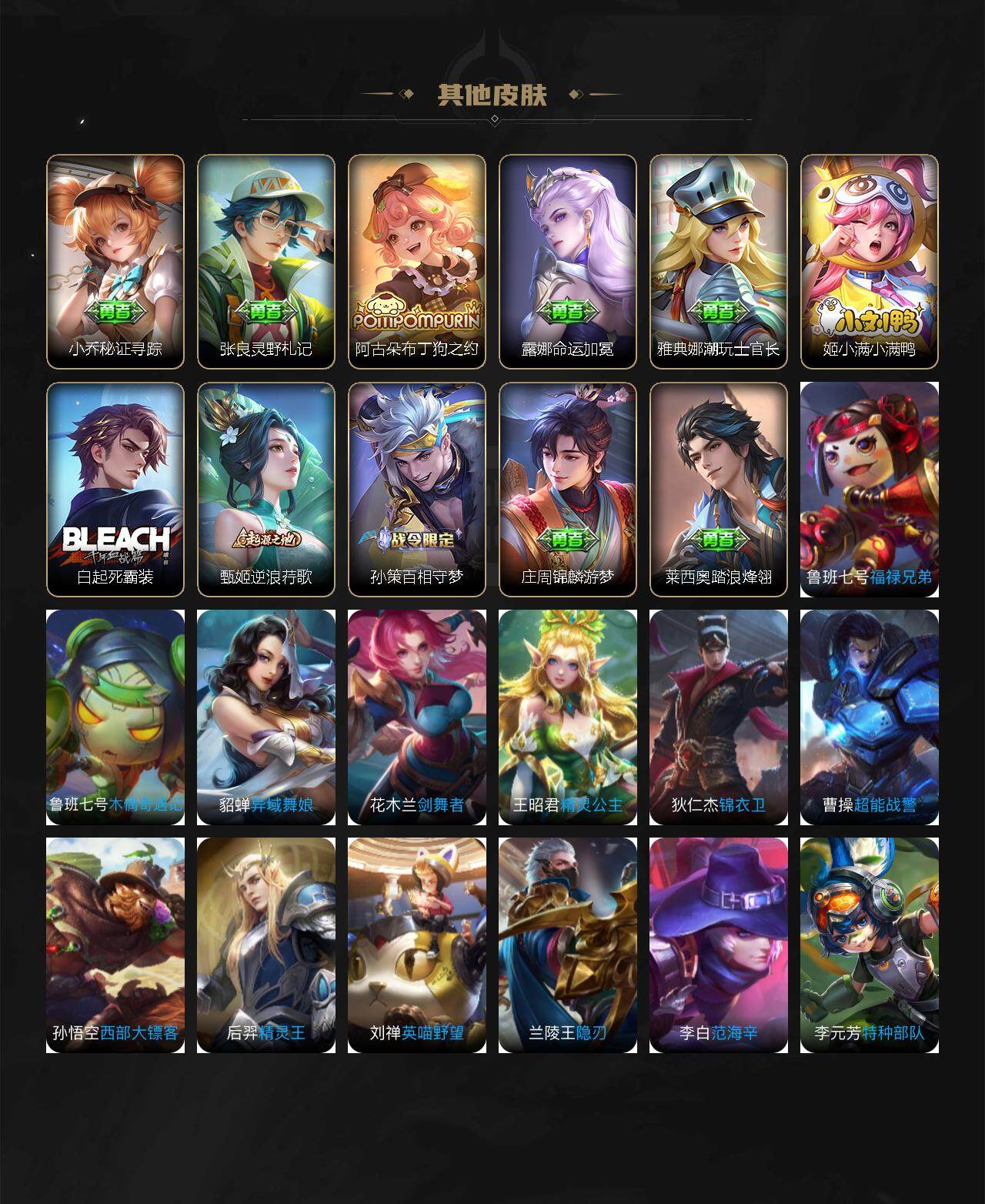 娜可露露晚萤,伽罗箭羽风息,李元芳逐浪之夏,公孙离无限星赏官,孙策猫狗日记,阿轲节奏热浪,露娜紫霞仙子,王昭君偶像歌手,孙尚香时之恋人,雅典娜冰冠公主,吕布末日机甲,鲁班七号电玩小子,墨子龙骑士,刘禅绅士熊喵,刘禅天才门将,白起星夜王子,安琪拉时之奇旅,兰陵王暗隐猎兽者,宫本武藏鬼剑武藏,亚瑟心灵战警,花木兰水晶猎龙者,铠曙光守护者,墨子金属风暴,百里玄策原初追逐者,百里守约特工魅影,嫦娥拒霜思,李白千年之狐,澜赏金猎手,艾琳奇遇舞章,貂蝉唤灵魅影,上官婉儿群星魔术团,海诺心动手记,李白谪仙醉月