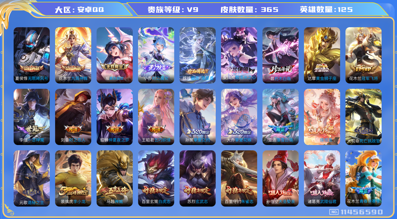 [11456590]【商品标题】:安卓Q-V9-最强王者段位-125英雄-365皮肤-2典藏-0珍品无双-2无双-3珍品传说-23传说-110史诗