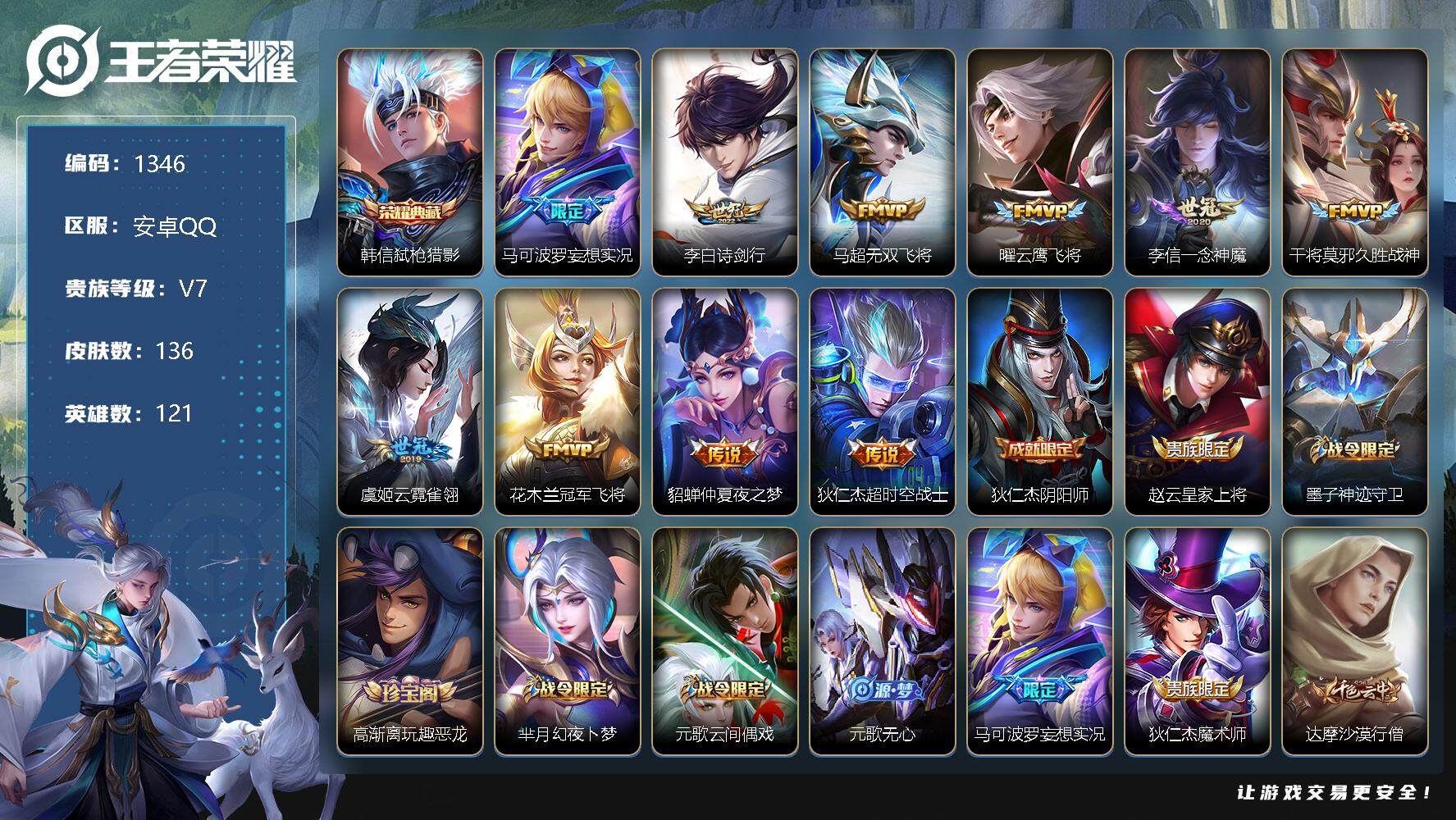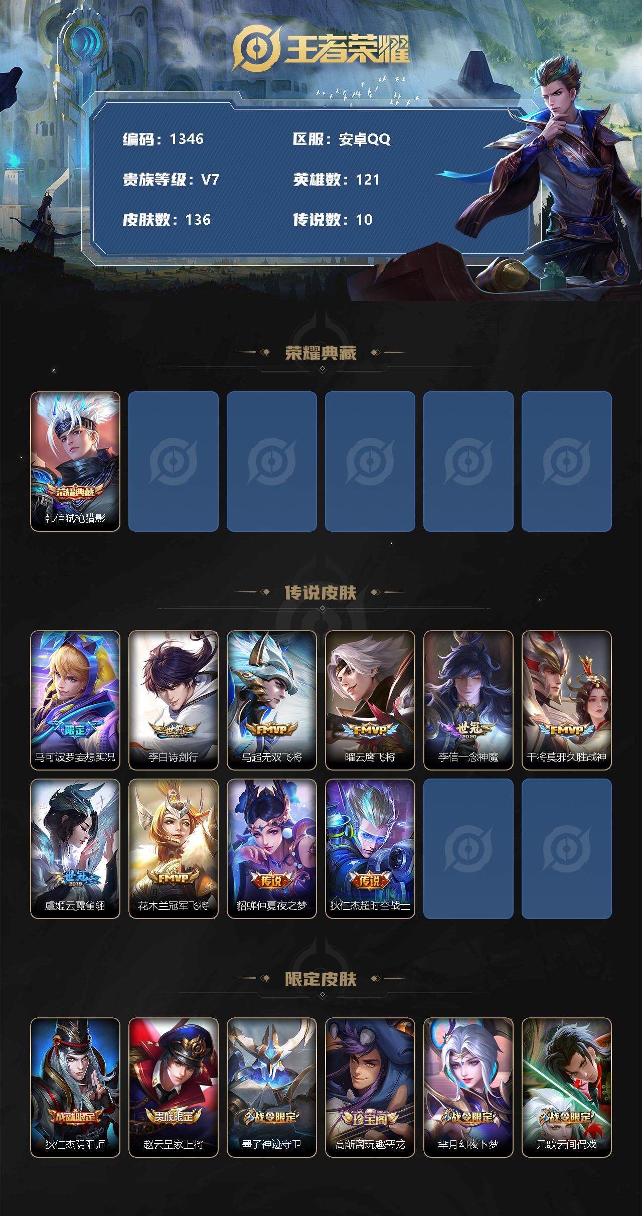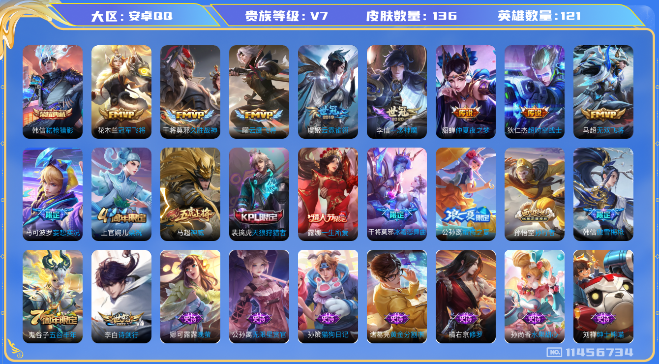 [11456734]【商品标题】:安卓Q-V7-秩序白银I段位-121英雄-136皮肤-1典藏-0珍品无双-0无双-0珍品传说-10传说-41史诗