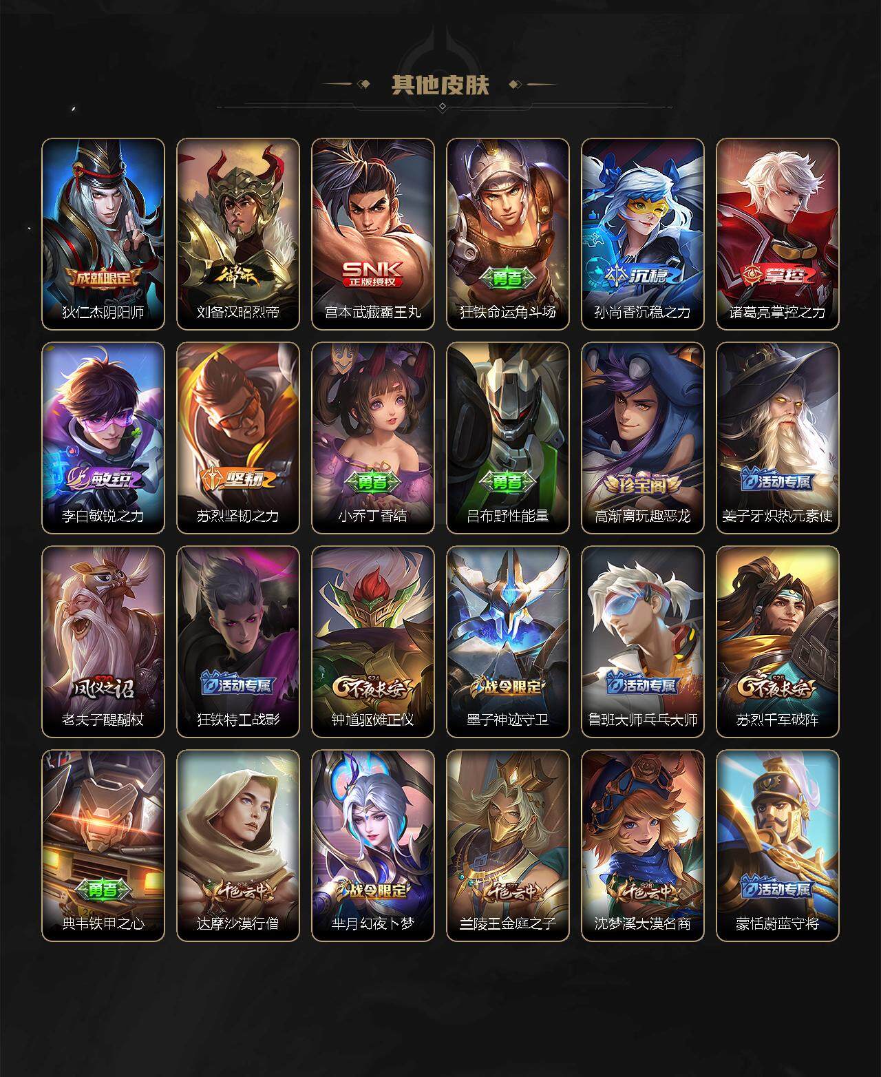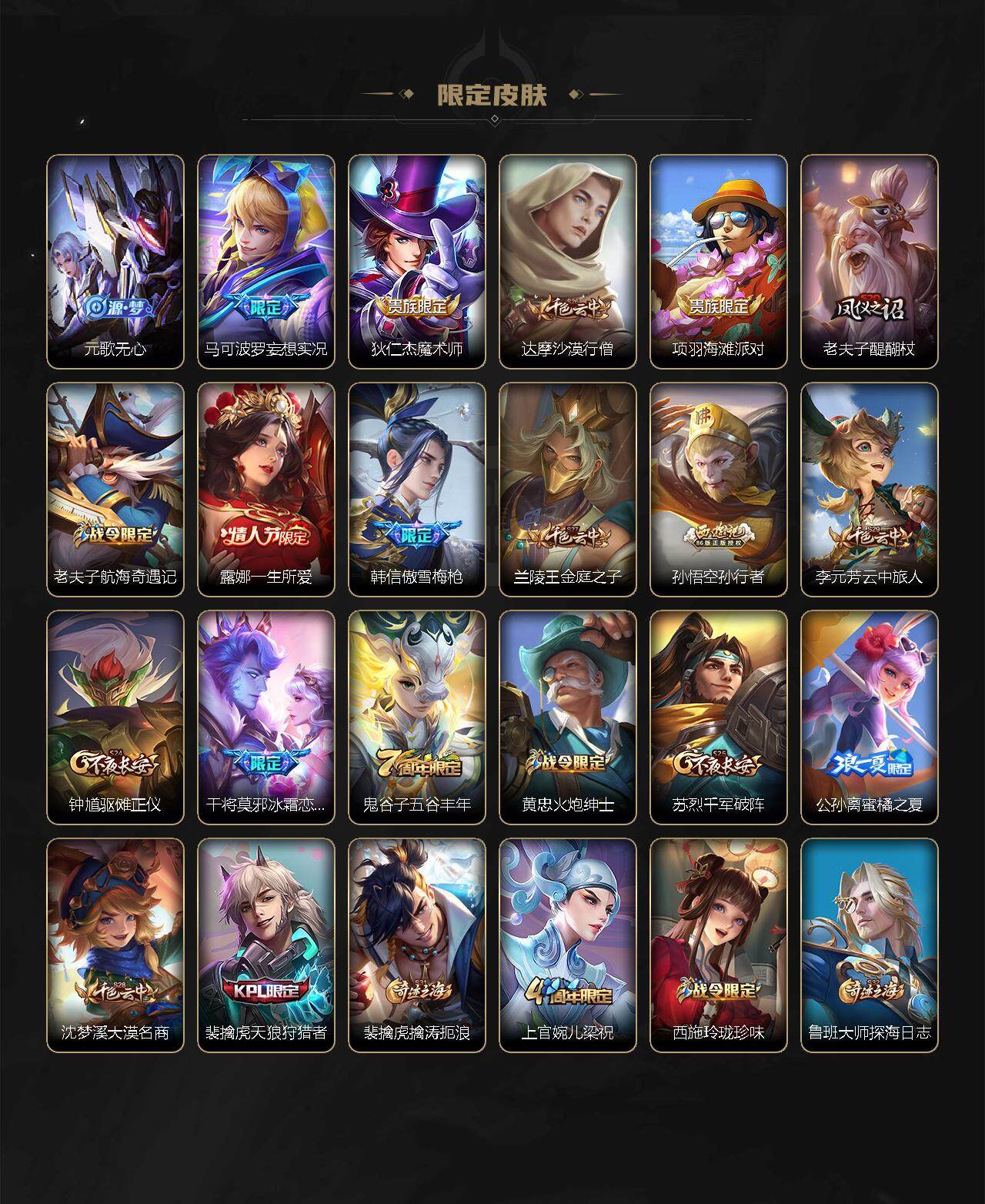 【限定皮肤】:狄仁杰阴阳师,赵云皇家上将,墨子神迹守卫,高渐离玩趣恶龙,芈月幻夜卜梦,元歌云间偶戏,元歌无心,马可波罗妄想实况,狄仁杰魔术师,达摩沙漠行僧,项羽海滩派对,老夫子醍醐杖,老夫子航海奇遇记,露娜一生所爱,韩信傲雪梅枪,兰陵王金庭之子,孙悟空孙行者,李元芳云中旅人,钟馗驱傩正仪,干将莫邪冰霜恋舞曲,鬼谷子五谷丰年,黄忠火炮绅士,苏烈千军破阵,公孙离蜜橘之夏,沈梦溪大漠名商,裴擒虎天狼狩猎者,裴擒虎擒涛扼浪,上官婉儿梁祝,西施玲珑珍味,鲁班大师探海日志,戈娅驭风魔法,艾琳流音漫舞,司空震地狱燃心,阿古朵江河有灵,张良古海寻踪,蒙犽百解令,鬼谷子天穹祈灯,沈梦溪龙舞盛年,刘邦剑破天穹