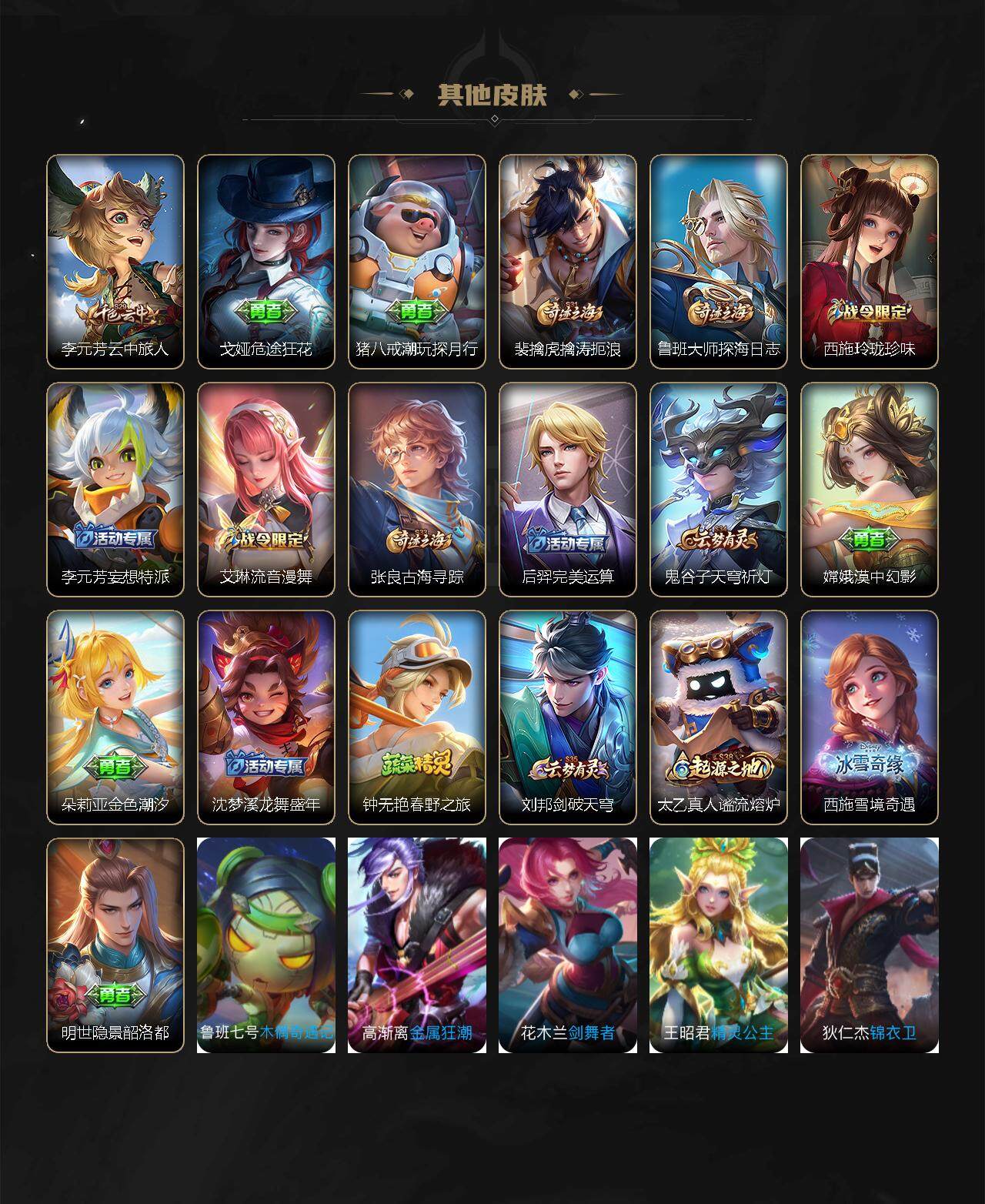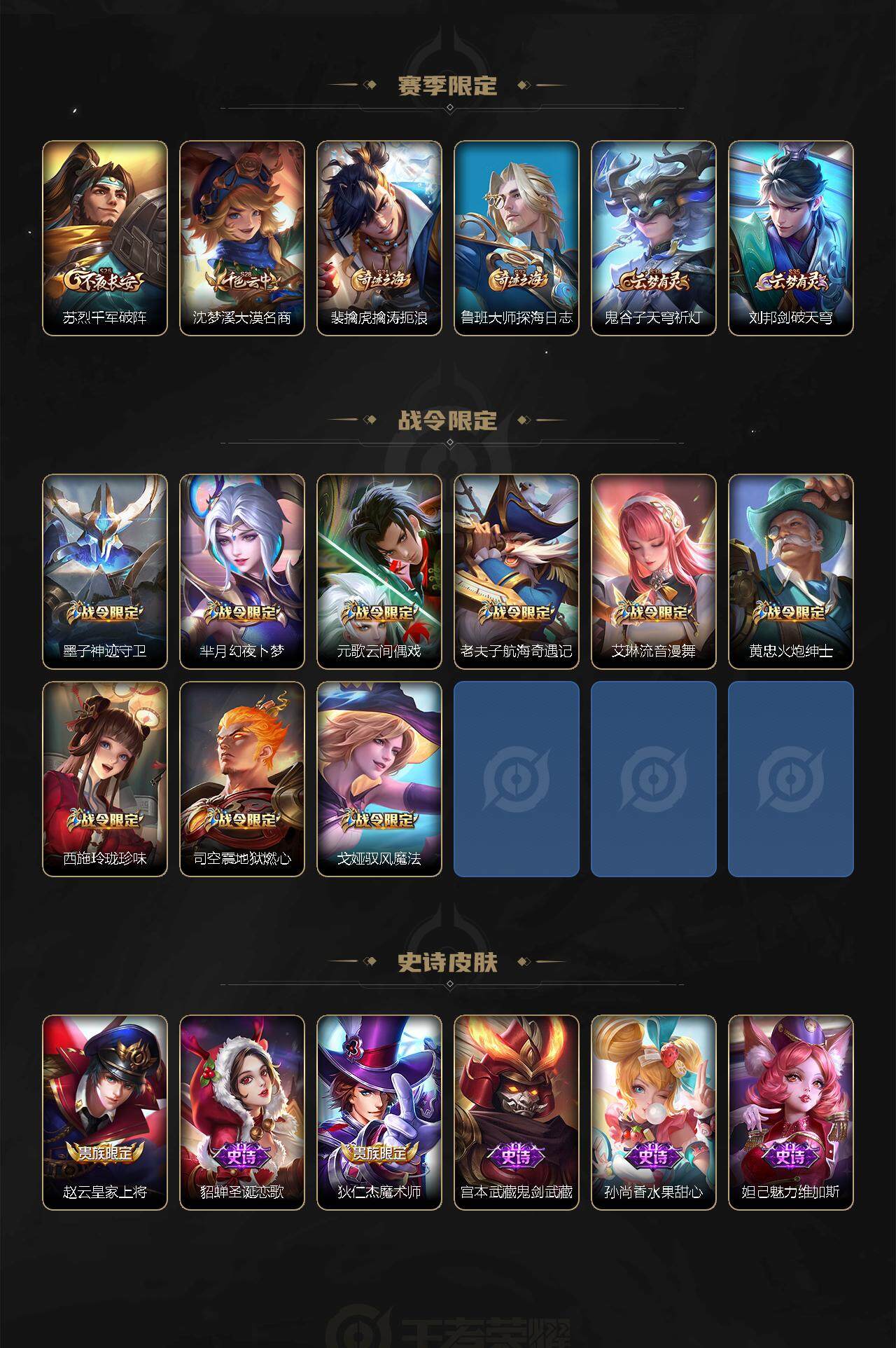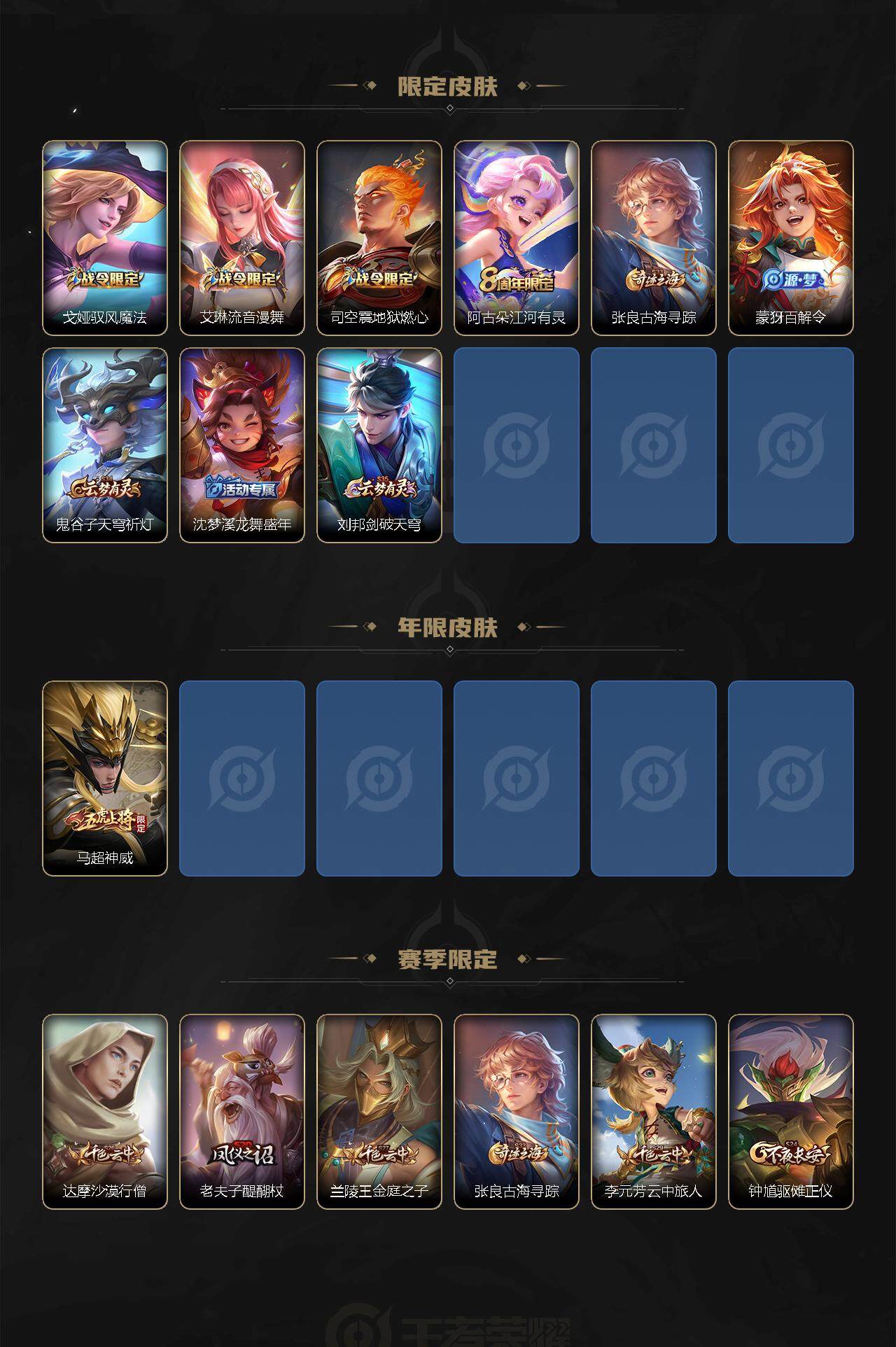 【赛季限定】:达摩沙漠行僧,老夫子醍醐杖,兰陵王金庭之子,张良古海寻踪,李元芳云中旅人,钟馗驱傩正仪,苏烈千军破阵,沈梦溪大漠名商,裴擒虎擒涛扼浪,鲁班大师探海日志,鬼谷子天穹祈灯,刘邦剑破天穹