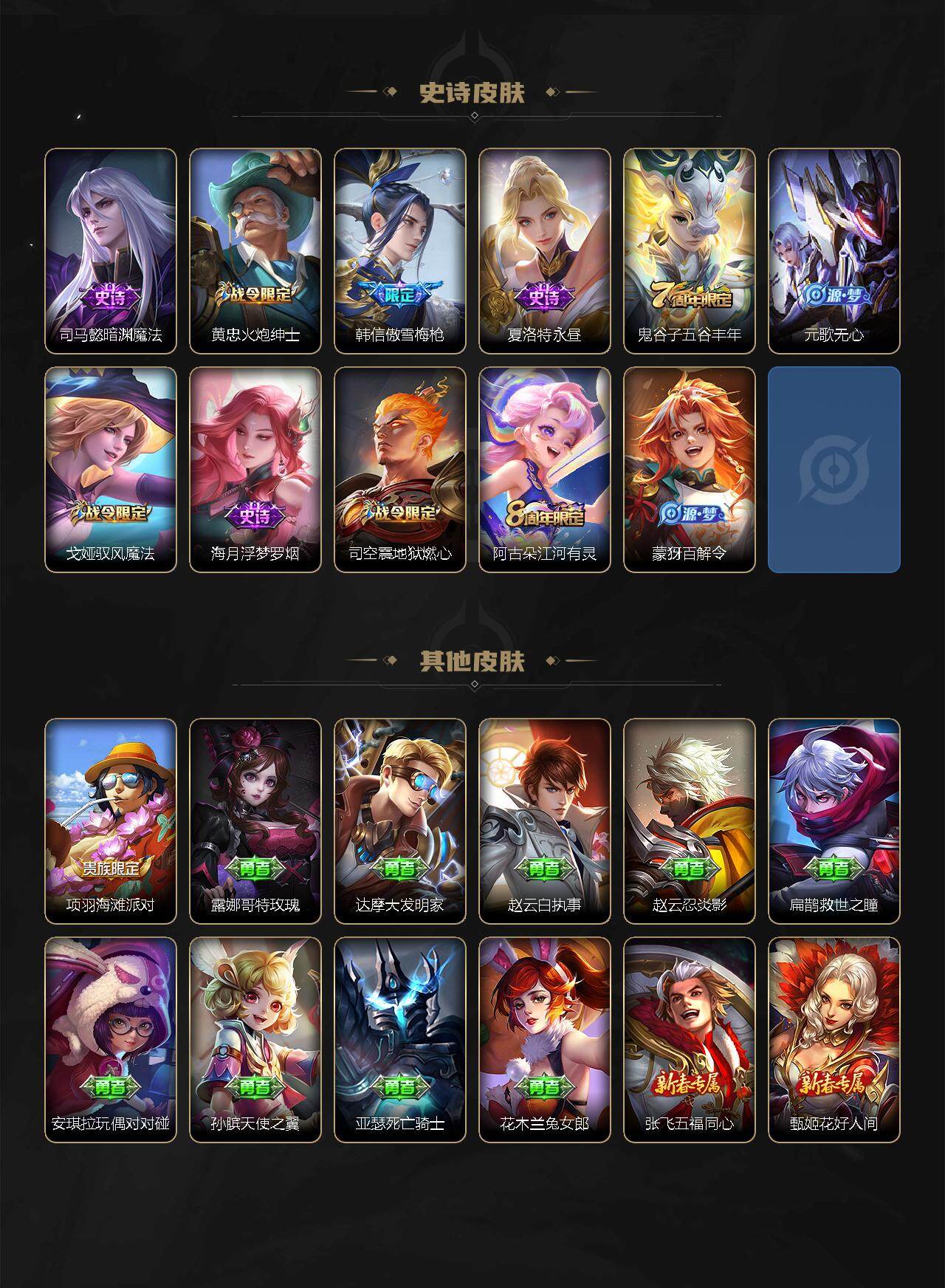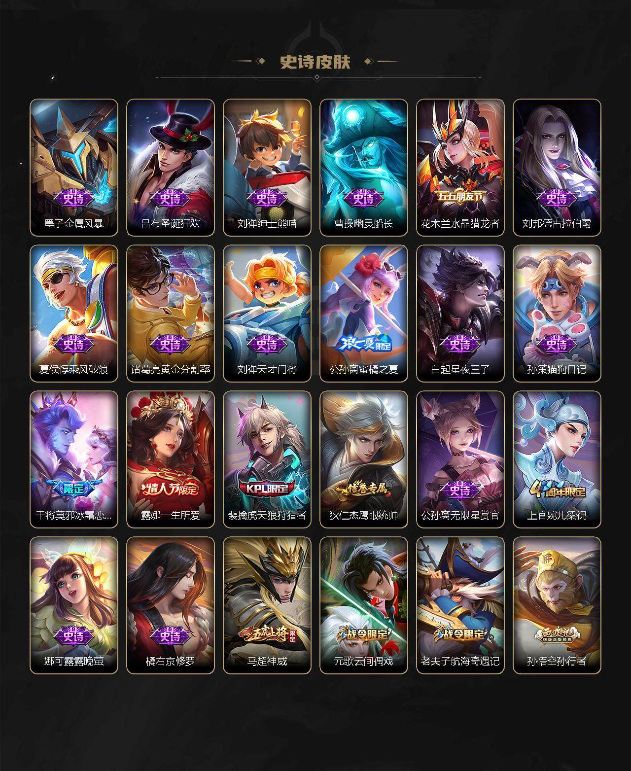 【史诗皮肤】:赵云皇家上将,貂蝉圣诞恋歌,狄仁杰魔术师,宫本武藏鬼剑武藏,孙尚香水果甜心,妲己魅力维加斯,墨子金属风暴,吕布圣诞狂欢,刘禅绅士熊喵,曹操幽灵船长,花木兰水晶猎龙者,刘邦德古拉伯爵,夏侯惇乘风破浪,诸葛亮黄金分割率,刘禅天才门将,公孙离蜜橘之夏,白起星夜王子,孙策猫狗日记,干将莫邪冰霜恋舞曲,露娜一生所爱,裴擒虎天狼狩猎者,狄仁杰鹰眼统帅,公孙离无限星赏官,上官婉儿梁祝,娜可露露晚萤,橘右京修罗,马超神威,元歌云间偶戏,老夫子航海奇遇记,孙悟空孙行者,司马懿暗渊魔法,黄忠火炮绅士,韩信傲雪梅枪,夏洛特永昼,鬼谷子五谷丰年,元歌无心,戈娅驭风魔法,海月浮梦罗烟,司空震地狱燃心,阿古朵江河有灵,蒙犽百解令
