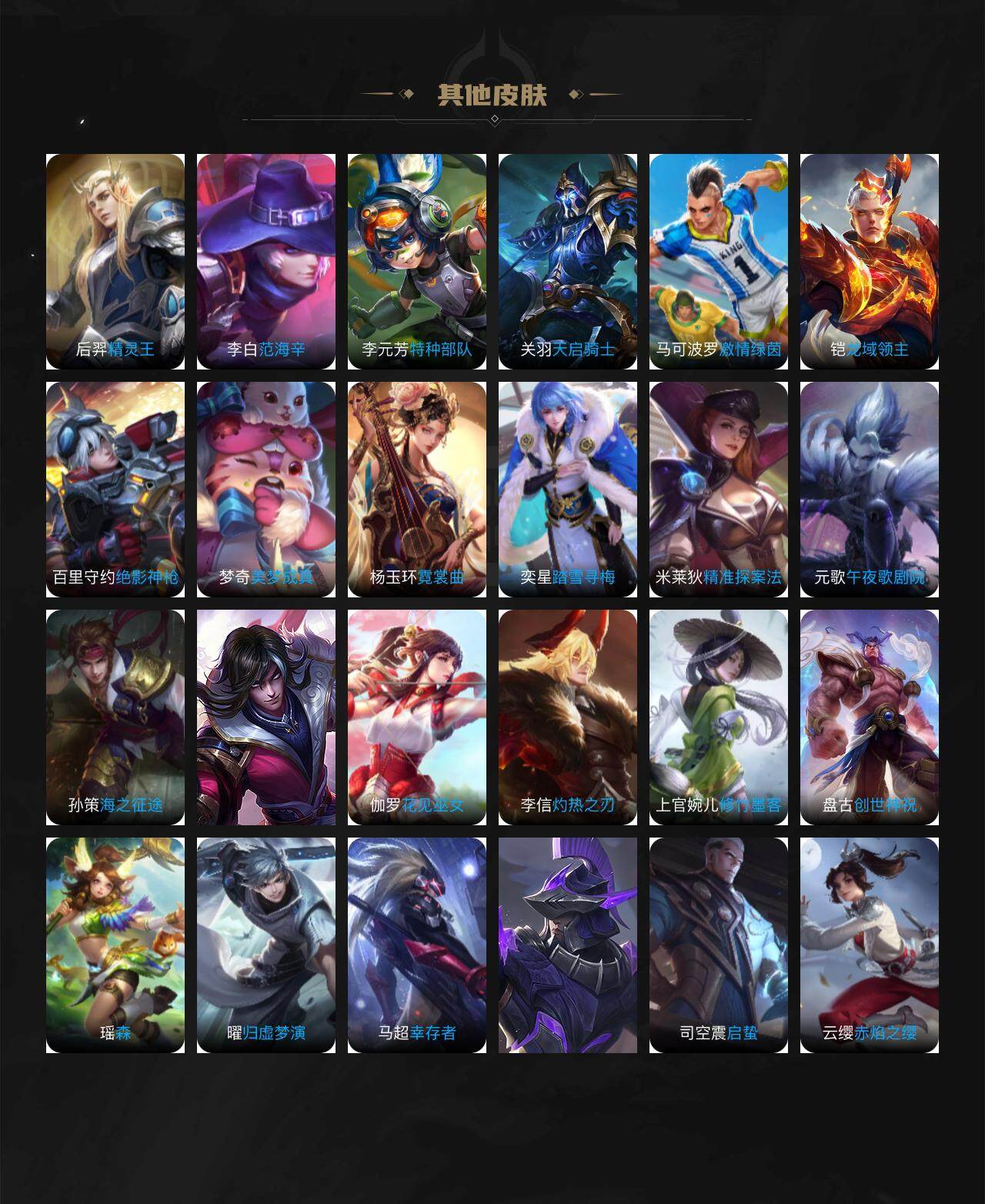 娜可露露晚萤,公孙离无限星赏官,孙策猫狗日记,诸葛亮黄金分割率,橘右京修罗,刘禅绅士熊喵,刘禅天才门将,白起星夜王子,刘邦德古拉伯爵,曹操幽灵船长,宫本武藏鬼剑武藏,司马懿暗渊魔法,夏侯惇乘风破浪,花木兰水晶猎龙者,墨子金属风暴,吕布圣诞狂欢,貂蝉圣诞恋歌,夏洛特永昼,海月浮梦罗烟,蒙犽百解令