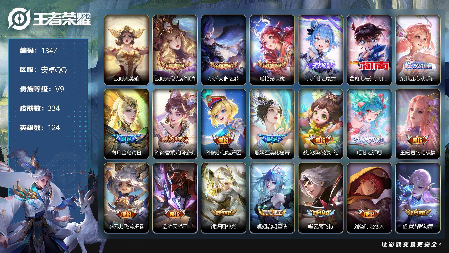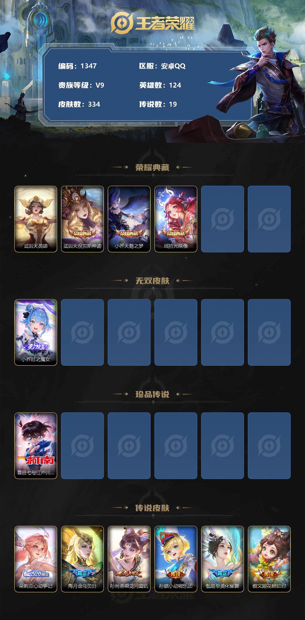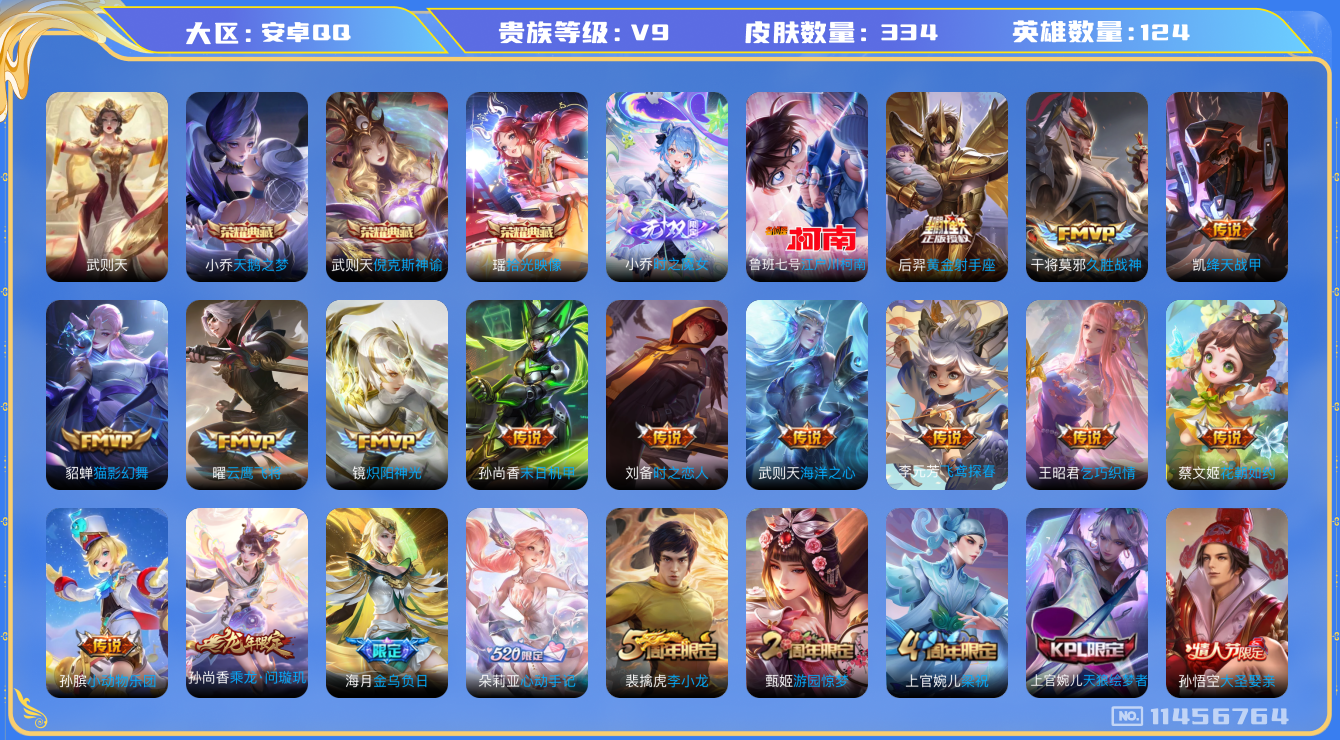 [11456764]【商品标题】:安卓Q-V4-荣耀黄金I段位-124英雄-334皮肤-3典藏-0珍品无双-1无双-1珍品传说-19传说-109史诗
