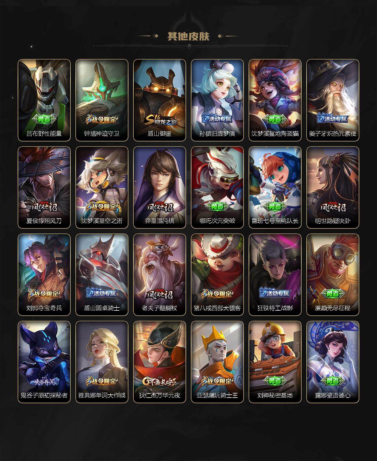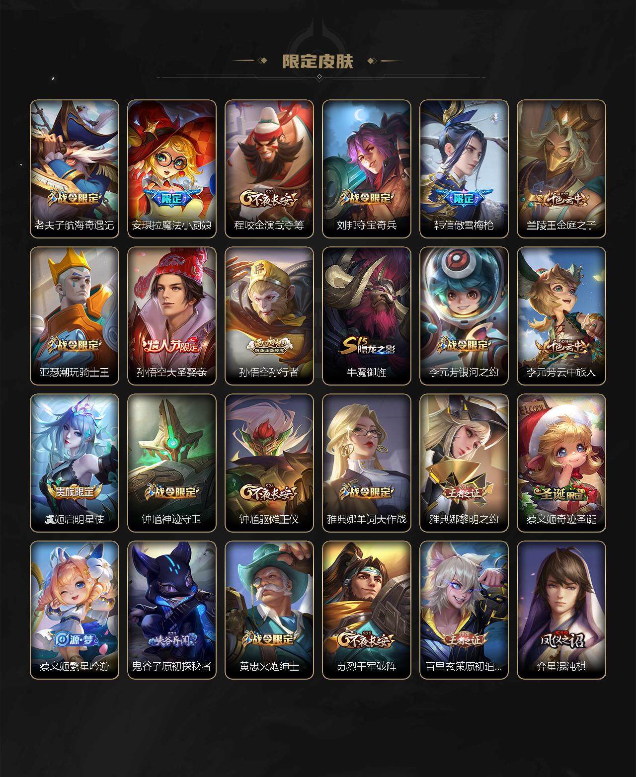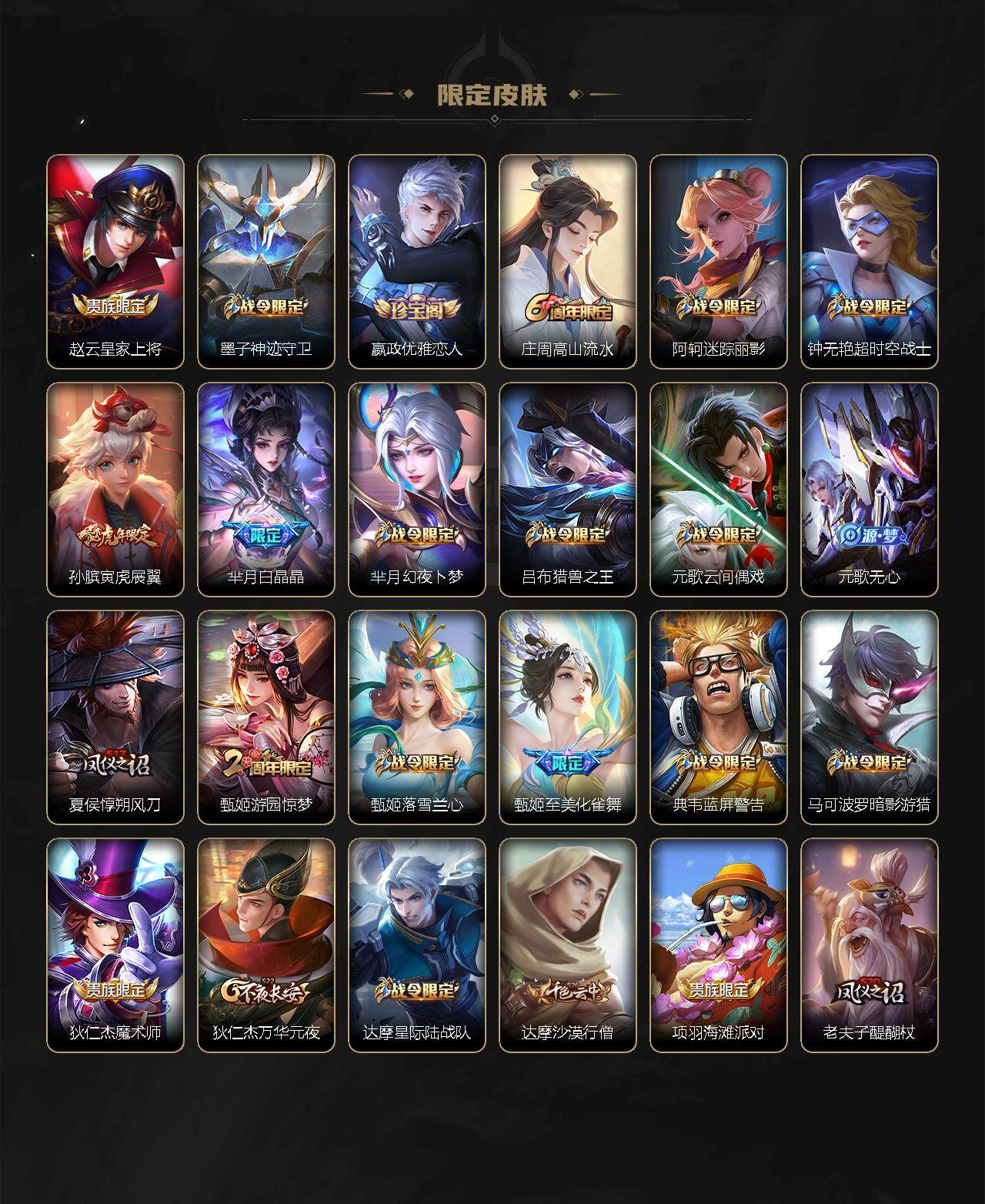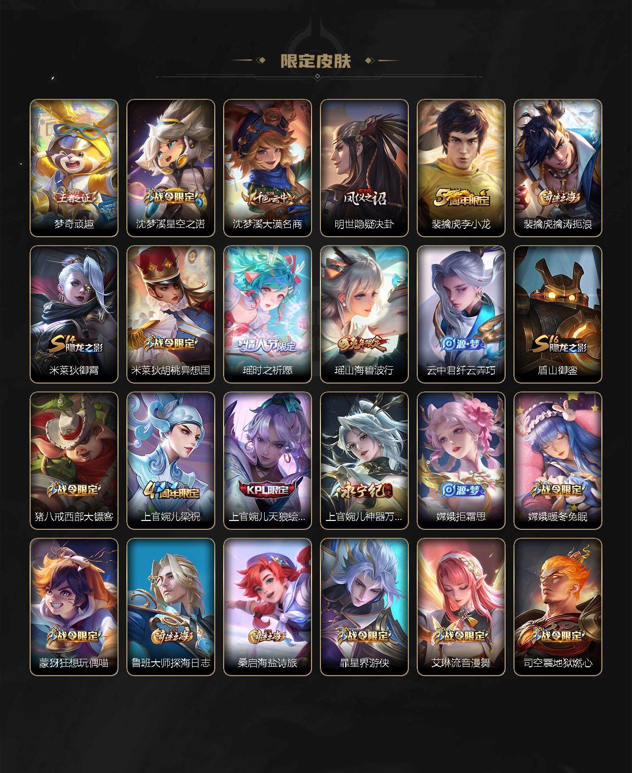 【限定皮肤】:暃埋骨钱,蔡文姬夏日便利店,大乔绒语心约,虞姬夏日便利店,姜子牙天穹之誓,狄仁杰阴阳师,赵云皇家上将,墨子神迹守卫,嬴政优雅恋人,庄周高山流水,阿轲迷踪丽影,钟无艳超时空战士,孙膑寅虎展翼,芈月白晶晶,芈月幻夜卜梦,吕布猎兽之王,元歌云间偶戏,元歌无心,夏侯惇朔风刀,甄姬游园惊梦,甄姬落雪兰心,甄姬至美化雀舞,典韦蓝屏警告,马可波罗暗影游猎,狄仁杰魔术师,狄仁杰万华元夜,达摩星际陆战队,达摩沙漠行僧,项羽海滩派对,老夫子醍醐杖,老夫子航海奇遇记,安琪拉魔法小厨娘,程咬金演武夺筹,刘邦夺宝奇兵,韩信傲雪梅枪,兰陵王金庭之子,亚瑟潮玩骑士王,孙悟空大圣娶亲,孙悟空孙行者,牛魔御旌,李元芳银河之约,李元芳云中旅人,虞姬启明星使,钟馗神迹守卫,钟馗驱傩正仪,雅典娜单词大作战,雅典娜黎明之约,蔡文姬奇迹圣诞,蔡文姬繁星吟游,鬼谷子原初探秘者,黄忠火炮绅士,苏烈千军破阵,百里玄策原初追逐者,弈星混沌棋,梦奇顽趣,沈梦溪星空之诺,沈梦溪大漠名商,明世隐疑决卦,裴擒虎李小龙,裴擒虎擒涛扼浪,米莱狄御霄,米莱狄胡桃异想国,瑶时之祈愿,瑶山海碧波行,云中君纤云弄巧,盾山御銮,猪八戒西部大镖客,上官婉儿梁祝,上官婉儿天狼绘梦者,上官婉儿神器万象笔,嫦娥拒霜思,嫦娥暖冬兔眠,蒙犽狂想玩偶喵,鲁班大师探海日志,桑启海盐诗旅,暃星界游侠,艾琳流音漫舞,司空震地狱燃心,阿古朵江河有灵,张良古海寻踪,蒙犽百解令,蒙恬荣光圣徽,高渐离燃音魔法,妲己灵卜魔法,鬼谷子天穹祈灯,伽罗琥珀纪元,姬小满妄想食味,小乔时之魔女,大乔乘龙忆丹青,安琪拉乘龙聚宝船,孙尚香乘龙问璇玑,沈梦溪龙舞盛年,曹操夜都魔契,鲁班七号蔬乡物语,李元芳蔬乡物语,海月