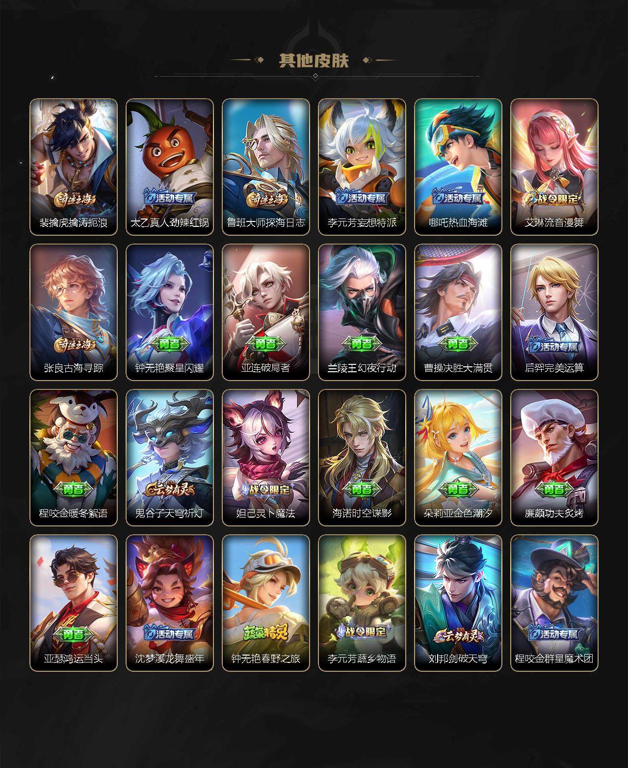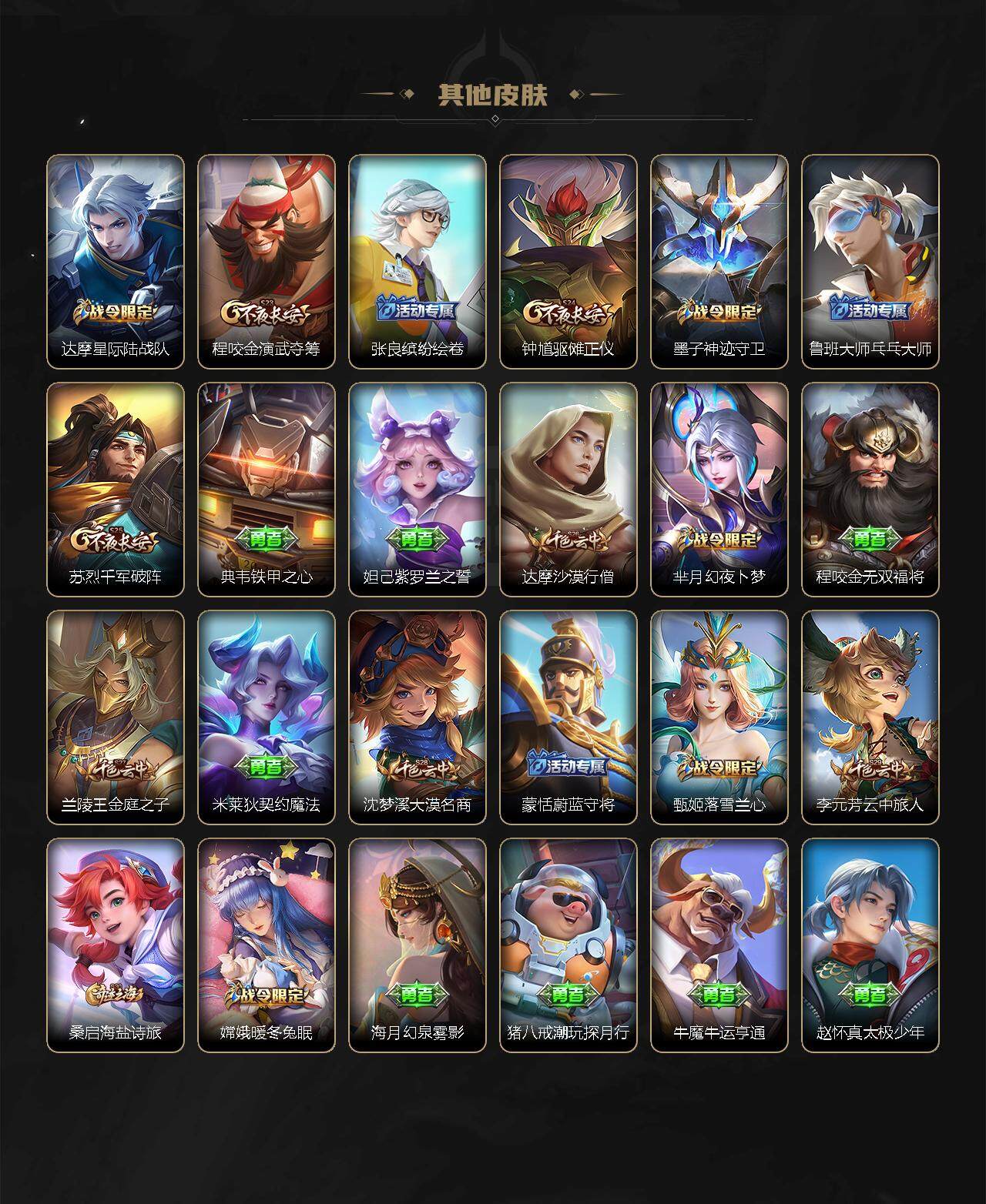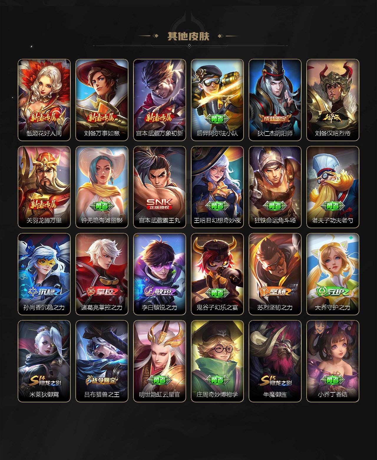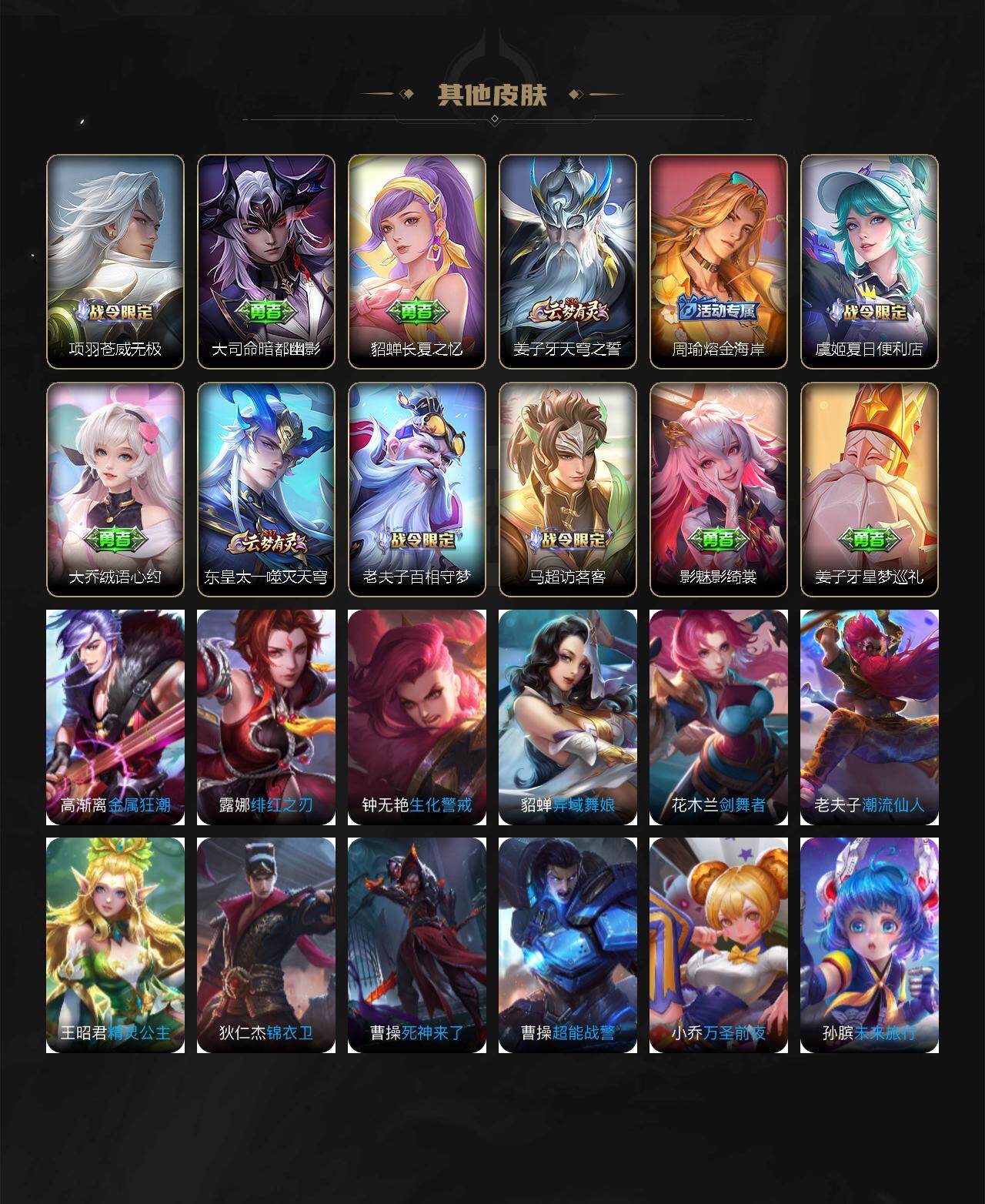 【限定皮肤】:暃埋骨钱,蔡文姬夏日便利店,大乔绒语心约,虞姬夏日便利店,姜子牙天穹之誓,狄仁杰阴阳师,赵云皇家上将,墨子神迹守卫,嬴政优雅恋人,庄周高山流水,阿轲迷踪丽影,钟无艳超时空战士,孙膑寅虎展翼,芈月白晶晶,芈月幻夜卜梦,吕布猎兽之王,元歌云间偶戏,元歌无心,夏侯惇朔风刀,甄姬游园惊梦,甄姬落雪兰心,甄姬至美化雀舞,典韦蓝屏警告,马可波罗暗影游猎,狄仁杰魔术师,狄仁杰万华元夜,达摩星际陆战队,达摩沙漠行僧,项羽海滩派对,老夫子醍醐杖,老夫子航海奇遇记,安琪拉魔法小厨娘,程咬金演武夺筹,刘邦夺宝奇兵,韩信傲雪梅枪,兰陵王金庭之子,亚瑟潮玩骑士王,孙悟空大圣娶亲,孙悟空孙行者,牛魔御旌,李元芳银河之约,李元芳云中旅人,虞姬启明星使,钟馗神迹守卫,钟馗驱傩正仪,雅典娜单词大作战,雅典娜黎明之约,蔡文姬奇迹圣诞,蔡文姬繁星吟游,鬼谷子原初探秘者,黄忠火炮绅士,苏烈千军破阵,百里玄策原初追逐者,弈星混沌棋,梦奇顽趣,沈梦溪星空之诺,沈梦溪大漠名商,明世隐疑决卦,裴擒虎李小龙,裴擒虎擒涛扼浪,米莱狄御霄,米莱狄胡桃异想国,瑶时之祈愿,瑶山海碧波行,云中君纤云弄巧,盾山御銮,猪八戒西部大镖客,上官婉儿梁祝,上官婉儿天狼绘梦者,上官婉儿神器万象笔,嫦娥拒霜思,嫦娥暖冬兔眠,蒙犽狂想玩偶喵,鲁班大师探海日志,桑启海盐诗旅,暃星界游侠,艾琳流音漫舞,司空震地狱燃心,阿古朵江河有灵,张良古海寻踪,蒙犽百解令,蒙恬荣光圣徽,高渐离燃音魔法,妲己灵卜魔法,鬼谷子天穹祈灯,伽罗琥珀纪元,姬小满妄想食味,小乔时之魔女,大乔乘龙忆丹青,安琪拉乘龙聚宝船,孙尚香乘龙问璇玑,沈梦溪龙舞盛年,曹操夜都魔契,鲁班七号蔬乡物语,李元芳蔬乡物语,海月