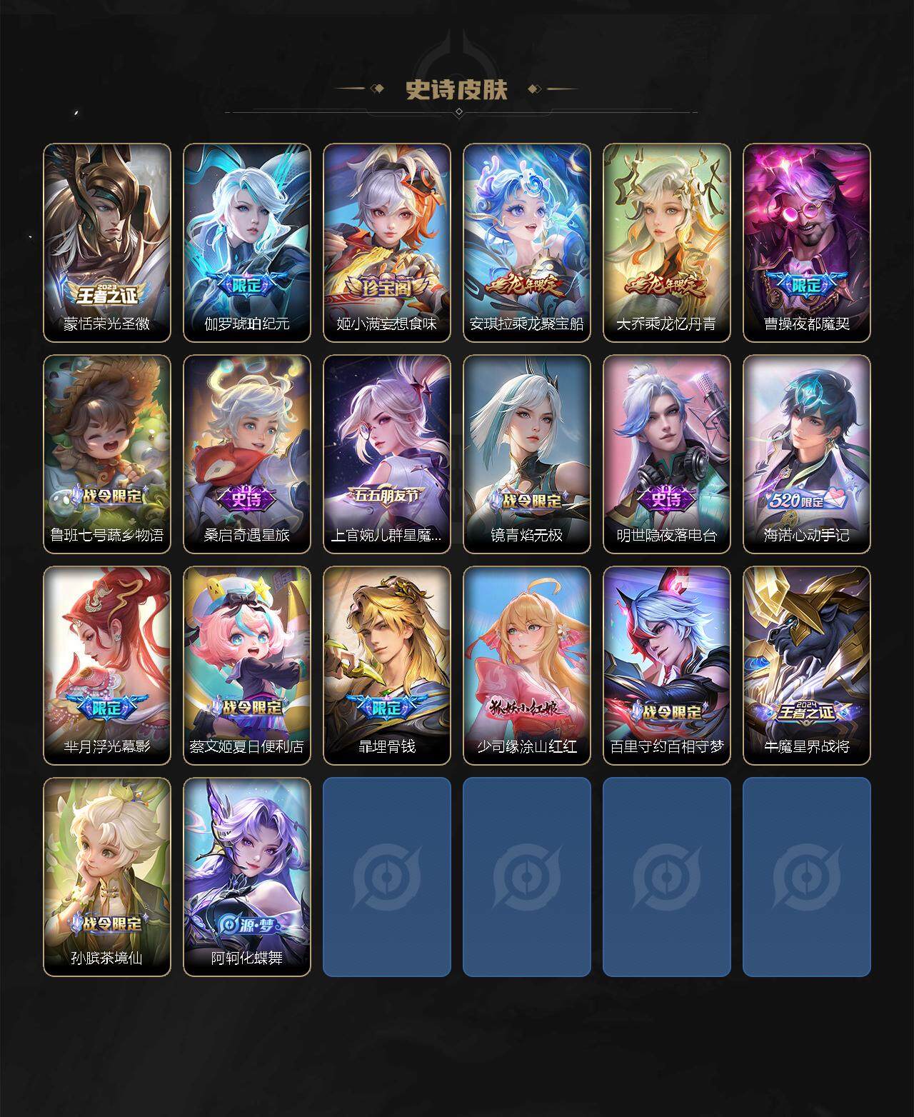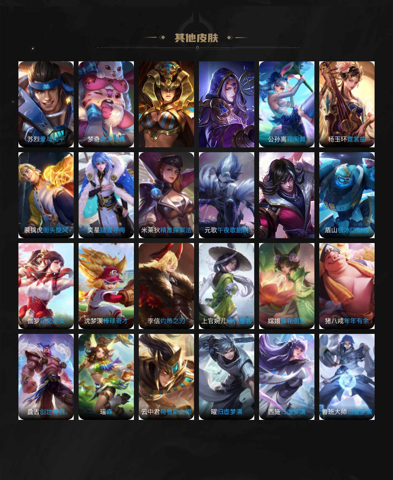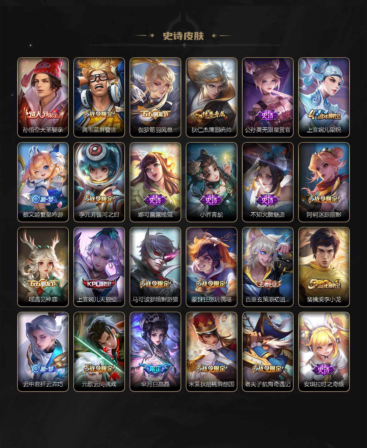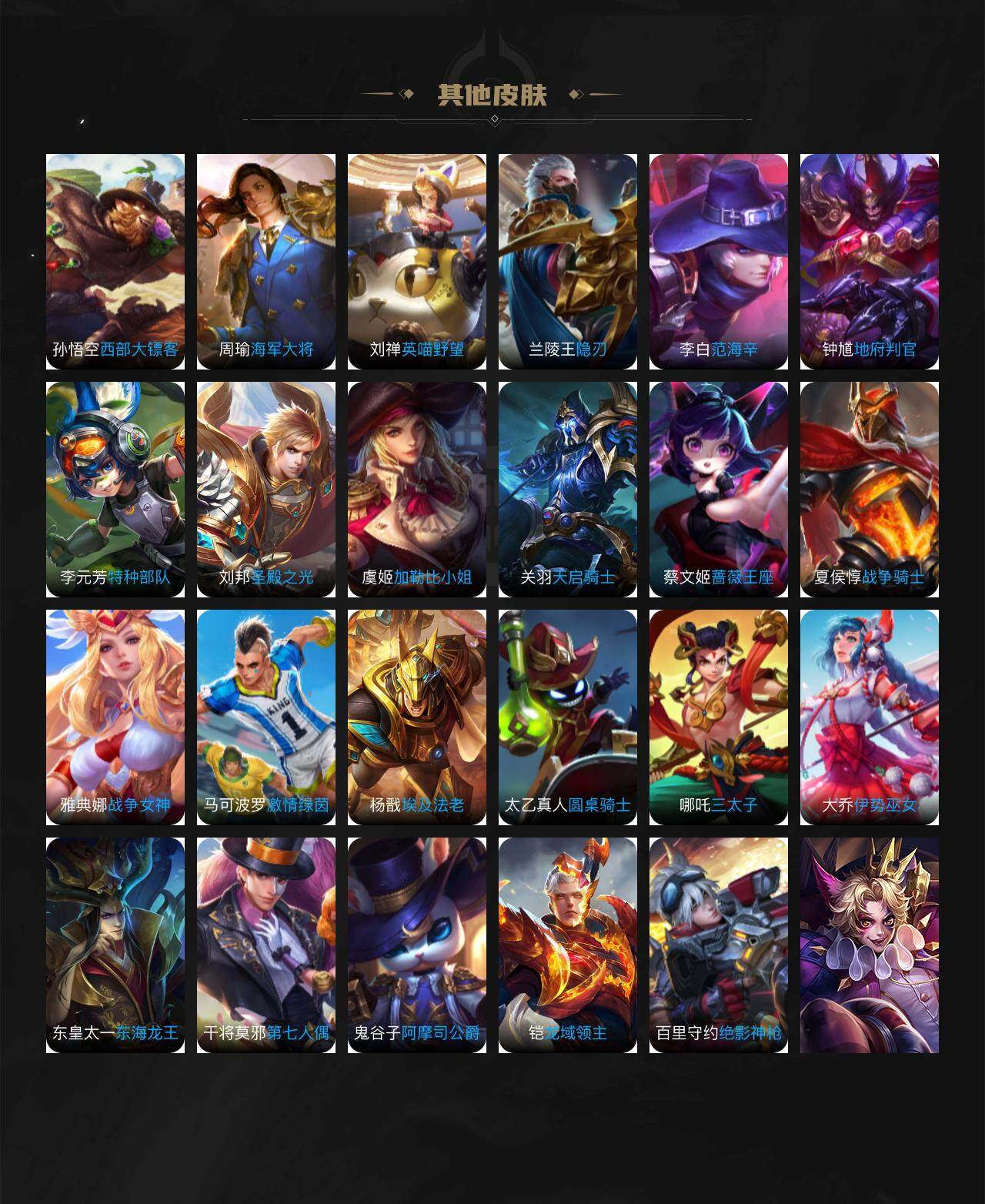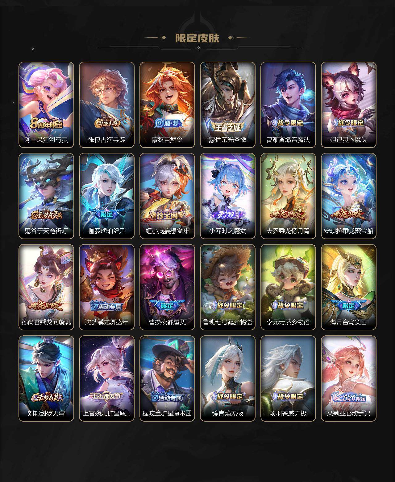 【限定皮肤】:暃埋骨钱,蔡文姬夏日便利店,大乔绒语心约,虞姬夏日便利店,姜子牙天穹之誓,狄仁杰阴阳师,赵云皇家上将,墨子神迹守卫,嬴政优雅恋人,庄周高山流水,阿轲迷踪丽影,钟无艳超时空战士,孙膑寅虎展翼,芈月白晶晶,芈月幻夜卜梦,吕布猎兽之王,元歌云间偶戏,元歌无心,夏侯惇朔风刀,甄姬游园惊梦,甄姬落雪兰心,甄姬至美化雀舞,典韦蓝屏警告,马可波罗暗影游猎,狄仁杰魔术师,狄仁杰万华元夜,达摩星际陆战队,达摩沙漠行僧,项羽海滩派对,老夫子醍醐杖,老夫子航海奇遇记,安琪拉魔法小厨娘,程咬金演武夺筹,刘邦夺宝奇兵,韩信傲雪梅枪,兰陵王金庭之子,亚瑟潮玩骑士王,孙悟空大圣娶亲,孙悟空孙行者,牛魔御旌,李元芳银河之约,李元芳云中旅人,虞姬启明星使,钟馗神迹守卫,钟馗驱傩正仪,雅典娜单词大作战,雅典娜黎明之约,蔡文姬奇迹圣诞,蔡文姬繁星吟游,鬼谷子原初探秘者,黄忠火炮绅士,苏烈千军破阵,百里玄策原初追逐者,弈星混沌棋,梦奇顽趣,沈梦溪星空之诺,沈梦溪大漠名商,明世隐疑决卦,裴擒虎李小龙,裴擒虎擒涛扼浪,米莱狄御霄,米莱狄胡桃异想国,瑶时之祈愿,瑶山海碧波行,云中君纤云弄巧,盾山御銮,猪八戒西部大镖客,上官婉儿梁祝,上官婉儿天狼绘梦者,上官婉儿神器万象笔,嫦娥拒霜思,嫦娥暖冬兔眠,蒙犽狂想玩偶喵,鲁班大师探海日志,桑启海盐诗旅,暃星界游侠,艾琳流音漫舞,司空震地狱燃心,阿古朵江河有灵,张良古海寻踪,蒙犽百解令,蒙恬荣光圣徽,高渐离燃音魔法,妲己灵卜魔法,鬼谷子天穹祈灯,伽罗琥珀纪元,姬小满妄想食味,小乔时之魔女,大乔乘龙忆丹青,安琪拉乘龙聚宝船,孙尚香乘龙问璇玑,沈梦溪龙舞盛年,曹操夜都魔契,鲁班七号蔬乡物语,李元芳蔬乡物语,海月