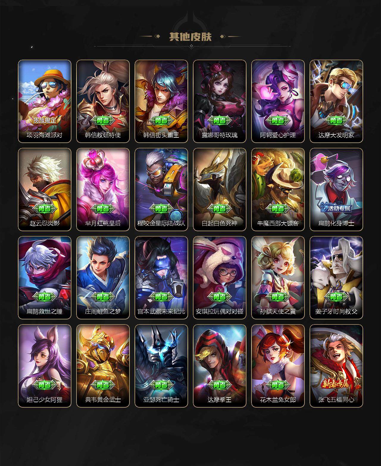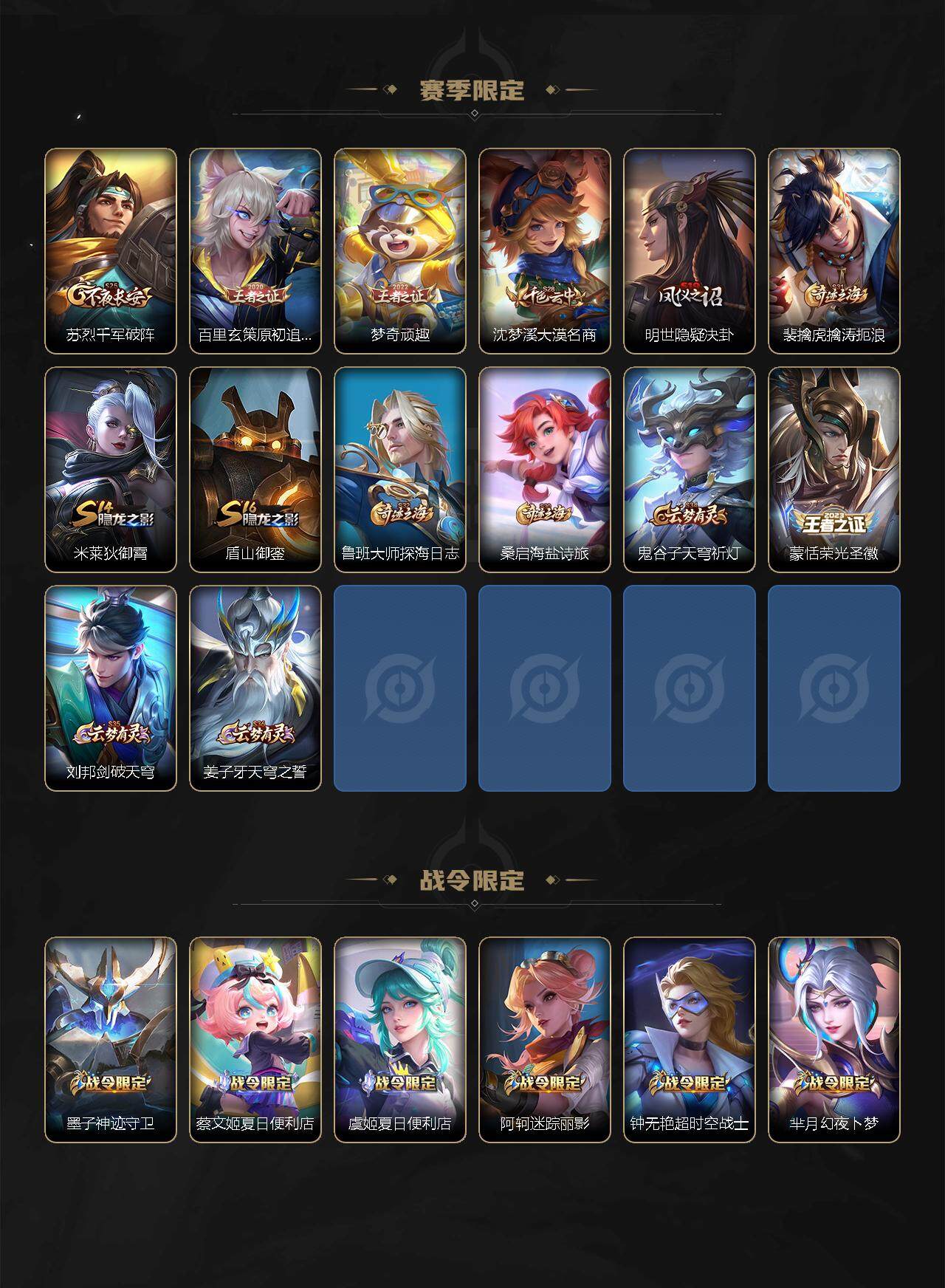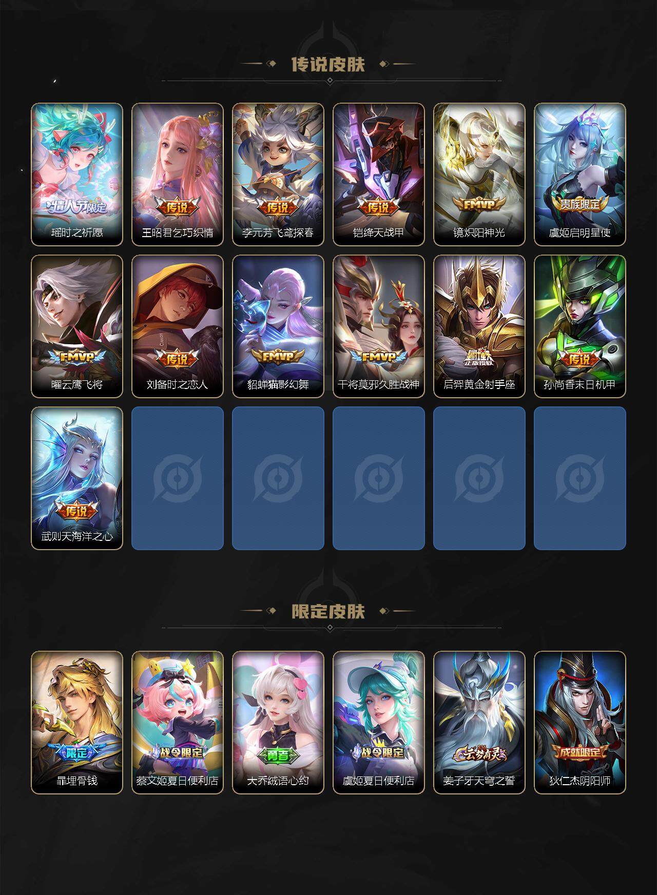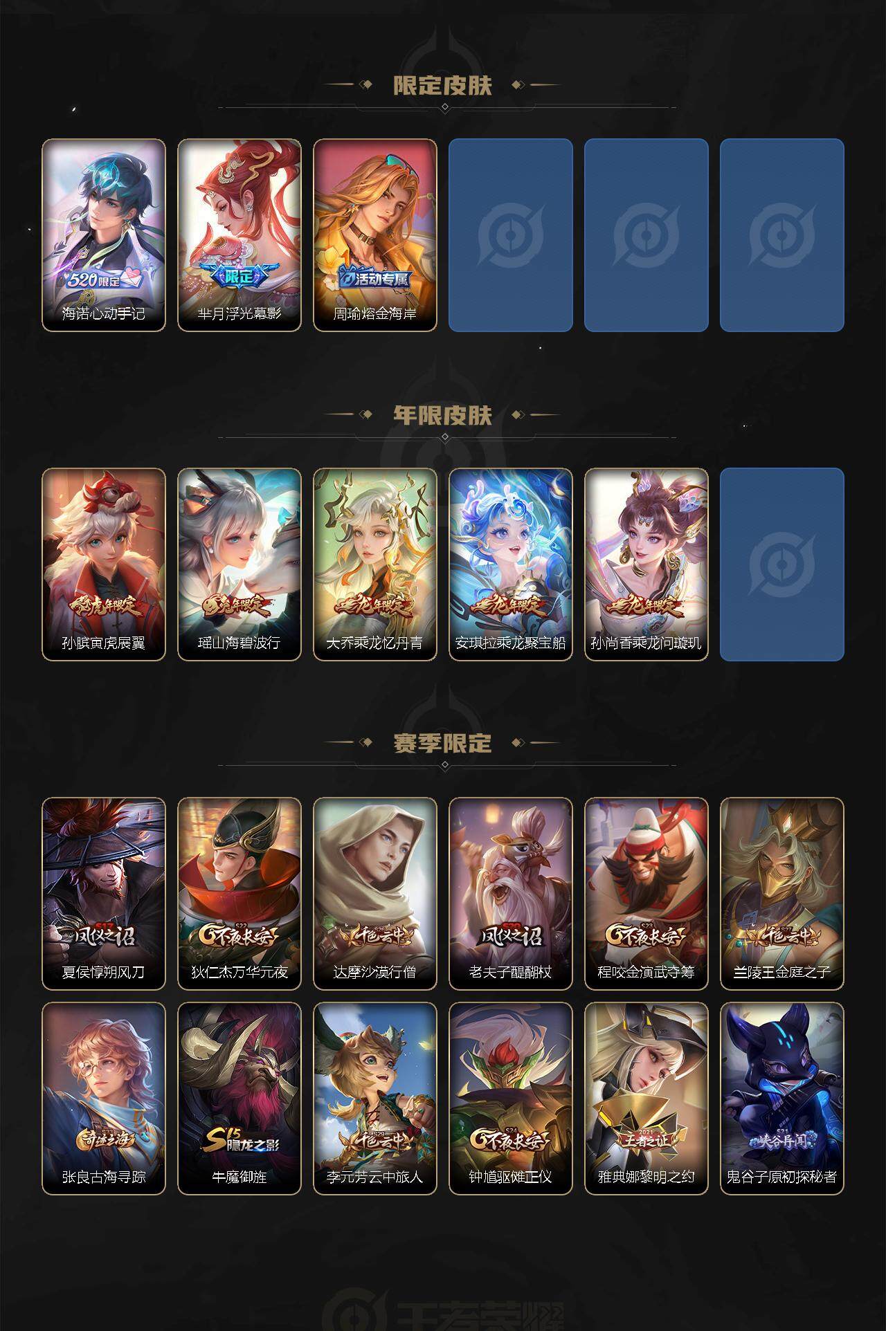 【限定皮肤】:暃埋骨钱,蔡文姬夏日便利店,大乔绒语心约,虞姬夏日便利店,姜子牙天穹之誓,狄仁杰阴阳师,赵云皇家上将,墨子神迹守卫,嬴政优雅恋人,庄周高山流水,阿轲迷踪丽影,钟无艳超时空战士,孙膑寅虎展翼,芈月白晶晶,芈月幻夜卜梦,吕布猎兽之王,元歌云间偶戏,元歌无心,夏侯惇朔风刀,甄姬游园惊梦,甄姬落雪兰心,甄姬至美化雀舞,典韦蓝屏警告,马可波罗暗影游猎,狄仁杰魔术师,狄仁杰万华元夜,达摩星际陆战队,达摩沙漠行僧,项羽海滩派对,老夫子醍醐杖,老夫子航海奇遇记,安琪拉魔法小厨娘,程咬金演武夺筹,刘邦夺宝奇兵,韩信傲雪梅枪,兰陵王金庭之子,亚瑟潮玩骑士王,孙悟空大圣娶亲,孙悟空孙行者,牛魔御旌,李元芳银河之约,李元芳云中旅人,虞姬启明星使,钟馗神迹守卫,钟馗驱傩正仪,雅典娜单词大作战,雅典娜黎明之约,蔡文姬奇迹圣诞,蔡文姬繁星吟游,鬼谷子原初探秘者,黄忠火炮绅士,苏烈千军破阵,百里玄策原初追逐者,弈星混沌棋,梦奇顽趣,沈梦溪星空之诺,沈梦溪大漠名商,明世隐疑决卦,裴擒虎李小龙,裴擒虎擒涛扼浪,米莱狄御霄,米莱狄胡桃异想国,瑶时之祈愿,瑶山海碧波行,云中君纤云弄巧,盾山御銮,猪八戒西部大镖客,上官婉儿梁祝,上官婉儿天狼绘梦者,上官婉儿神器万象笔,嫦娥拒霜思,嫦娥暖冬兔眠,蒙犽狂想玩偶喵,鲁班大师探海日志,桑启海盐诗旅,暃星界游侠,艾琳流音漫舞,司空震地狱燃心,阿古朵江河有灵,张良古海寻踪,蒙犽百解令,蒙恬荣光圣徽,高渐离燃音魔法,妲己灵卜魔法,鬼谷子天穹祈灯,伽罗琥珀纪元,姬小满妄想食味,小乔时之魔女,大乔乘龙忆丹青,安琪拉乘龙聚宝船,孙尚香乘龙问璇玑,沈梦溪龙舞盛年,曹操夜都魔契,鲁班七号蔬乡物语,李元芳蔬乡物语,海月