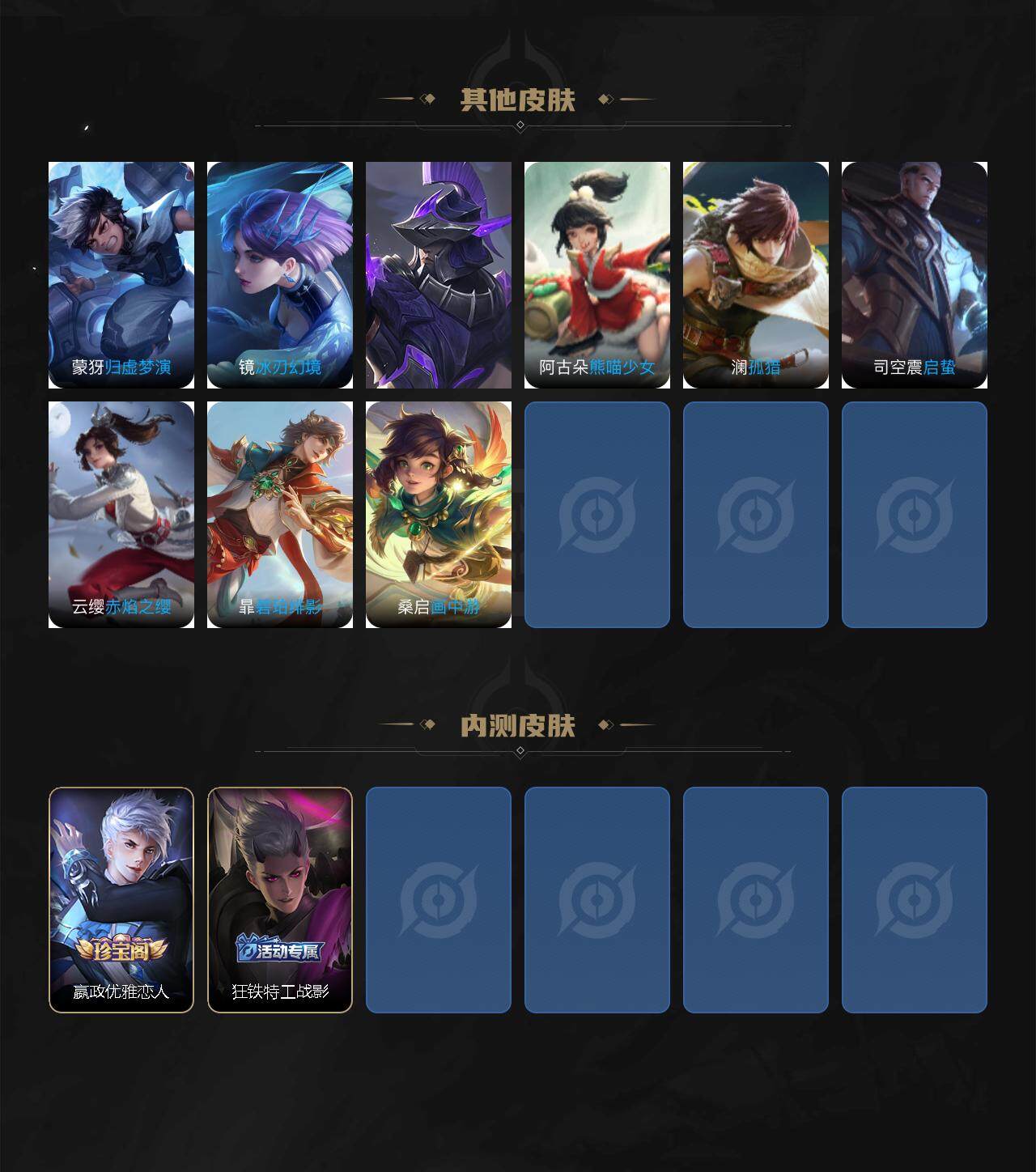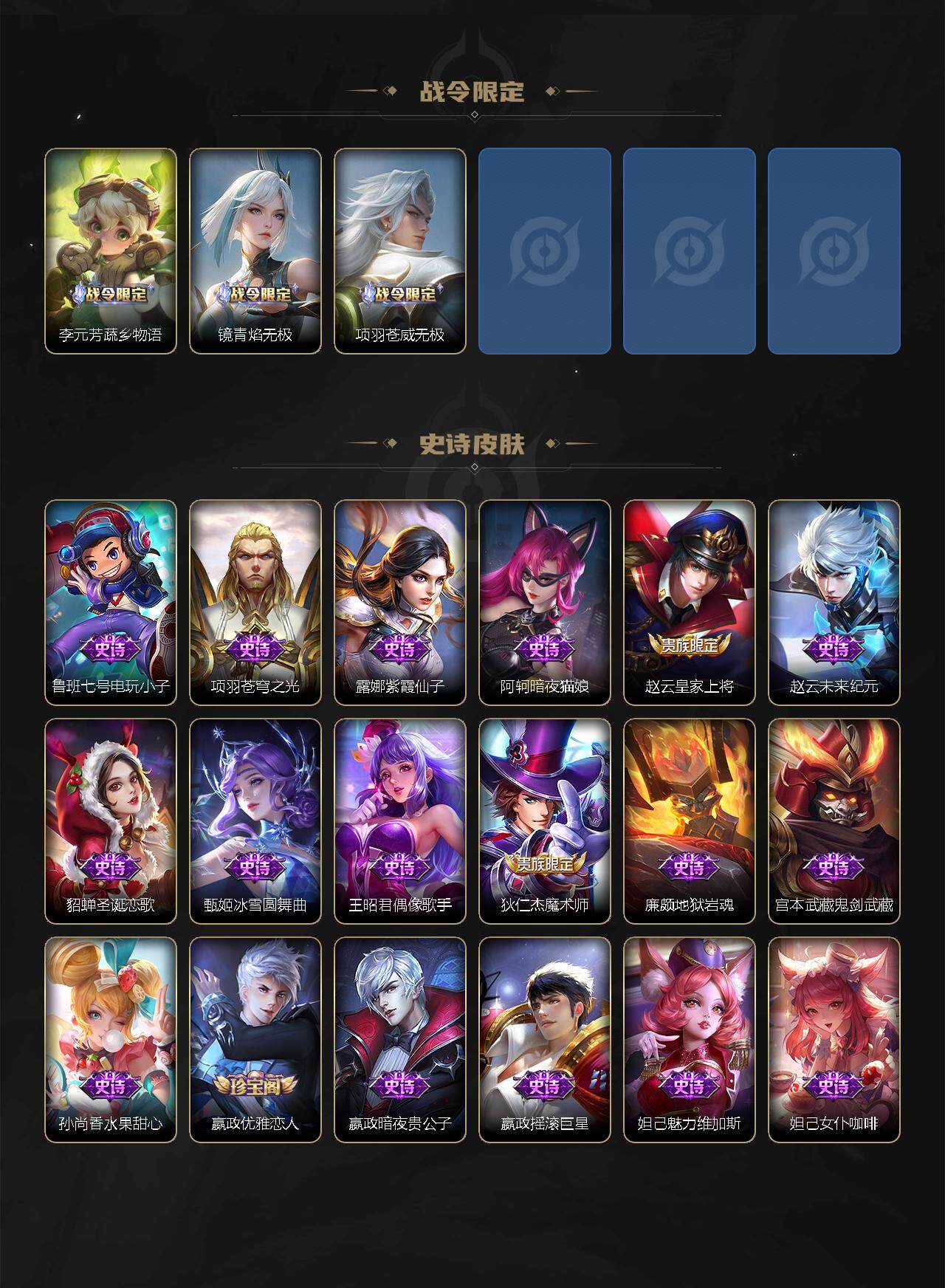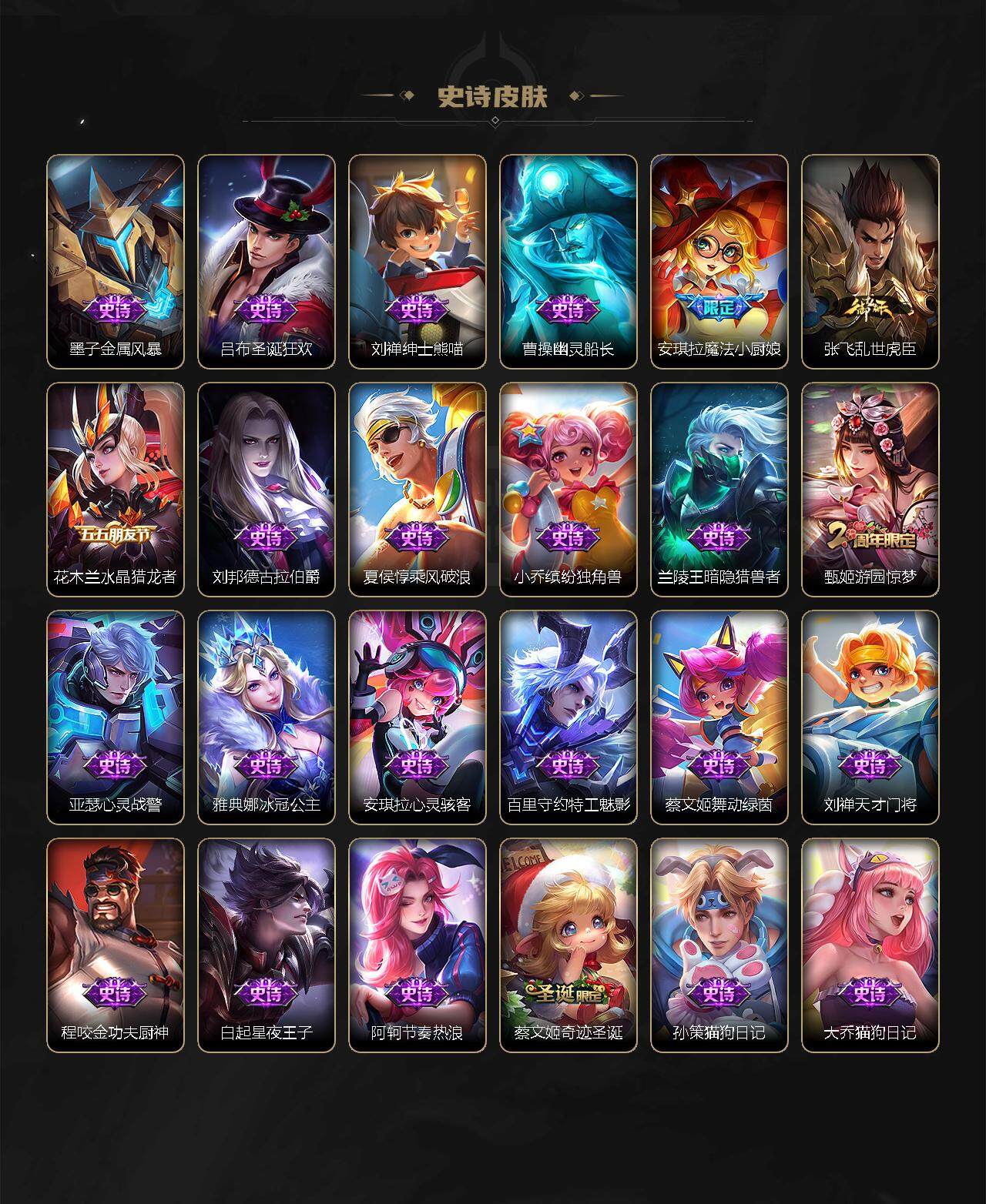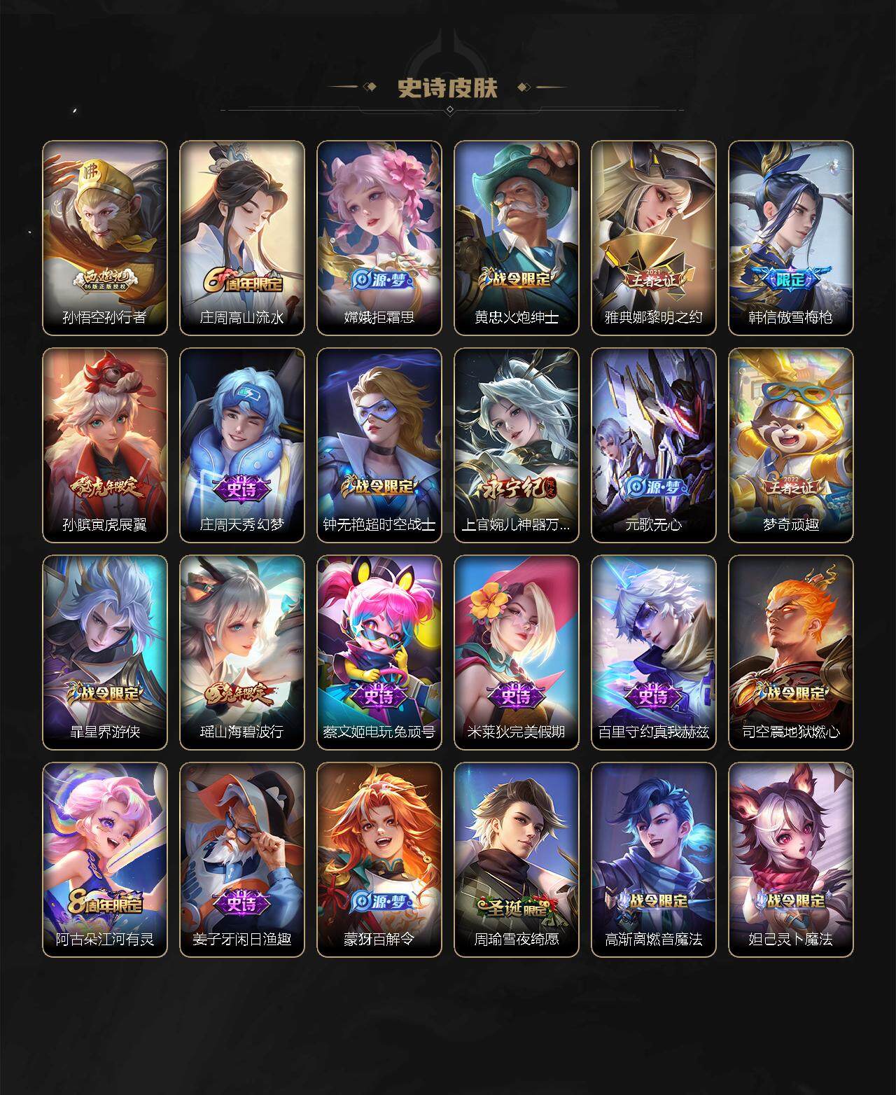 【限定皮肤】:暃埋骨钱,蔡文姬夏日便利店,大乔绒语心约,虞姬夏日便利店,姜子牙天穹之誓,狄仁杰阴阳师,赵云皇家上将,墨子神迹守卫,嬴政优雅恋人,庄周高山流水,阿轲迷踪丽影,钟无艳超时空战士,孙膑寅虎展翼,芈月白晶晶,芈月幻夜卜梦,吕布猎兽之王,元歌云间偶戏,元歌无心,夏侯惇朔风刀,甄姬游园惊梦,甄姬落雪兰心,甄姬至美化雀舞,典韦蓝屏警告,马可波罗暗影游猎,狄仁杰魔术师,狄仁杰万华元夜,达摩星际陆战队,达摩沙漠行僧,项羽海滩派对,老夫子醍醐杖,老夫子航海奇遇记,安琪拉魔法小厨娘,程咬金演武夺筹,刘邦夺宝奇兵,韩信傲雪梅枪,兰陵王金庭之子,亚瑟潮玩骑士王,孙悟空大圣娶亲,孙悟空孙行者,牛魔御旌,李元芳银河之约,李元芳云中旅人,虞姬启明星使,钟馗神迹守卫,钟馗驱傩正仪,雅典娜单词大作战,雅典娜黎明之约,蔡文姬奇迹圣诞,蔡文姬繁星吟游,鬼谷子原初探秘者,黄忠火炮绅士,苏烈千军破阵,百里玄策原初追逐者,弈星混沌棋,梦奇顽趣,沈梦溪星空之诺,沈梦溪大漠名商,明世隐疑决卦,裴擒虎李小龙,裴擒虎擒涛扼浪,米莱狄御霄,米莱狄胡桃异想国,瑶时之祈愿,瑶山海碧波行,云中君纤云弄巧,盾山御銮,猪八戒西部大镖客,上官婉儿梁祝,上官婉儿天狼绘梦者,上官婉儿神器万象笔,嫦娥拒霜思,嫦娥暖冬兔眠,蒙犽狂想玩偶喵,鲁班大师探海日志,桑启海盐诗旅,暃星界游侠,艾琳流音漫舞,司空震地狱燃心,阿古朵江河有灵,张良古海寻踪,蒙犽百解令,蒙恬荣光圣徽,高渐离燃音魔法,妲己灵卜魔法,鬼谷子天穹祈灯,伽罗琥珀纪元,姬小满妄想食味,小乔时之魔女,大乔乘龙忆丹青,安琪拉乘龙聚宝船,孙尚香乘龙问璇玑,沈梦溪龙舞盛年,曹操夜都魔契,鲁班七号蔬乡物语,李元芳蔬乡物语,海月