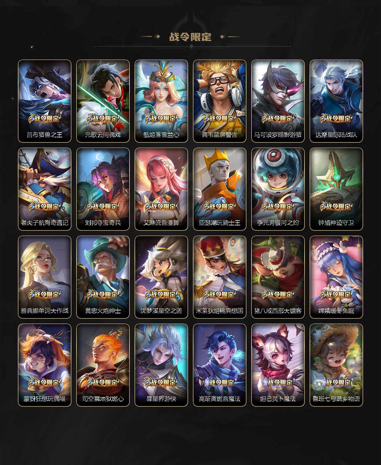 米莱狄御霄,牛魔御旌,盾山御銮,夏侯惇朔风刀,明世隐疑决卦,老夫子醍醐杖,鬼谷子原初探秘者,狄仁杰万华元夜,程咬金演武夺筹,钟馗驱傩正仪,苏烈千军破阵,吕布猎兽之王,典韦蓝屏警告,钟馗神迹守卫,沈梦溪星空之诺,李元芳银河之约,刘邦夺宝奇兵,马可波罗暗影游猎,蒙犽狂想玩偶喵,元歌云间偶戏,弈星混沌棋,达摩沙漠行僧,兰陵王金庭之子,沈梦溪大漠名商,李元芳云中旅人,桑启海盐诗旅,裴擒虎擒涛扼浪,鲁班大师探海日志,张良古海寻踪,项羽苍威无极,镜青焰无极
