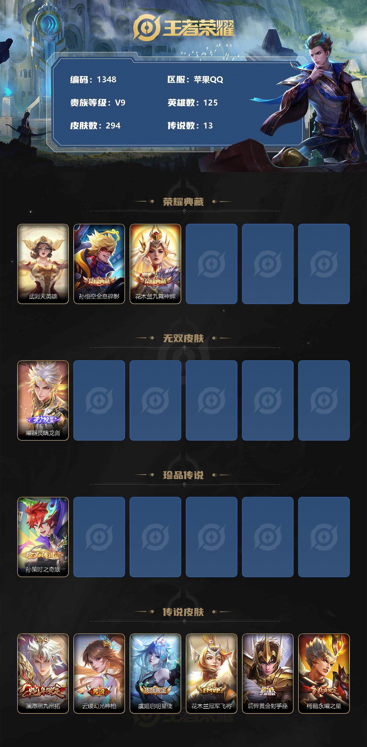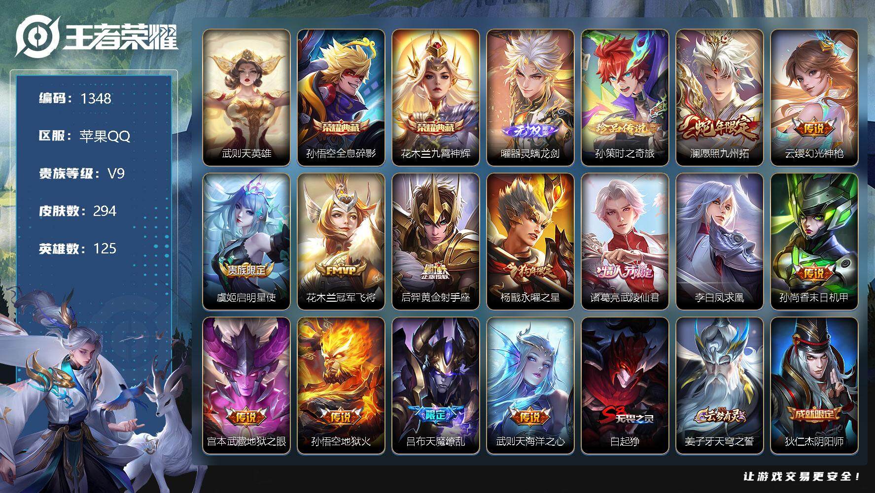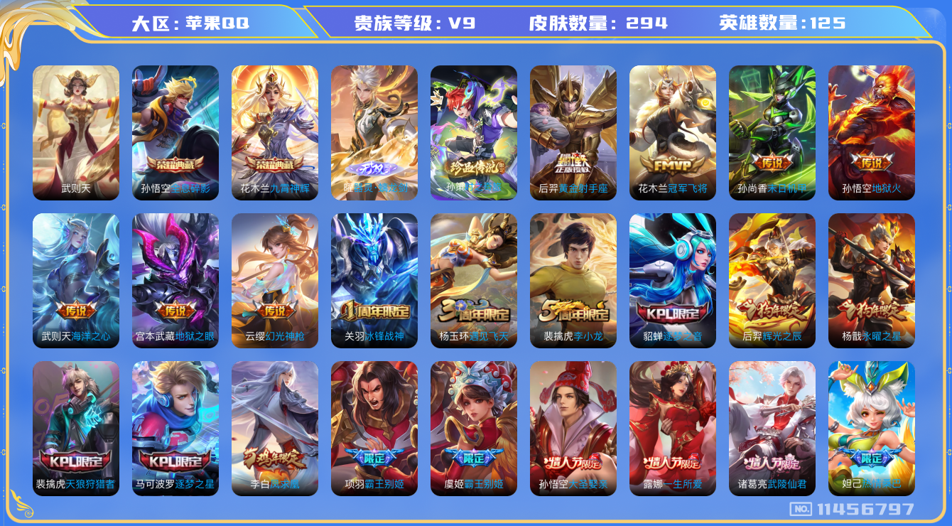 [11456797]【商品标题】:苹果Q-V9-最强王者段位-125英雄-294皮肤-2典藏-0珍品无双-1无双-1珍品传说-13传说-72史诗