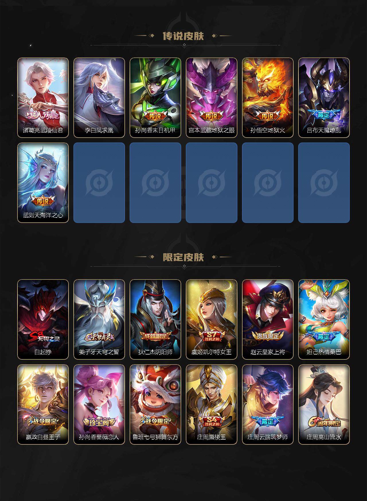 - [11228385]V7 6传说 123英雄 176皮肤 可修改实名 传说皮:零号·赤焰,地狱火,末日机甲-孙尚香(绿蚂蚱),炽阳神光,飞鸢探春,绛天战甲(鸡嘴战神) 珍宝阁皮:优雅恋人 限定皮:至尊宝,瑞麟志(木兰年限),遇见飞天,高山流水,青龙志(铠年限),游园惊梦,梁祝,御风骁将(吕布年限),李小龙,朱雀志(守约年限),如梦令-后羿,孙行者,猪悟能,大圣娶亲 史诗皮:千年之狐,永昼,猫狗日记-孙策,乱世虎臣,摇滚巨星,水果甜心,星夜王子,心灵骇客,暗隐猎兽者,幽灵船长,纤云弄巧,繁星吟游(呼啦呼啦),缤纷独角兽,乘风破浪,逐浪之夏,金属风暴,圣诞狂欢,圣诞恋歌,鹰眼统帅,魅力维加斯,无心