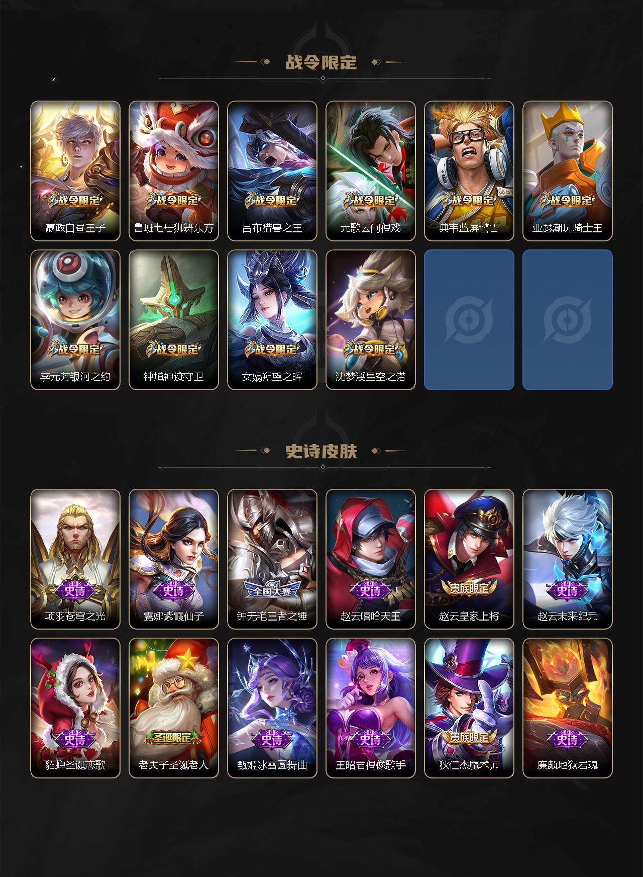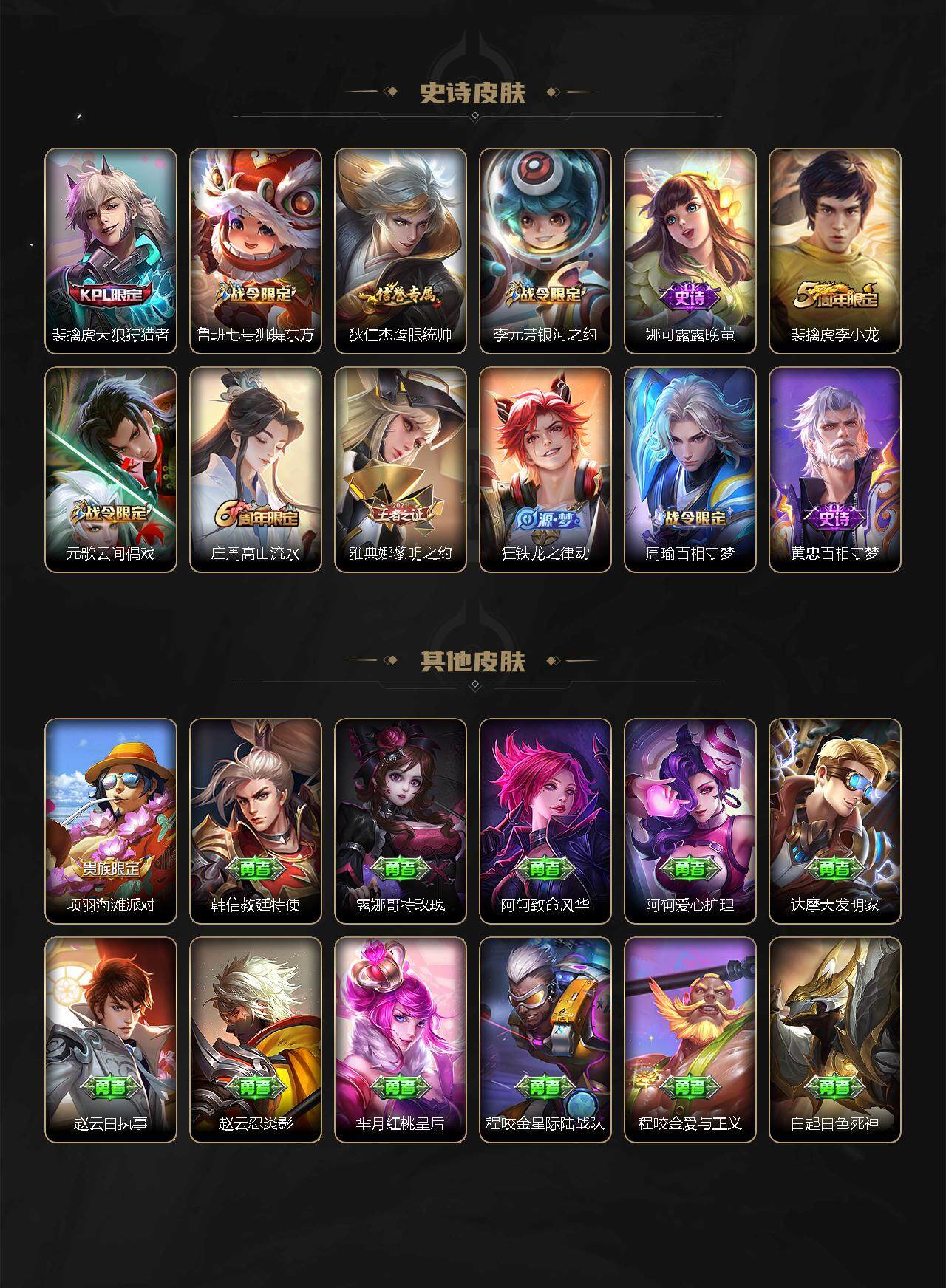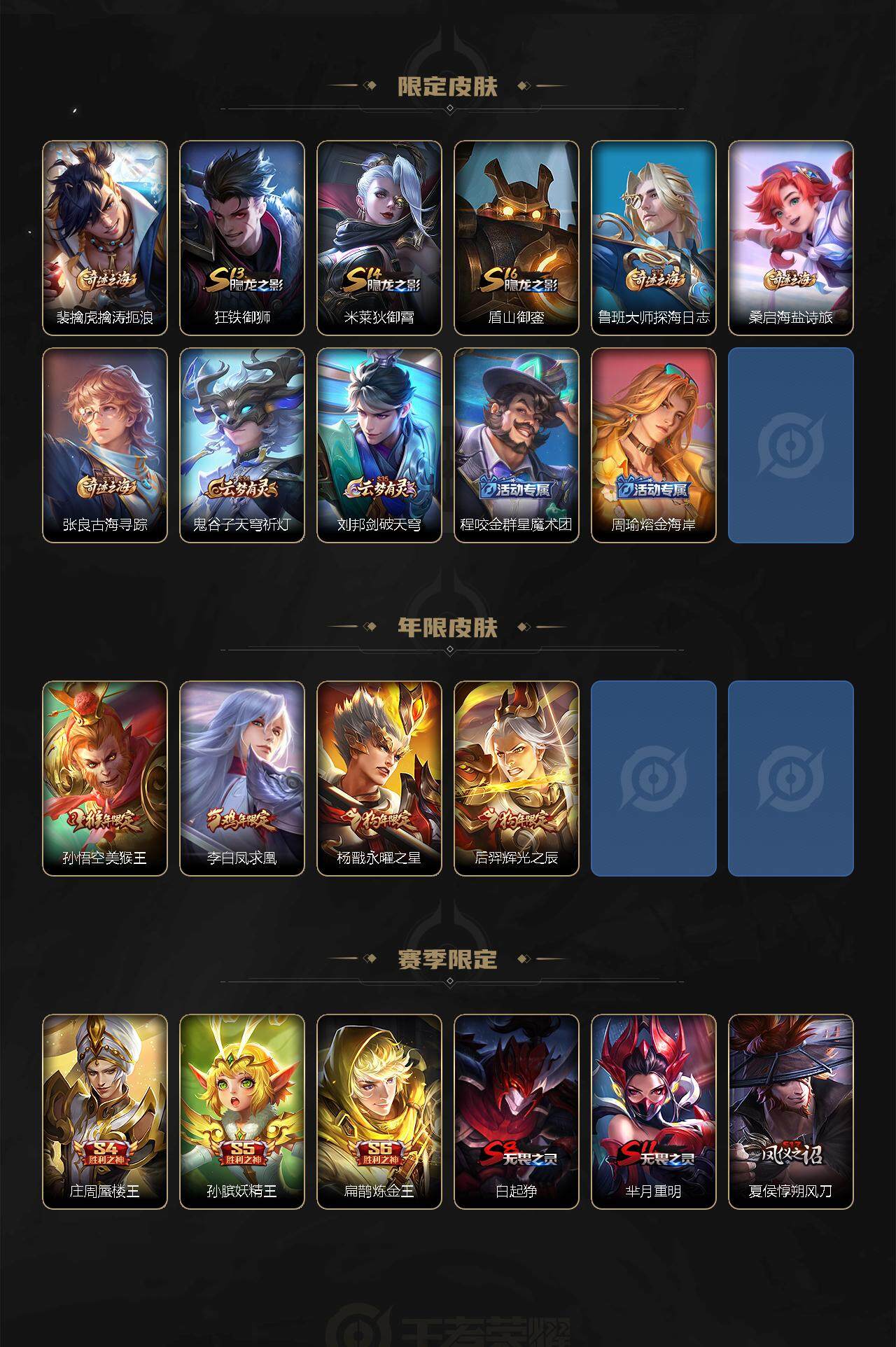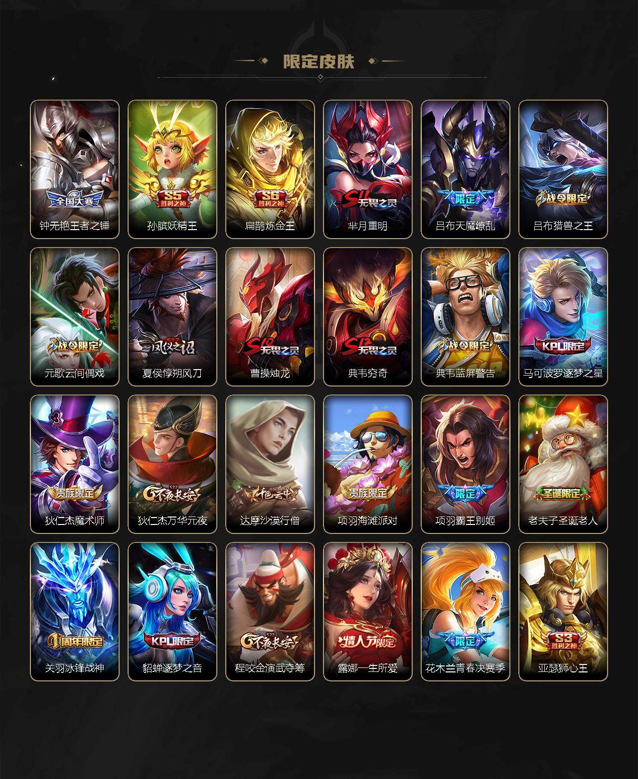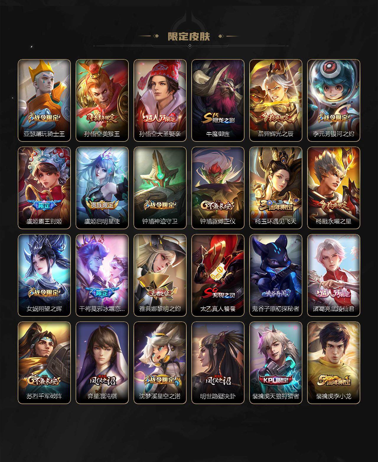 【限定皮肤】:白起狰,姜子牙天穹之誓,狄仁杰阴阳师,虞姬凯尔特女王,赵云皇家上将,妲己热情桑巴,嬴政白昼王子,孙尚香蔷薇恋人,鲁班七号狮舞东方,庄周蜃楼王,庄周云端筑梦师,庄周高山流水,钟无艳王者之锤,孙膑妖精王,扁鹊炼金王,芈月重明,吕布天魔缭乱,吕布猎兽之王,元歌云间偶戏,夏侯惇朔风刀,曹操烛龙,典韦穷奇,典韦蓝屏警告,马可波罗逐梦之星,狄仁杰魔术师,狄仁杰万华元夜,达摩沙漠行僧,项羽海滩派对,项羽霸王别姬,老夫子圣诞老人,关羽冰锋战神,貂蝉逐梦之音,程咬金演武夺筹,露娜一生所爱,花木兰青春决赛季,亚瑟狮心王,亚瑟潮玩骑士王,孙悟空美猴王,孙悟空大圣娶亲,牛魔御旌,后羿辉光之辰,李元芳银河之约,虞姬霸王别姬,虞姬启明星使,钟馗神迹守卫,钟馗驱傩正仪,杨玉环遇见飞天,杨戬永曜之星,女娲朔望之晖,干将莫邪冰霜恋舞曲,雅典娜黎明之约,太乙真人饕餮,鬼谷子原初探秘者,诸葛亮武陵仙君,苏烈千军破阵,弈星混沌棋,沈梦溪星空之诺,明世隐疑决卦,裴擒虎天狼狩猎者,裴擒虎李小龙,裴擒虎擒涛扼浪,狂铁御狮,米莱狄御霄,盾山御銮,鲁班大师探海日志,桑启海盐诗旅,张良古海寻踪,鬼谷子天穹祈灯,刘邦剑破天穹,程咬金群星魔术团,周瑜熔金海岸