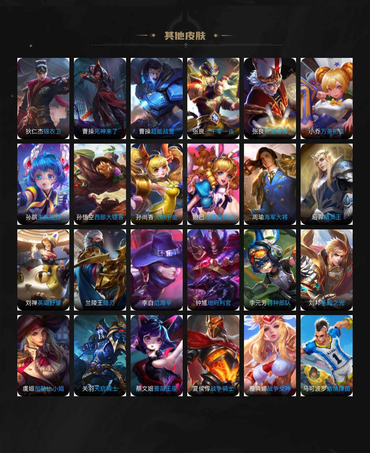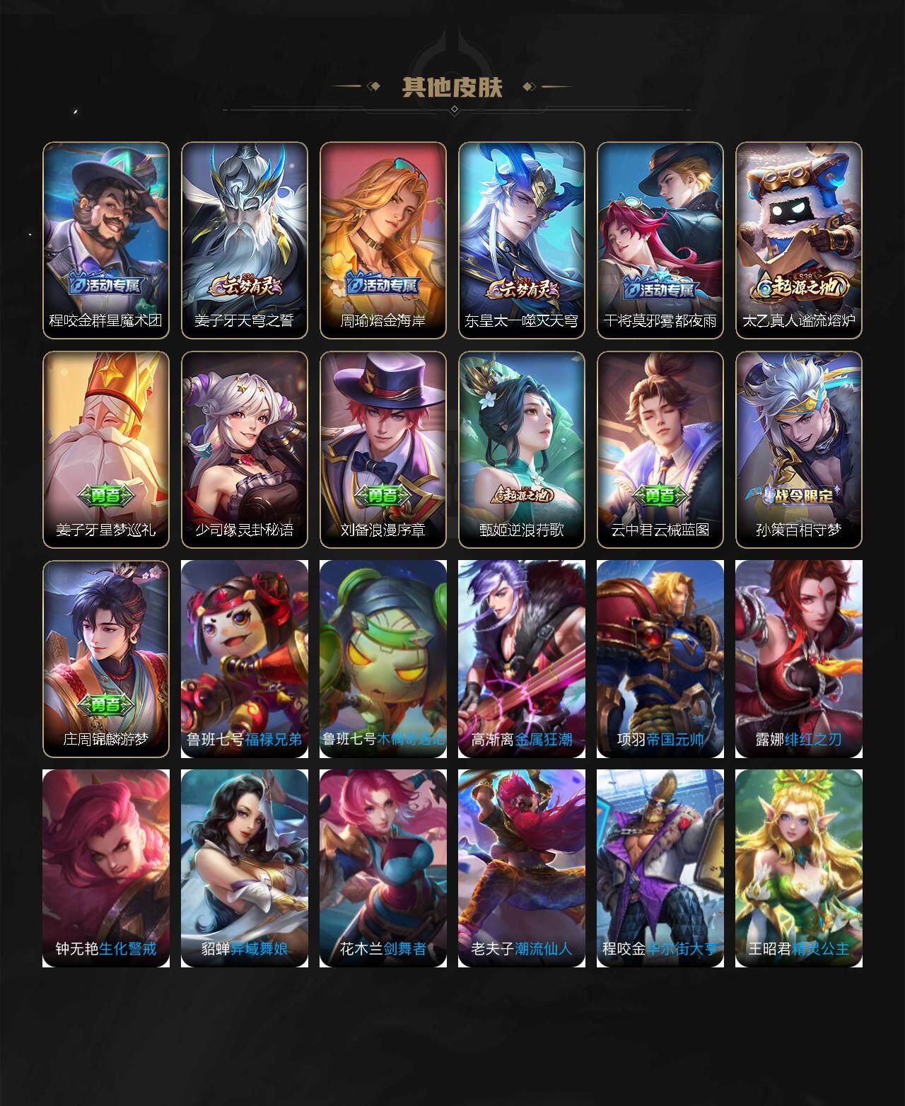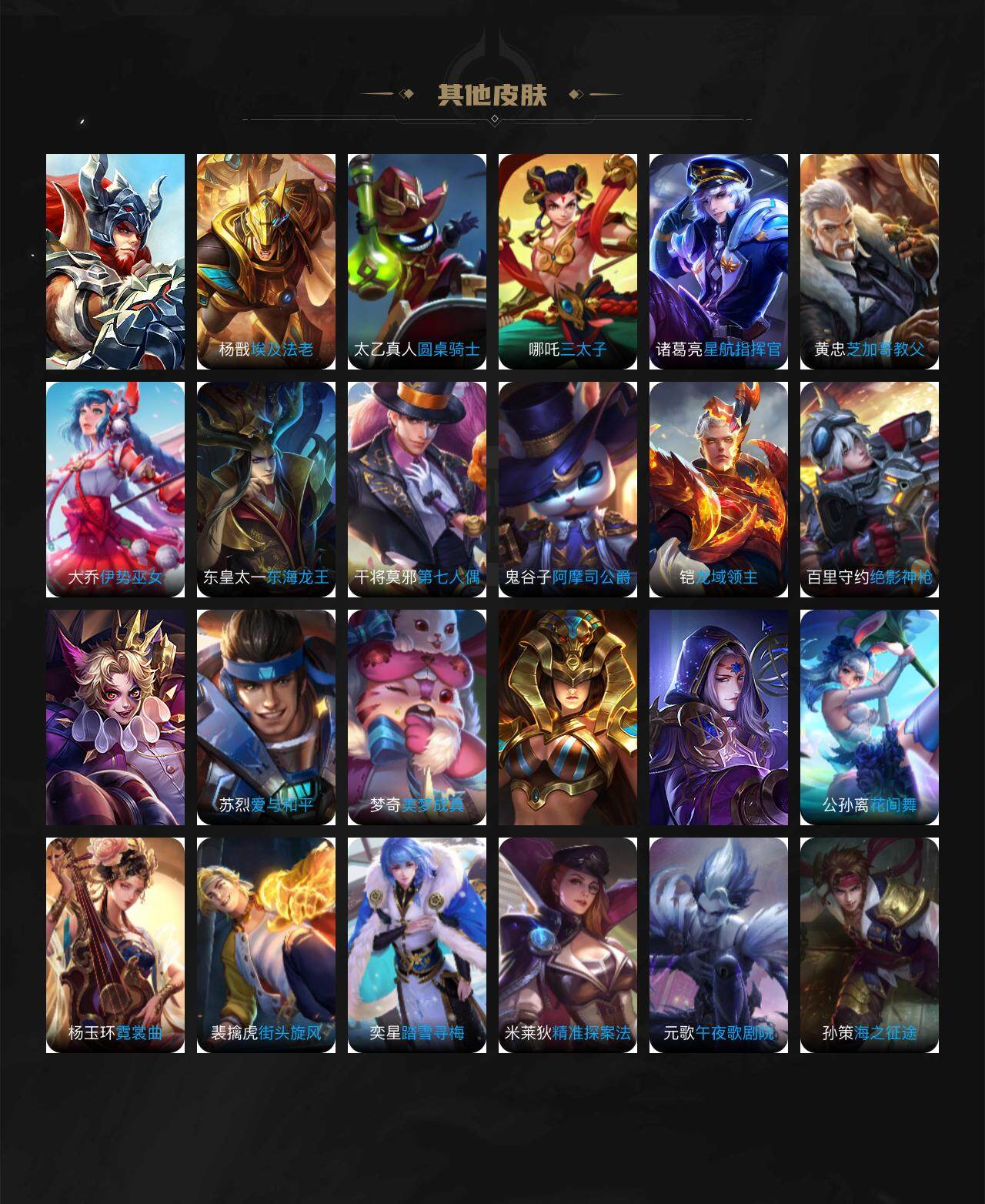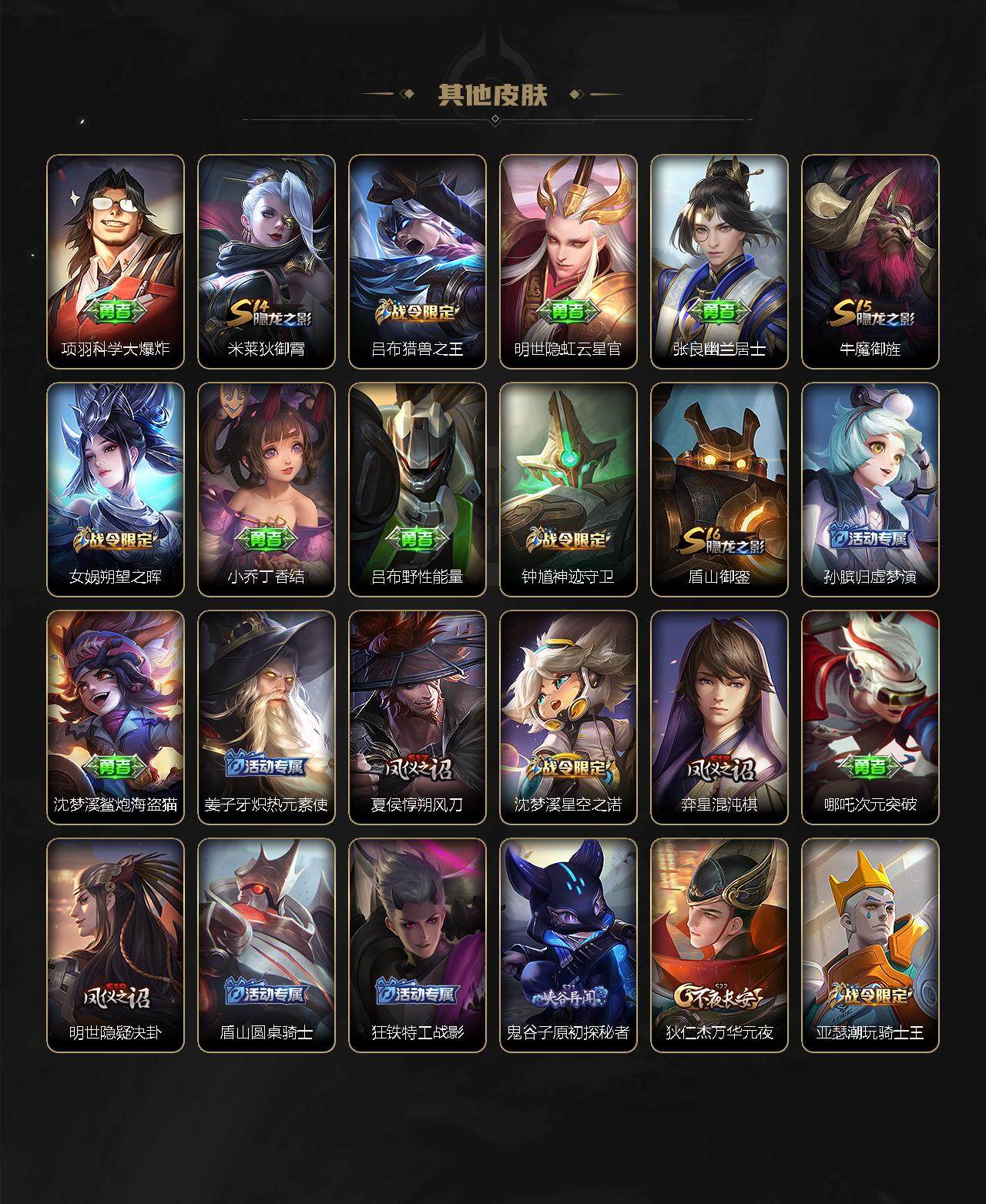 【限定皮肤】:白起狰,姜子牙天穹之誓,狄仁杰阴阳师,虞姬凯尔特女王,赵云皇家上将,妲己热情桑巴,嬴政白昼王子,孙尚香蔷薇恋人,鲁班七号狮舞东方,庄周蜃楼王,庄周云端筑梦师,庄周高山流水,钟无艳王者之锤,孙膑妖精王,扁鹊炼金王,芈月重明,吕布天魔缭乱,吕布猎兽之王,元歌云间偶戏,夏侯惇朔风刀,曹操烛龙,典韦穷奇,典韦蓝屏警告,马可波罗逐梦之星,狄仁杰魔术师,狄仁杰万华元夜,达摩沙漠行僧,项羽海滩派对,项羽霸王别姬,老夫子圣诞老人,关羽冰锋战神,貂蝉逐梦之音,程咬金演武夺筹,露娜一生所爱,花木兰青春决赛季,亚瑟狮心王,亚瑟潮玩骑士王,孙悟空美猴王,孙悟空大圣娶亲,牛魔御旌,后羿辉光之辰,李元芳银河之约,虞姬霸王别姬,虞姬启明星使,钟馗神迹守卫,钟馗驱傩正仪,杨玉环遇见飞天,杨戬永曜之星,女娲朔望之晖,干将莫邪冰霜恋舞曲,雅典娜黎明之约,太乙真人饕餮,鬼谷子原初探秘者,诸葛亮武陵仙君,苏烈千军破阵,弈星混沌棋,沈梦溪星空之诺,明世隐疑决卦,裴擒虎天狼狩猎者,裴擒虎李小龙,裴擒虎擒涛扼浪,狂铁御狮,米莱狄御霄,盾山御銮,鲁班大师探海日志,桑启海盐诗旅,张良古海寻踪,鬼谷子天穹祈灯,刘邦剑破天穹,程咬金群星魔术团,周瑜熔金海岸