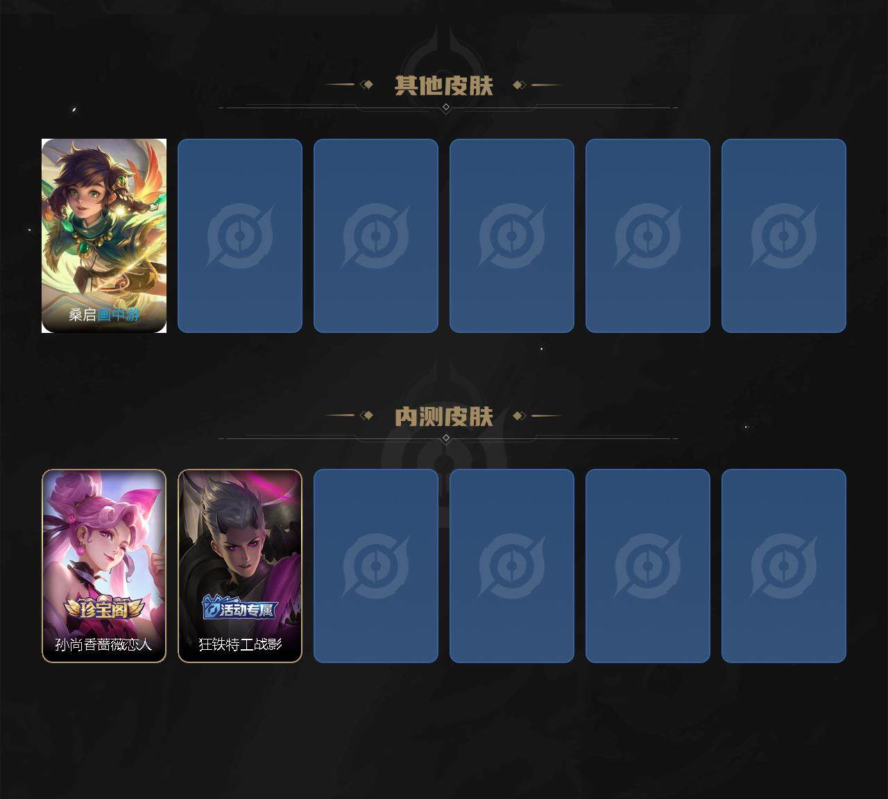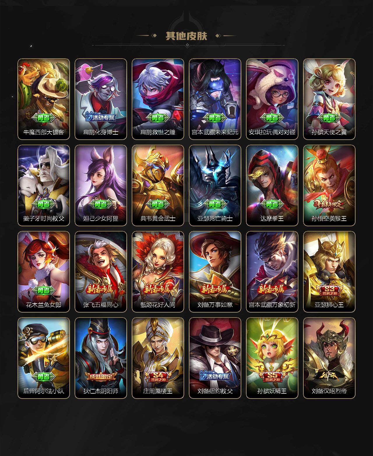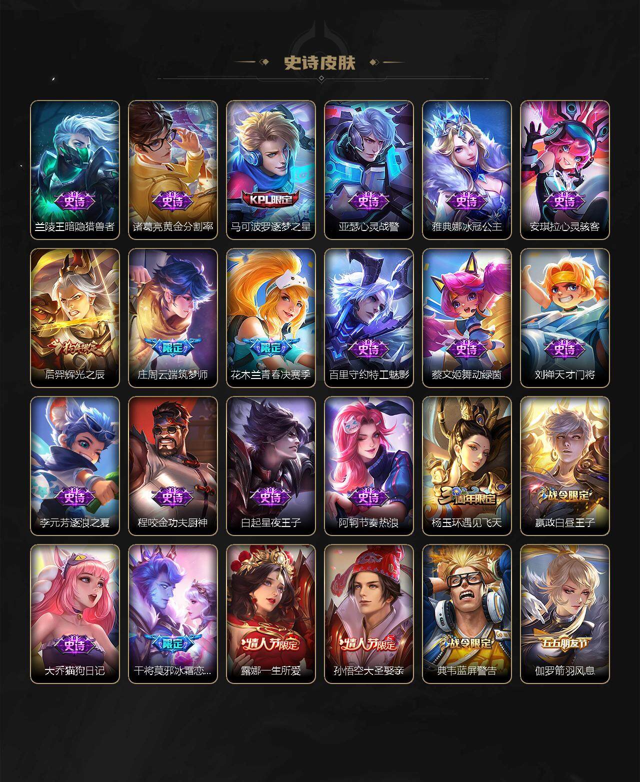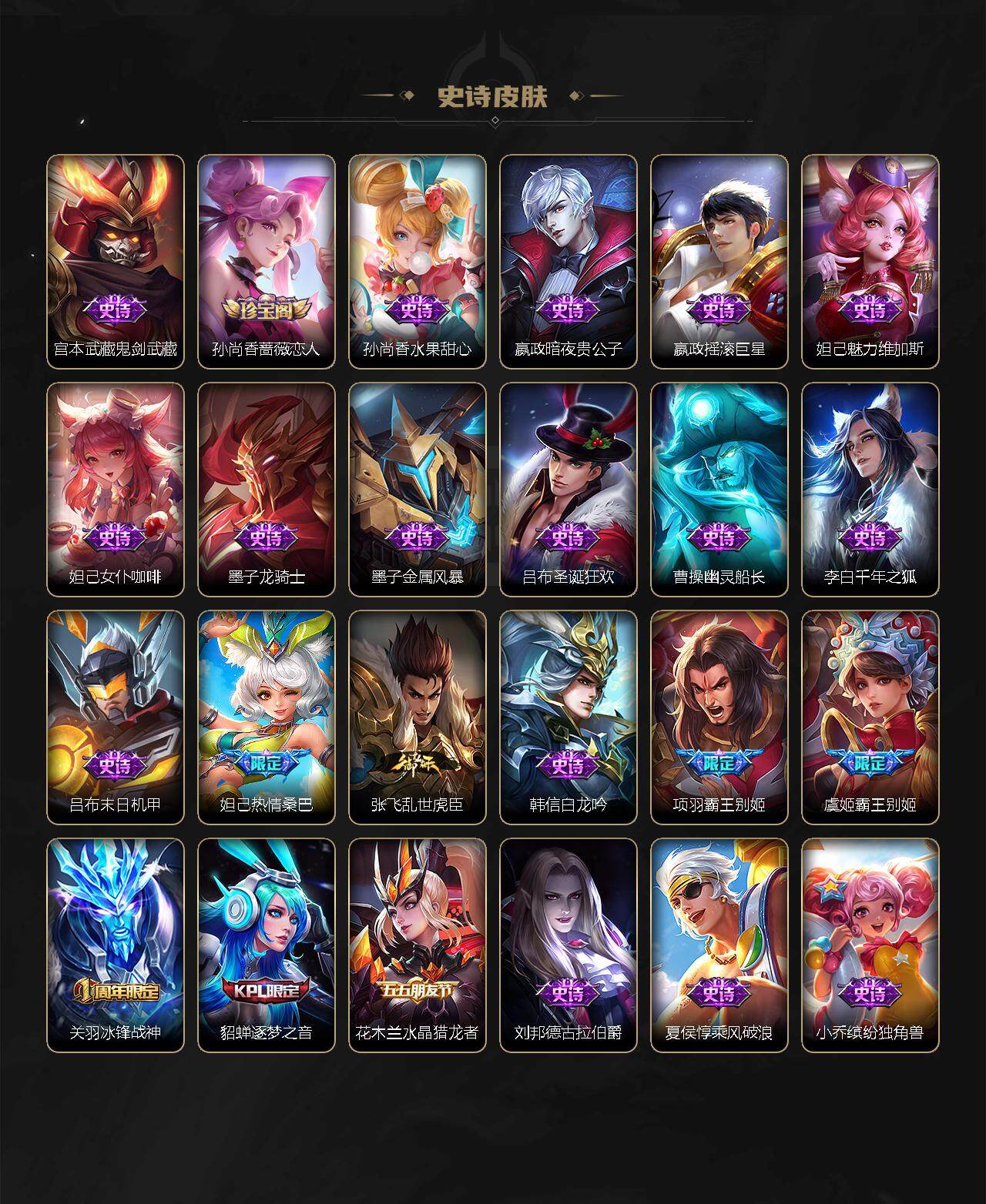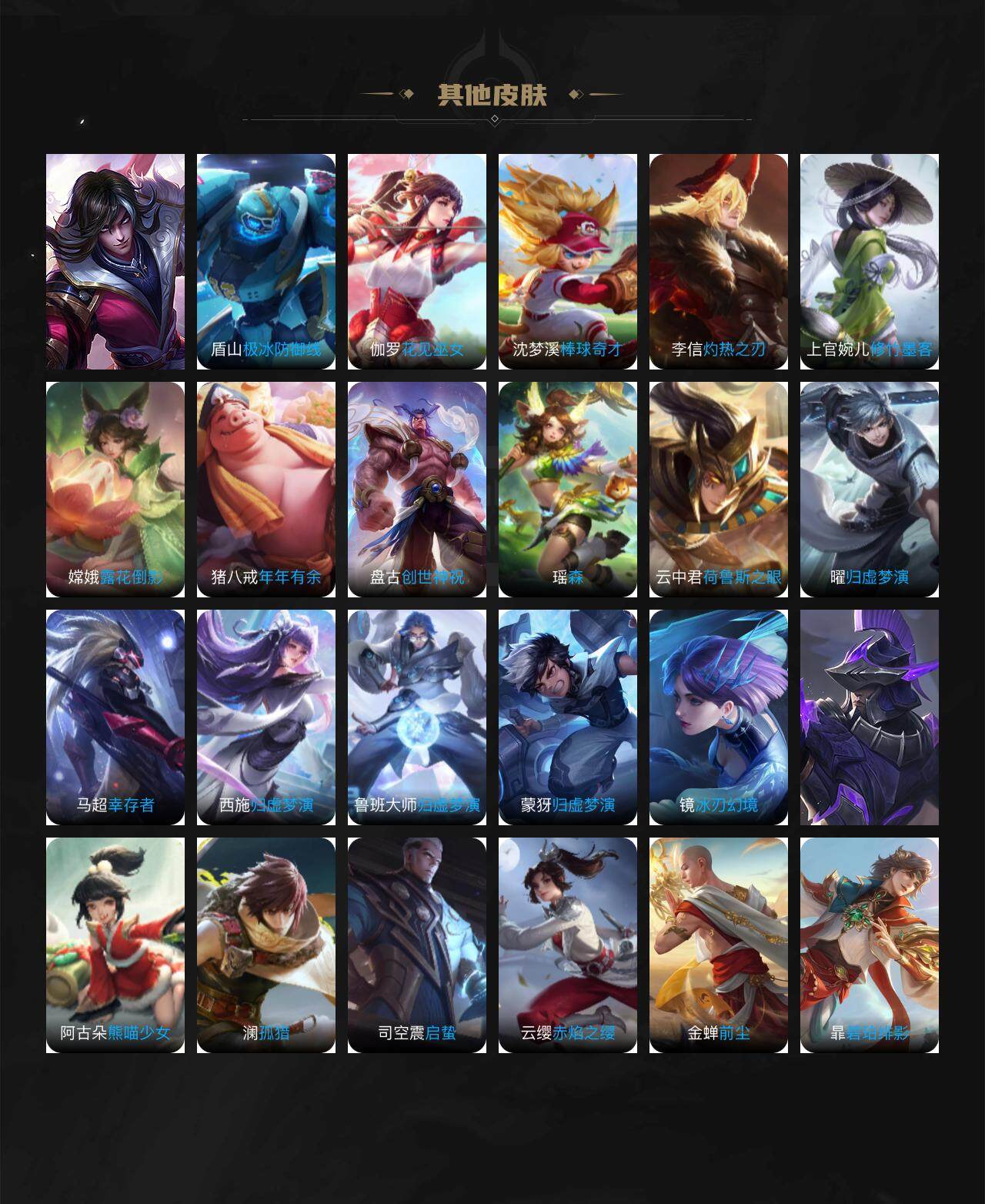 【限定皮肤】:白起狰,姜子牙天穹之誓,狄仁杰阴阳师,虞姬凯尔特女王,赵云皇家上将,妲己热情桑巴,嬴政白昼王子,孙尚香蔷薇恋人,鲁班七号狮舞东方,庄周蜃楼王,庄周云端筑梦师,庄周高山流水,钟无艳王者之锤,孙膑妖精王,扁鹊炼金王,芈月重明,吕布天魔缭乱,吕布猎兽之王,元歌云间偶戏,夏侯惇朔风刀,曹操烛龙,典韦穷奇,典韦蓝屏警告,马可波罗逐梦之星,狄仁杰魔术师,狄仁杰万华元夜,达摩沙漠行僧,项羽海滩派对,项羽霸王别姬,老夫子圣诞老人,关羽冰锋战神,貂蝉逐梦之音,程咬金演武夺筹,露娜一生所爱,花木兰青春决赛季,亚瑟狮心王,亚瑟潮玩骑士王,孙悟空美猴王,孙悟空大圣娶亲,牛魔御旌,后羿辉光之辰,李元芳银河之约,虞姬霸王别姬,虞姬启明星使,钟馗神迹守卫,钟馗驱傩正仪,杨玉环遇见飞天,杨戬永曜之星,女娲朔望之晖,干将莫邪冰霜恋舞曲,雅典娜黎明之约,太乙真人饕餮,鬼谷子原初探秘者,诸葛亮武陵仙君,苏烈千军破阵,弈星混沌棋,沈梦溪星空之诺,明世隐疑决卦,裴擒虎天狼狩猎者,裴擒虎李小龙,裴擒虎擒涛扼浪,狂铁御狮,米莱狄御霄,盾山御銮,鲁班大师探海日志,桑启海盐诗旅,张良古海寻踪,鬼谷子天穹祈灯,刘邦剑破天穹,程咬金群星魔术团,周瑜熔金海岸