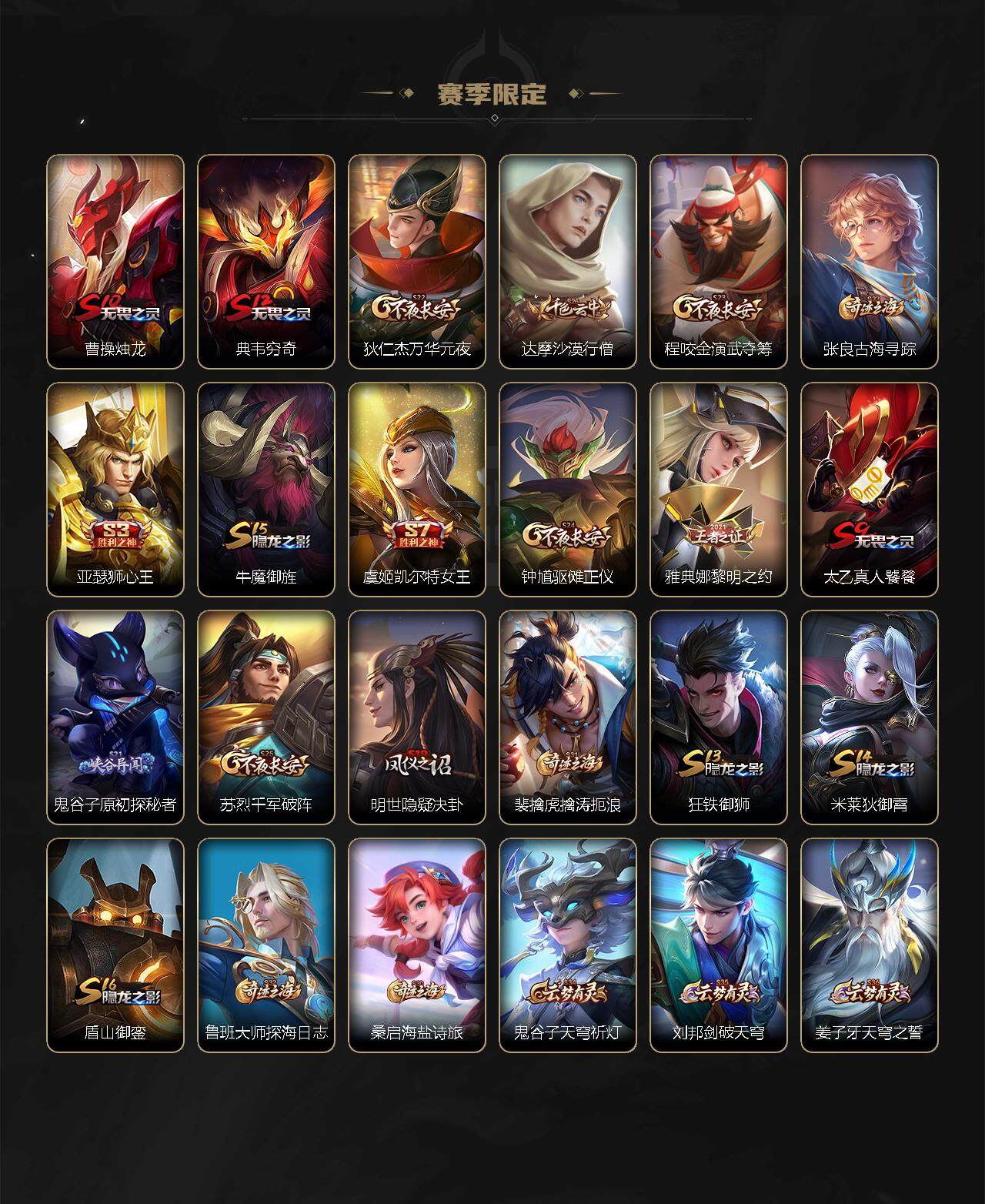【赛季限定】:庄周蜃楼王,孙膑妖精王,扁鹊炼金王,白起狰,芈月重明,夏侯惇朔风刀,曹操烛龙,典韦穷奇,狄仁杰万华元夜,达摩沙漠行僧,程咬金演武夺筹,张良古海寻踪,亚瑟狮心王,牛魔御旌,虞姬凯尔特女王,钟馗驱傩正仪,雅典娜黎明之约,太乙真人饕餮,鬼谷子原初探秘者,苏烈千军破阵,弈星混沌棋,明世隐疑决卦,裴擒虎擒涛扼浪,狂铁御狮,米莱狄御霄,盾山御銮,鲁班大师探海日志,桑启海盐诗旅,鬼谷子天穹祈灯,刘邦剑破天穹,姜子牙天穹之誓