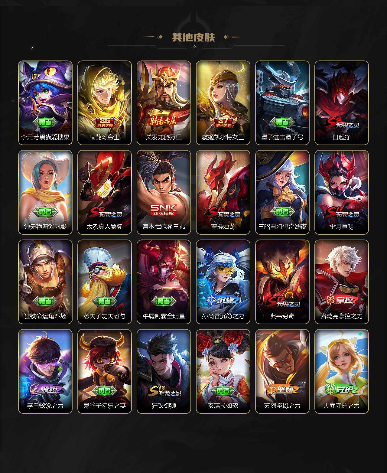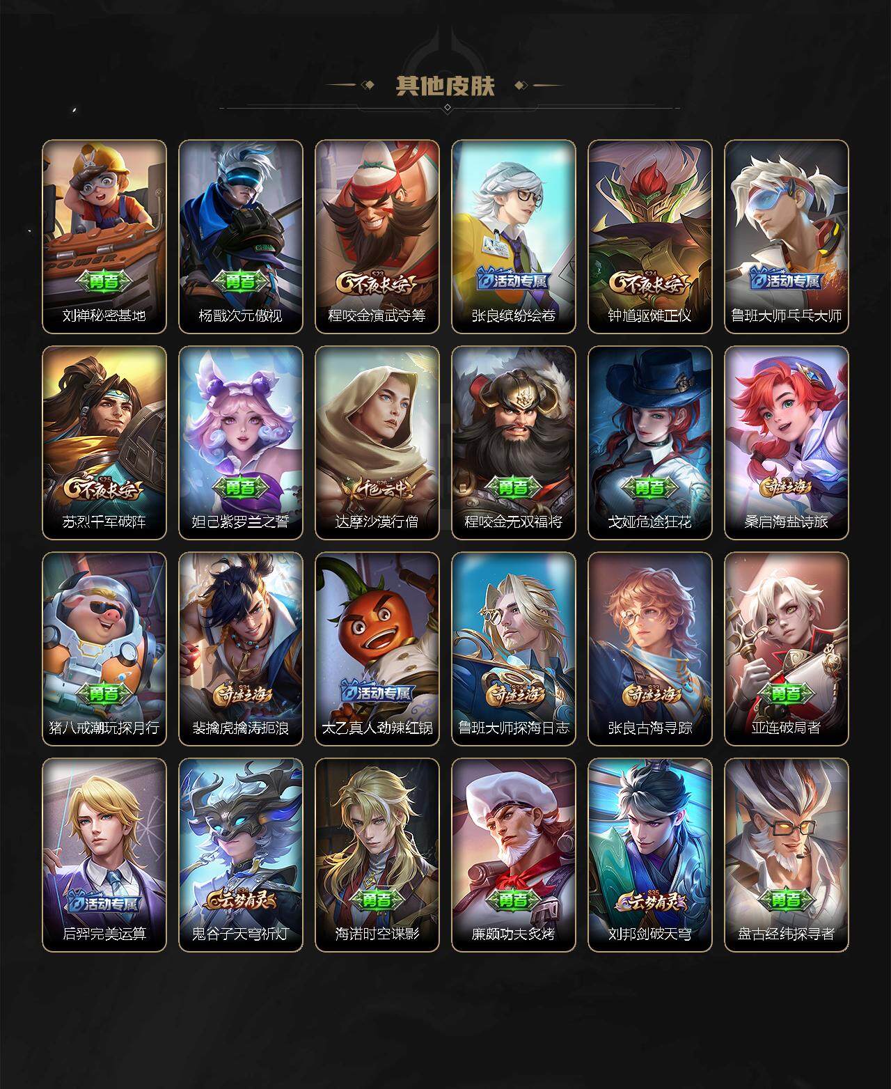 亚瑟狮心王,庄周蜃楼王,孙膑妖精王,扁鹊炼金王,虞姬凯尔特女王,白起狰,太乙真人饕餮,曹操烛龙,芈月重明,典韦穷奇,狂铁御狮,米莱狄御霄,牛魔御旌,盾山御銮,夏侯惇朔风刀,明世隐疑决卦,鬼谷子原初探秘者,狄仁杰万华元夜,程咬金演武夺筹,钟馗驱傩正仪,苏烈千军破阵,吕布猎兽之王,嬴政白昼王子,女娲朔望之晖,典韦蓝屏警告,钟馗神迹守卫,鲁班七号狮舞东方,沈梦溪星空之诺,李元芳银河之约,元歌云间偶戏,弈星混沌棋,达摩沙漠行僧,桑启海盐诗旅,裴擒虎擒涛扼浪,鲁班大师探海日志,张良古海寻踪