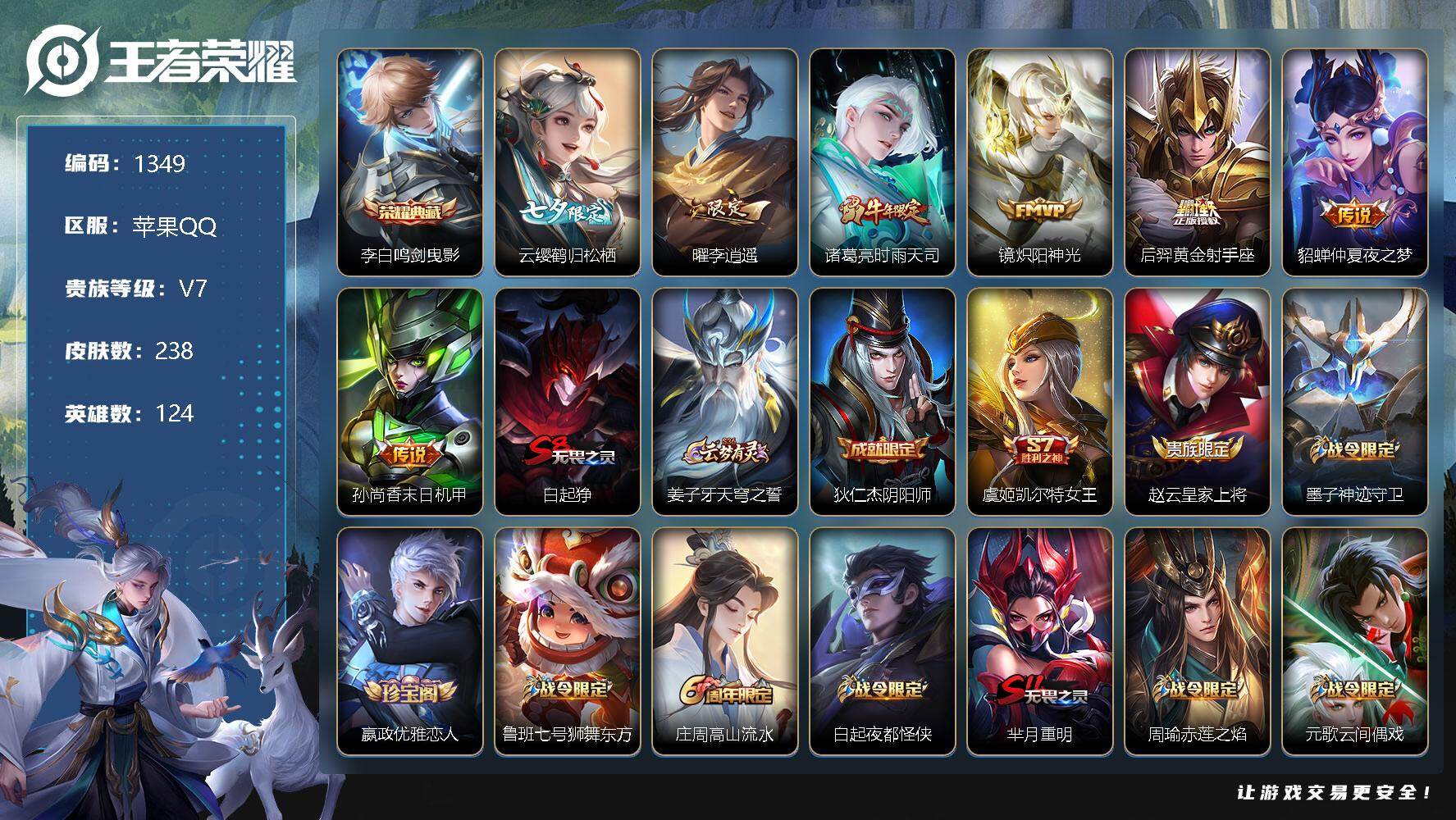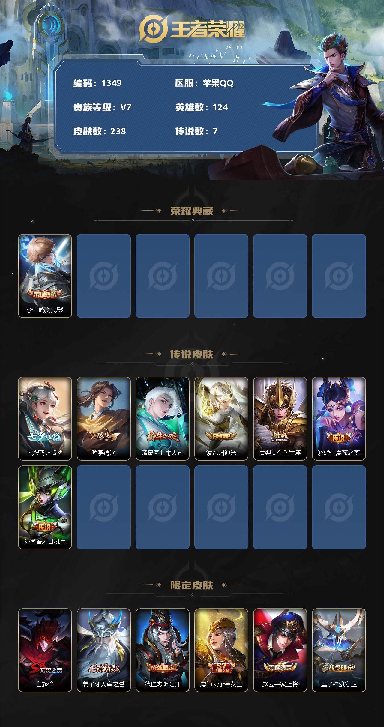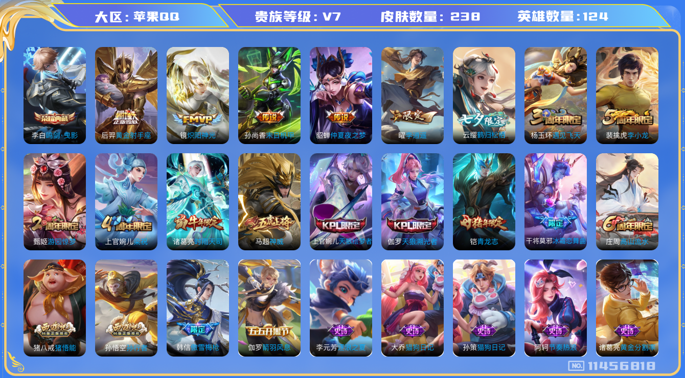 [11456818]【商品标题】:苹果Q-V7-最强王者段位-124英雄-238皮肤-1典藏-0珍品无双-0无双-0珍品传说-7传说-70史诗