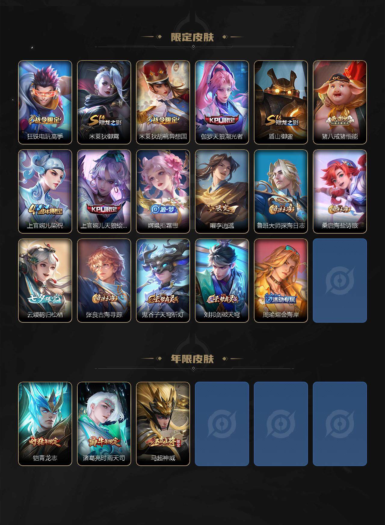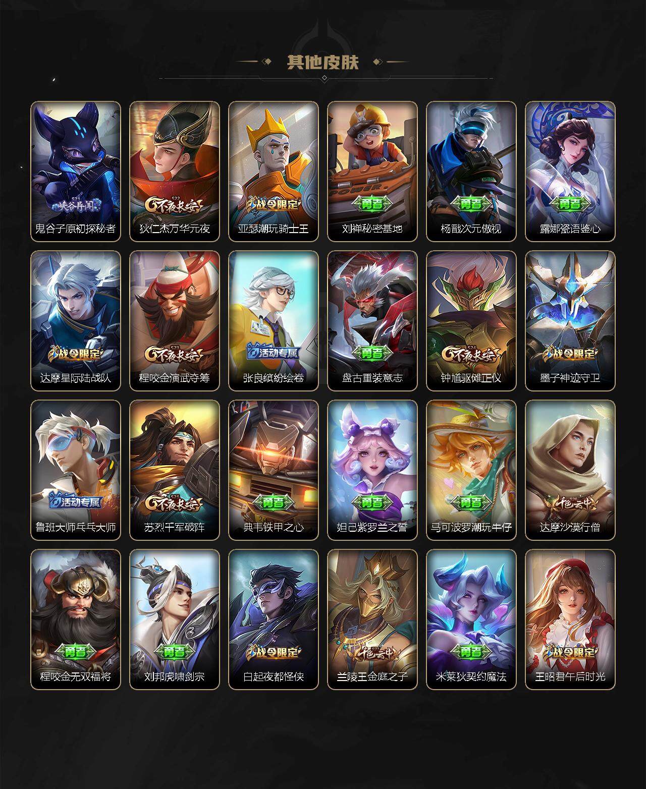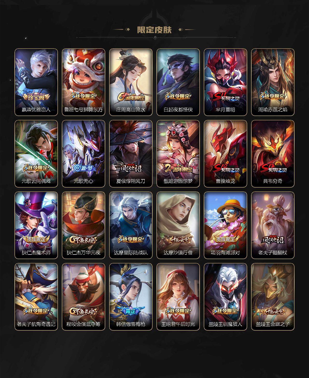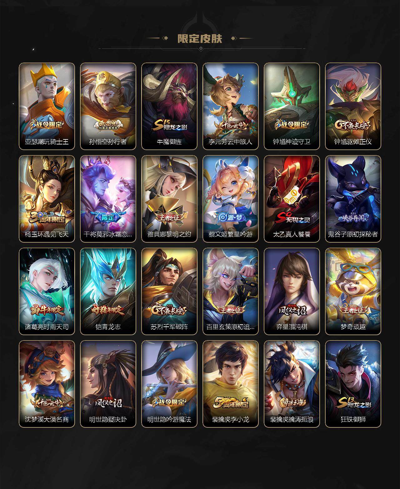【限定皮肤】:白起狰,姜子牙天穹之誓,狄仁杰阴阳师,虞姬凯尔特女王,赵云皇家上将,墨子神迹守卫,嬴政优雅恋人,鲁班七号狮舞东方,庄周高山流水,白起夜都怪侠,芈月重明,周瑜赤莲之焰,元歌云间偶戏,元歌无心,夏侯惇朔风刀,甄姬游园惊梦,曹操烛龙,典韦穷奇,狄仁杰魔术师,狄仁杰万华元夜,达摩星际陆战队,达摩沙漠行僧,项羽海滩派对,老夫子醍醐杖,老夫子航海奇遇记,程咬金演武夺筹,韩信傲雪梅枪,王昭君午后时光,兰陵王驯魔猎人,兰陵王金庭之子,亚瑟潮玩骑士王,孙悟空孙行者,牛魔御旌,李元芳云中旅人,钟馗神迹守卫,钟馗驱傩正仪,杨玉环遇见飞天,干将莫邪冰霜恋舞曲,雅典娜黎明之约,蔡文姬繁星吟游,太乙真人饕餮,鬼谷子原初探秘者,诸葛亮时雨天司,铠青龙志,苏烈千军破阵,百里玄策原初追逐者,弈星混沌棋,梦奇顽趣,沈梦溪大漠名商,明世隐疑决卦,明世隐吟游魔法,裴擒虎李小龙,裴擒虎擒涛扼浪,狂铁御狮,狂铁电玩高手,米莱狄御霄,米莱狄胡桃异想国,伽罗天狼溯光者,盾山御銮,猪八戒猪悟能,上官婉儿梁祝,上官婉儿天狼绘梦者,嫦娥拒霜思,曜李逍遥 ,鲁班大师探海日志,桑启海盐诗旅,云缨鹤归松栖,张良古海寻踪,鬼谷子天穹祈灯,刘邦剑破天穹,周瑜熔金海岸