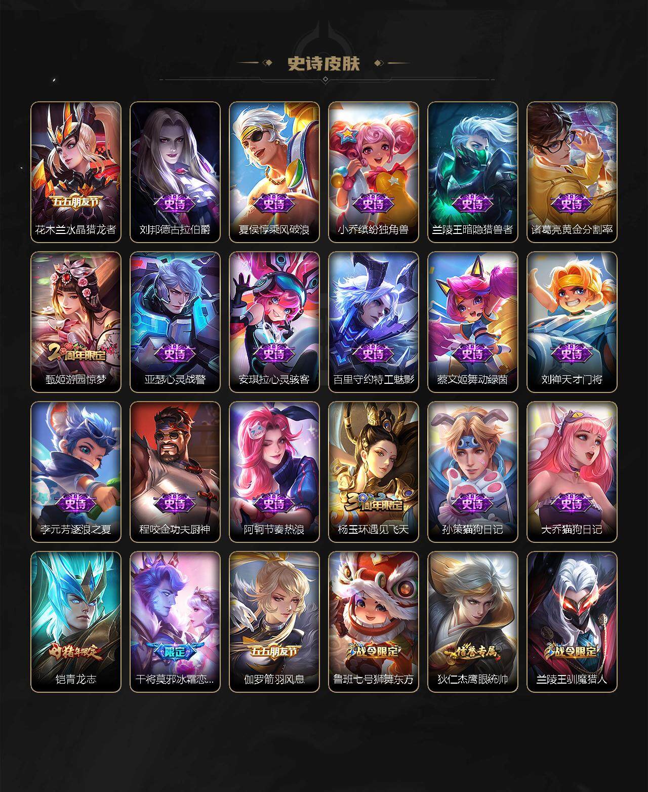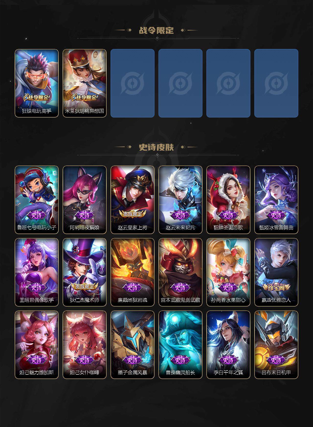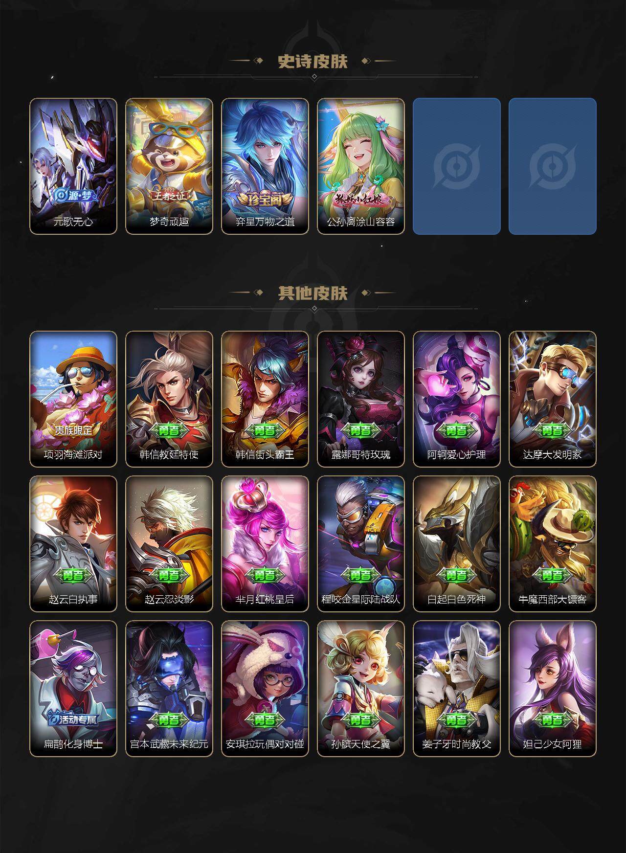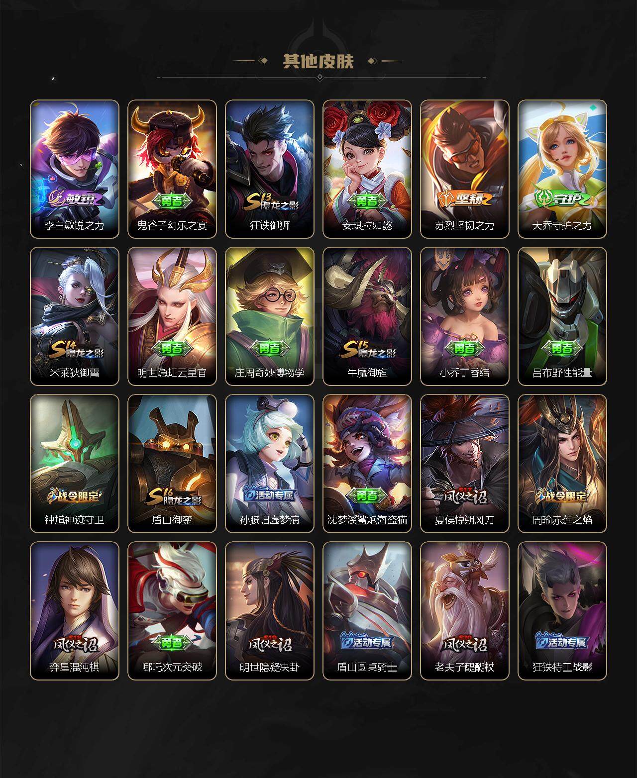 【限定皮肤】:白起狰,姜子牙天穹之誓,狄仁杰阴阳师,虞姬凯尔特女王,赵云皇家上将,墨子神迹守卫,嬴政优雅恋人,鲁班七号狮舞东方,庄周高山流水,白起夜都怪侠,芈月重明,周瑜赤莲之焰,元歌云间偶戏,元歌无心,夏侯惇朔风刀,甄姬游园惊梦,曹操烛龙,典韦穷奇,狄仁杰魔术师,狄仁杰万华元夜,达摩星际陆战队,达摩沙漠行僧,项羽海滩派对,老夫子醍醐杖,老夫子航海奇遇记,程咬金演武夺筹,韩信傲雪梅枪,王昭君午后时光,兰陵王驯魔猎人,兰陵王金庭之子,亚瑟潮玩骑士王,孙悟空孙行者,牛魔御旌,李元芳云中旅人,钟馗神迹守卫,钟馗驱傩正仪,杨玉环遇见飞天,干将莫邪冰霜恋舞曲,雅典娜黎明之约,蔡文姬繁星吟游,太乙真人饕餮,鬼谷子原初探秘者,诸葛亮时雨天司,铠青龙志,苏烈千军破阵,百里玄策原初追逐者,弈星混沌棋,梦奇顽趣,沈梦溪大漠名商,明世隐疑决卦,明世隐吟游魔法,裴擒虎李小龙,裴擒虎擒涛扼浪,狂铁御狮,狂铁电玩高手,米莱狄御霄,米莱狄胡桃异想国,伽罗天狼溯光者,盾山御銮,猪八戒猪悟能,上官婉儿梁祝,上官婉儿天狼绘梦者,嫦娥拒霜思,曜李逍遥 ,鲁班大师探海日志,桑启海盐诗旅,云缨鹤归松栖,张良古海寻踪,鬼谷子天穹祈灯,刘邦剑破天穹,周瑜熔金海岸