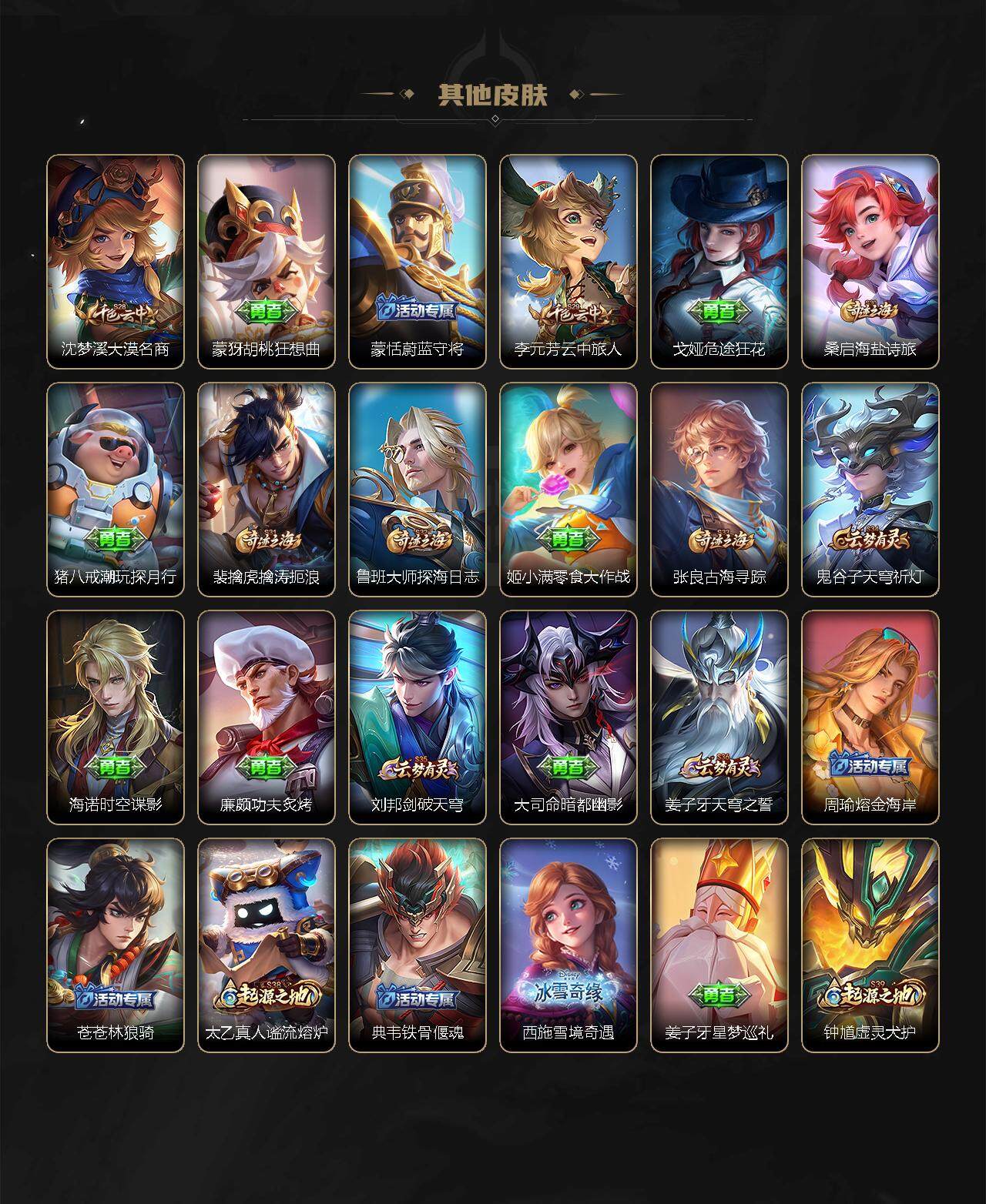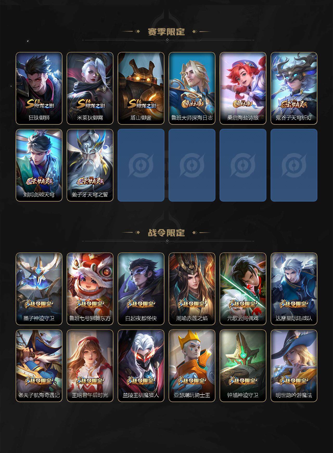 【赛季限定】:白起狰,芈月重明,夏侯惇朔风刀,曹操烛龙,典韦穷奇,狄仁杰万华元夜,达摩沙漠行僧,老夫子醍醐杖,程咬金演武夺筹,兰陵王金庭之子,张良古海寻踪,牛魔御旌,李元芳云中旅人,虞姬凯尔特女王,钟馗驱傩正仪,雅典娜黎明之约,太乙真人饕餮,鬼谷子原初探秘者,苏烈千军破阵,百里玄策原初追逐者,弈星混沌棋,梦奇顽趣,沈梦溪大漠名商,明世隐疑决卦,裴擒虎擒涛扼浪,狂铁御狮,米莱狄御霄,盾山御銮,鲁班大师探海日志,桑启海盐诗旅,鬼谷子天穹祈灯,刘邦剑破天穹,姜子牙天穹之誓