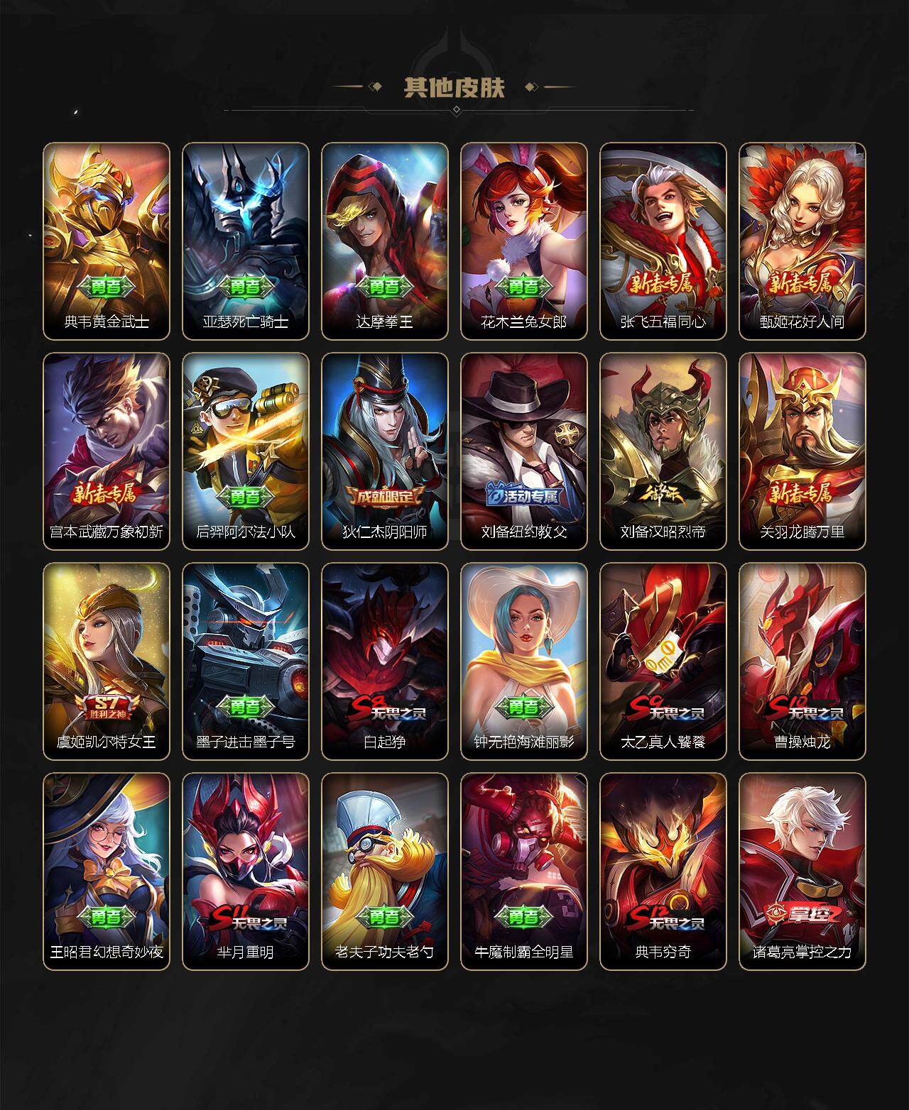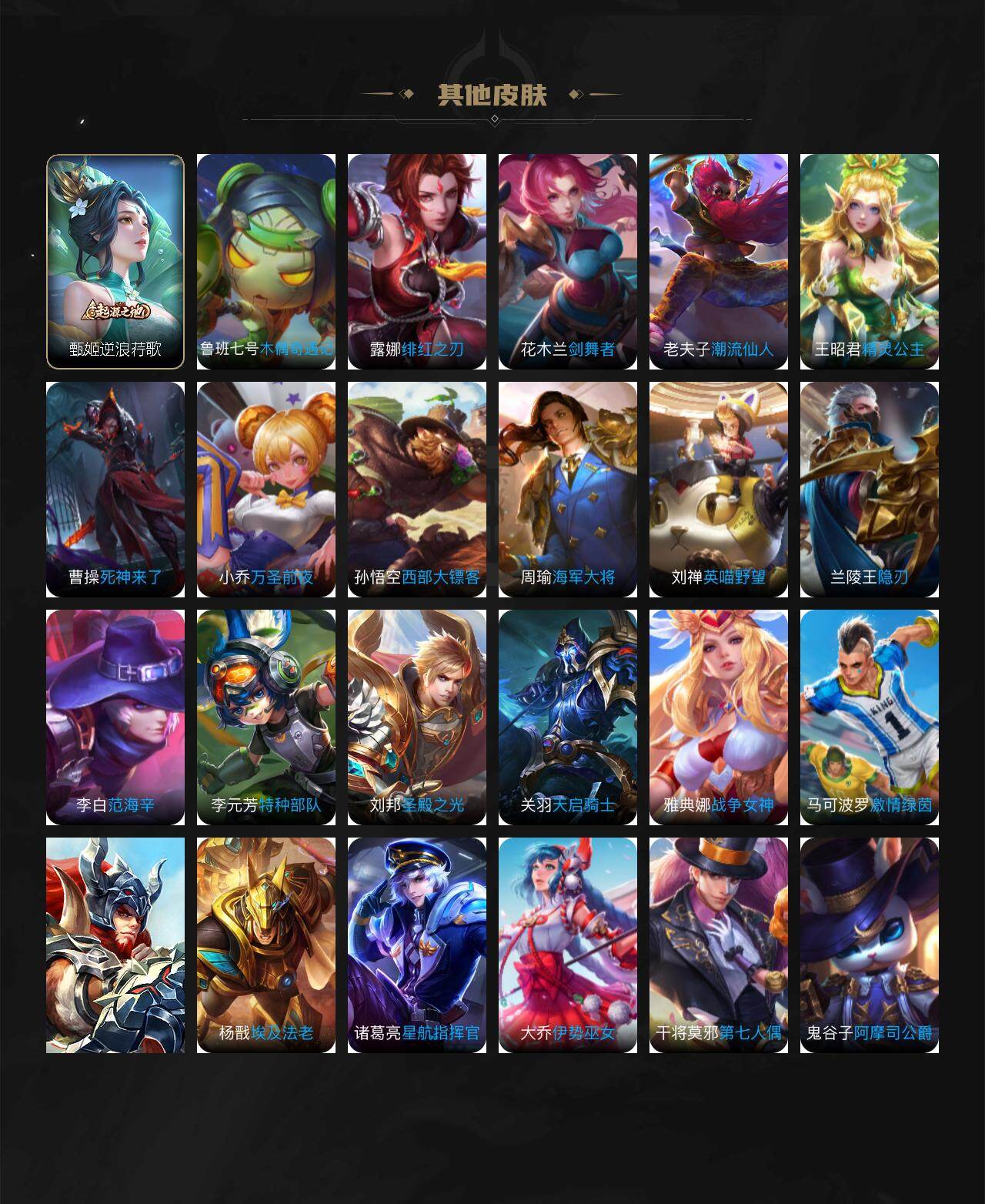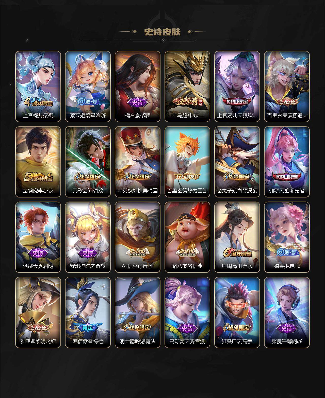 虞姬凯尔特女王,白起狰,太乙真人饕餮,曹操烛龙,芈月重明,典韦穷奇,狂铁御狮,米莱狄御霄,牛魔御旌,盾山御銮,夏侯惇朔风刀,明世隐疑决卦,老夫子醍醐杖,鬼谷子原初探秘者,狄仁杰万华元夜,程咬金演武夺筹,钟馗驱傩正仪,苏烈千军破阵,钟馗神迹守卫,鲁班七号狮舞东方,元歌云间偶戏,弈星混沌棋,达摩沙漠行僧,兰陵王金庭之子,沈梦溪大漠名商,李元芳云中旅人,桑启海盐诗旅,裴擒虎擒涛扼浪,鲁班大师探海日志,张良古海寻踪