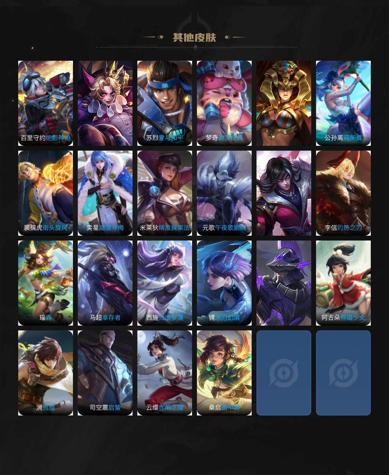 伽罗箭羽风息,李元芳逐浪之夏,大乔猫狗日记,孙策猫狗日记,阿轲节奏热浪,诸葛亮黄金分割率,王昭君偶像歌手,阿轲暗夜猫娘,吕布末日机甲,鲁班七号电玩小子,橘右京修罗,刘禅天才门将,安琪拉心灵骇客,安琪拉时之奇旅,程咬金功夫厨神,刘邦德古拉伯爵,兰陵王暗隐猎兽者,曹操幽灵船长,宫本武藏鬼剑武藏,亚瑟心灵战警,杨戬天秀·启明,蔡文姬舞动绿茵,廉颇地狱岩魂,小乔缤纷独角兽,夏侯惇乘风破浪,花木兰水晶猎龙者,百里玄策热力回旋,墨子金属风暴,百里玄策原初追逐者,貂蝉圣诞恋歌,百里守约特工魅影,嫦娥拒霜思,雅典娜黎明之约,李白千年之狐,高渐离天秀·音浪,张良千筹问战