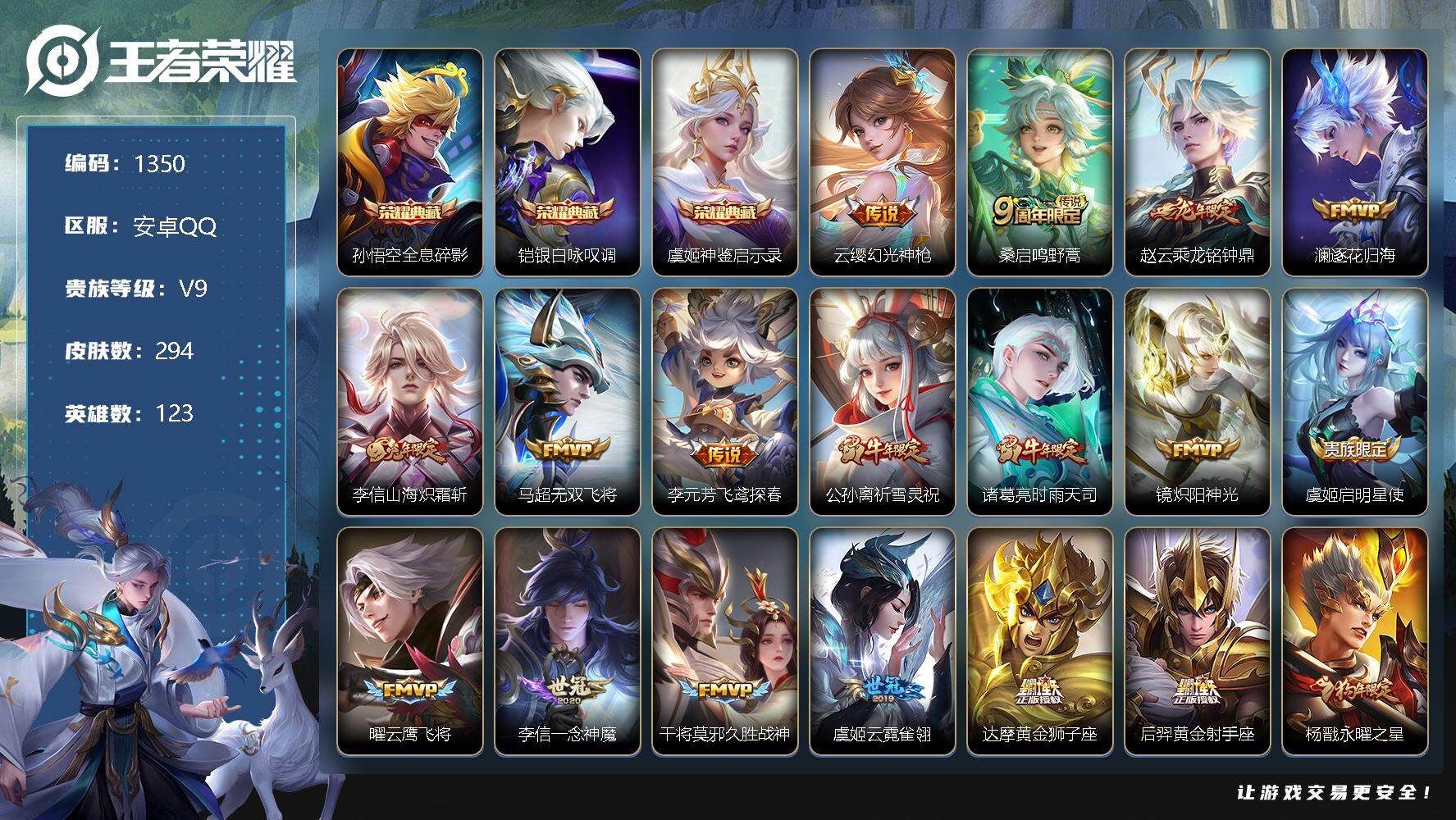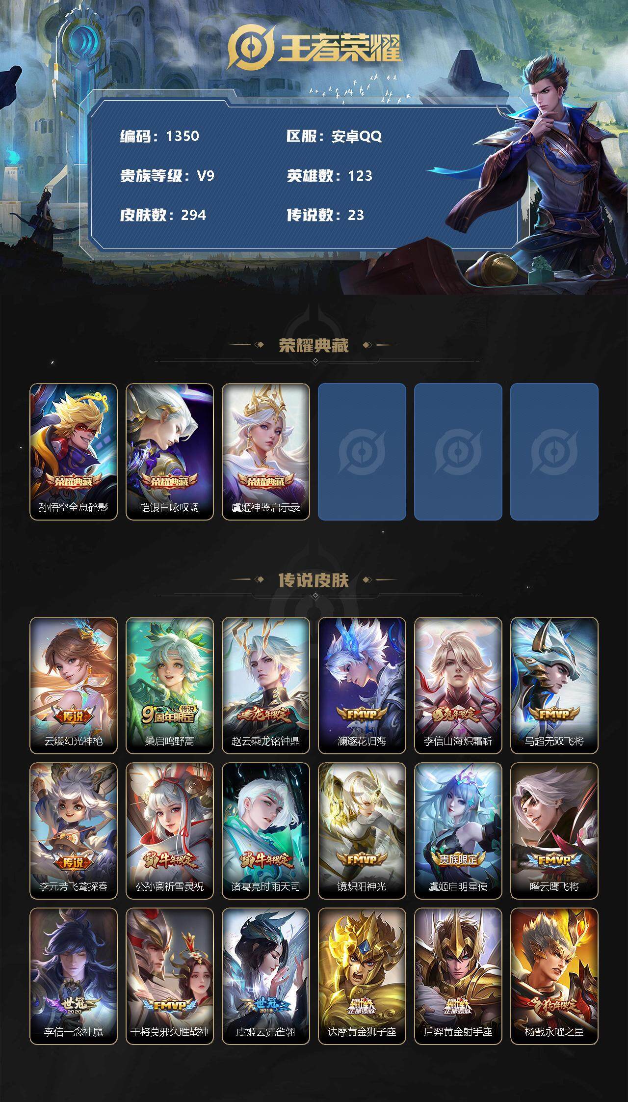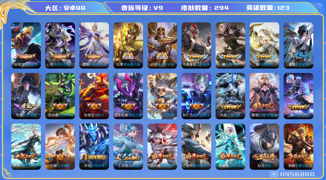 [11456880]【商品标题】:安卓Q-V8-永恒钻石II段位-123英雄-294皮肤-3典藏-0珍品无双-0无双-0珍品传说-23传说-89史诗