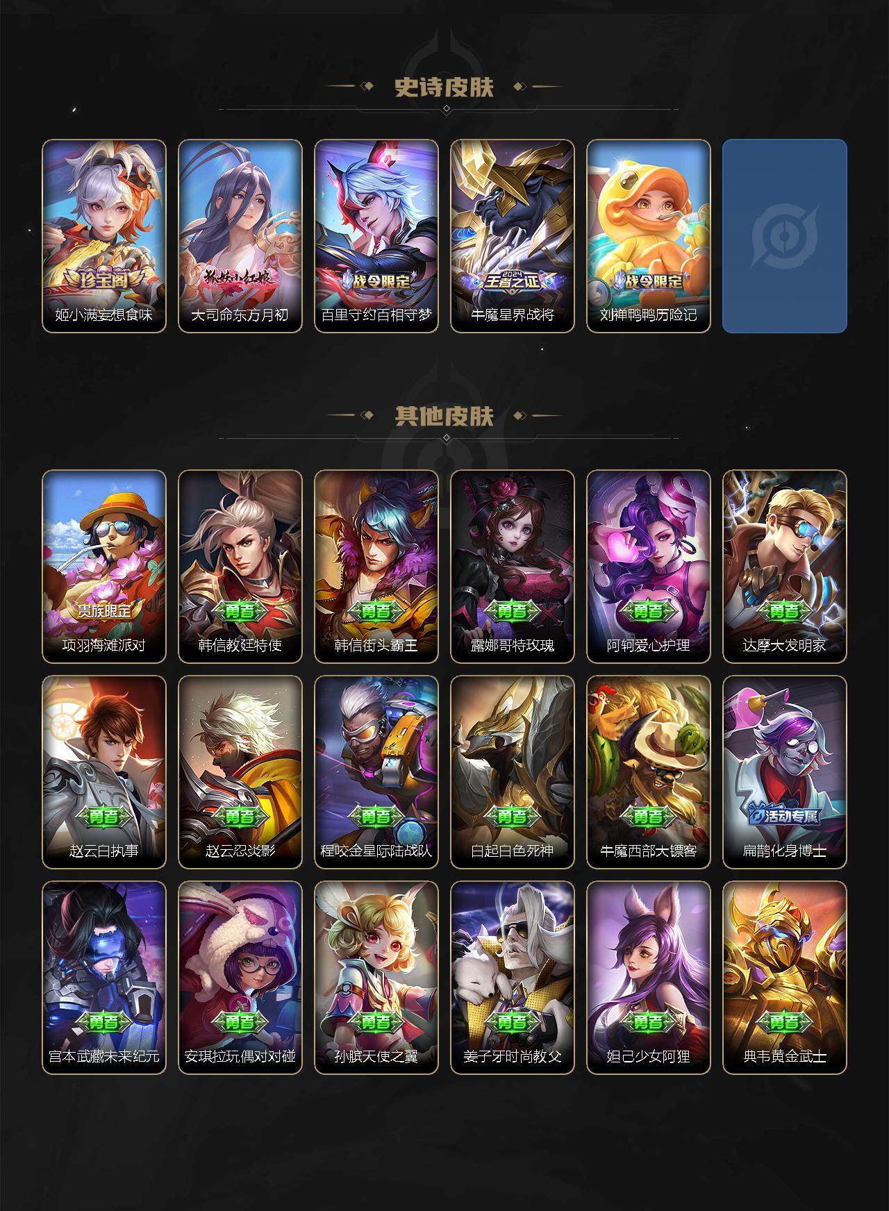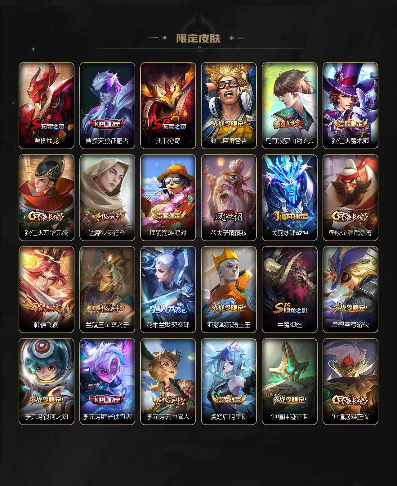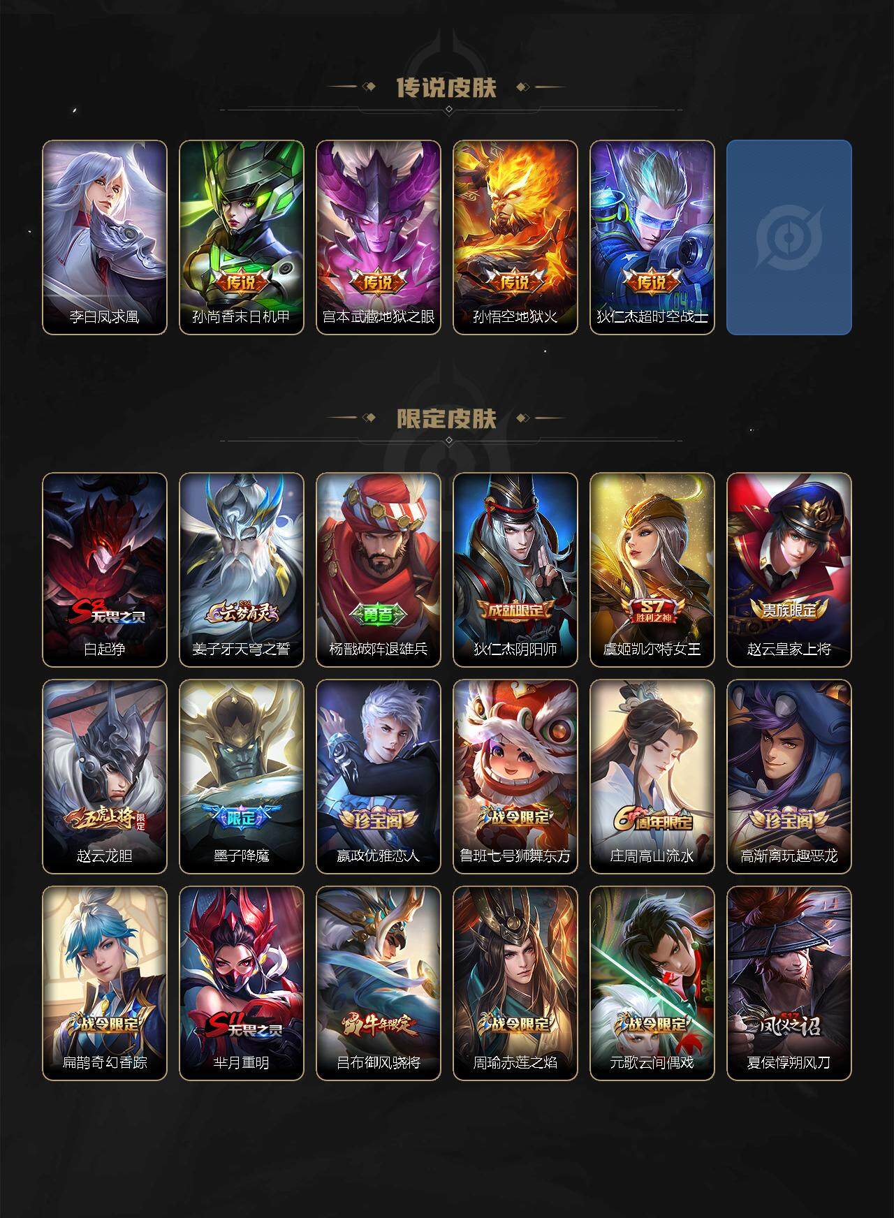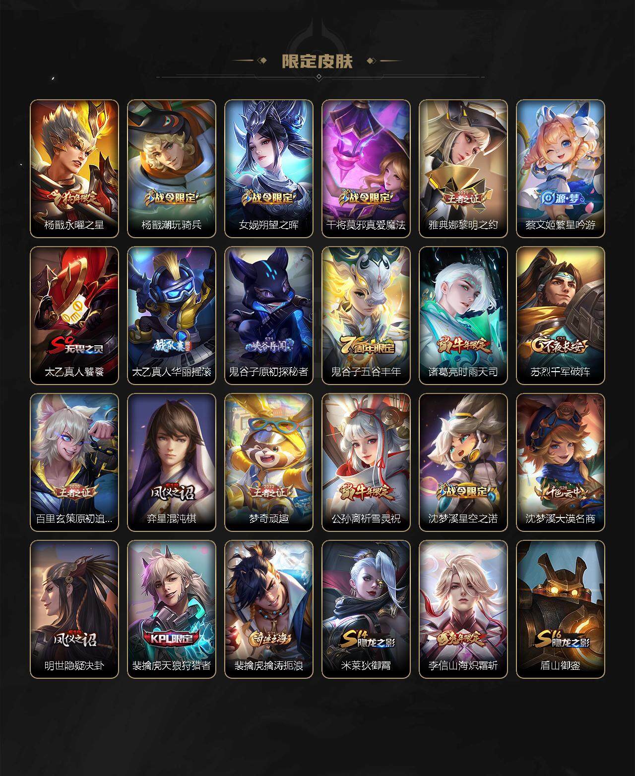 【限定皮肤】:白起狰,姜子牙天穹之誓,杨戬破阵退雄兵,狄仁杰阴阳师,虞姬凯尔特女王,赵云皇家上将,赵云龙胆,墨子降魔,嬴政优雅恋人,鲁班七号狮舞东方,庄周高山流水,高渐离玩趣恶龙,扁鹊奇幻香踪,芈月重明,吕布御风骁将,周瑜赤莲之焰,元歌云间偶戏,夏侯惇朔风刀,曹操烛龙,曹操天狼征服者,典韦穷奇,典韦蓝屏警告,马可波罗山海玄木吟,狄仁杰魔术师,狄仁杰万华元夜,达摩沙漠行僧,项羽海滩派对,老夫子醍醐杖,关羽冰锋战神,程咬金演武夺筹,韩信飞衡,兰陵王金庭之子,花木兰默契交锋,亚瑟潮玩骑士王,牛魔御旌,后羿圣弓游侠,李元芳银河之约,李元芳匿光侦查者,李元芳云中旅人,虞姬启明星使,钟馗神迹守卫,钟馗驱傩正仪,杨戬永曜之星,杨戬潮玩骑兵,女娲朔望之晖,干将莫邪真爱魔法,雅典娜黎明之约,蔡文姬繁星吟游,太乙真人饕餮,太乙真人华丽摇滚,鬼谷子原初探秘者,鬼谷子五谷丰年,诸葛亮时雨天司,苏烈千军破阵,百里玄策原初追逐者,弈星混沌棋,梦奇顽趣,公孙离祈雪灵祝,沈梦溪星空之诺,沈梦溪大漠名商,明世隐疑决卦,裴擒虎天狼狩猎者,裴擒虎擒涛扼浪,米莱狄御霄,李信山海炽霜斩,盾山御銮,上官婉儿梁祝,嫦娥暖冬兔眠,鲁班大师探海日志,镜匿光追影者,桑启海盐诗旅,暃星界游侠,阿古朵江河有灵,张良古海寻踪,蒙犽百解令,蒙恬荣光圣徽,鬼谷子天穹祈灯,姬小满妄想食味,赵云乘龙铭钟鼎,刘邦剑破天穹,程咬金群星魔术团,周瑜熔金海岸