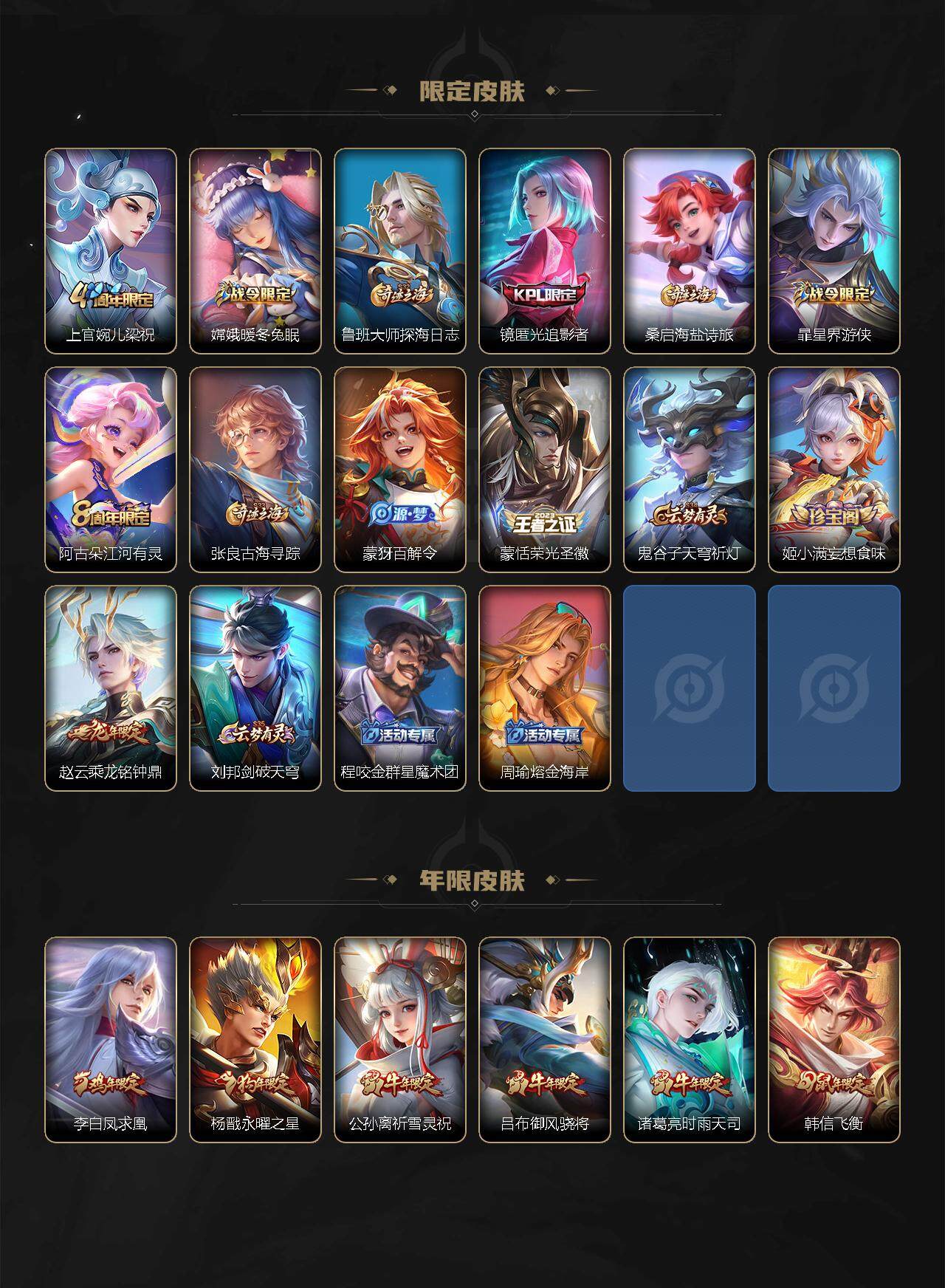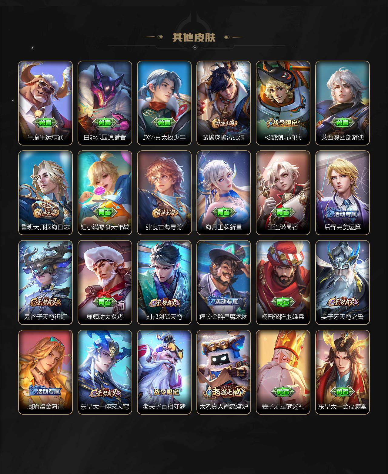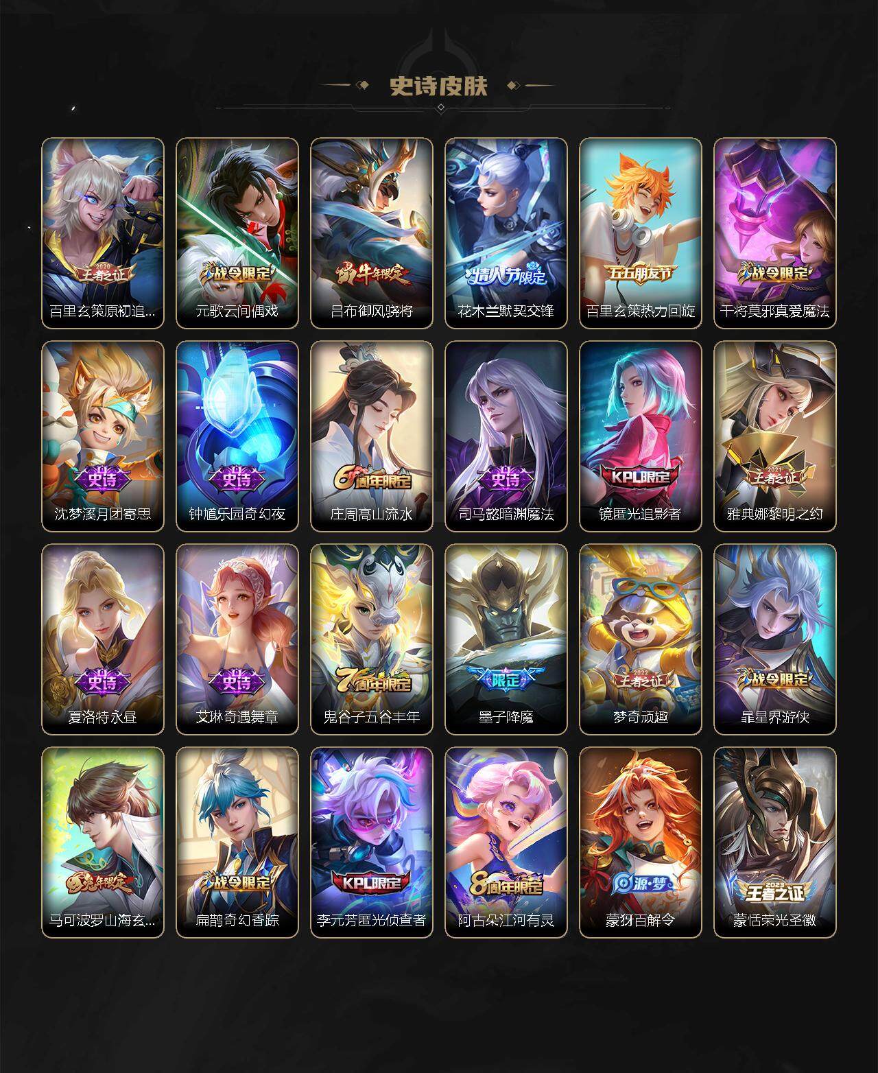 【限定皮肤】:白起狰,姜子牙天穹之誓,杨戬破阵退雄兵,狄仁杰阴阳师,虞姬凯尔特女王,赵云皇家上将,赵云龙胆,墨子降魔,嬴政优雅恋人,鲁班七号狮舞东方,庄周高山流水,高渐离玩趣恶龙,扁鹊奇幻香踪,芈月重明,吕布御风骁将,周瑜赤莲之焰,元歌云间偶戏,夏侯惇朔风刀,曹操烛龙,曹操天狼征服者,典韦穷奇,典韦蓝屏警告,马可波罗山海玄木吟,狄仁杰魔术师,狄仁杰万华元夜,达摩沙漠行僧,项羽海滩派对,老夫子醍醐杖,关羽冰锋战神,程咬金演武夺筹,韩信飞衡,兰陵王金庭之子,花木兰默契交锋,亚瑟潮玩骑士王,牛魔御旌,后羿圣弓游侠,李元芳银河之约,李元芳匿光侦查者,李元芳云中旅人,虞姬启明星使,钟馗神迹守卫,钟馗驱傩正仪,杨戬永曜之星,杨戬潮玩骑兵,女娲朔望之晖,干将莫邪真爱魔法,雅典娜黎明之约,蔡文姬繁星吟游,太乙真人饕餮,太乙真人华丽摇滚,鬼谷子原初探秘者,鬼谷子五谷丰年,诸葛亮时雨天司,苏烈千军破阵,百里玄策原初追逐者,弈星混沌棋,梦奇顽趣,公孙离祈雪灵祝,沈梦溪星空之诺,沈梦溪大漠名商,明世隐疑决卦,裴擒虎天狼狩猎者,裴擒虎擒涛扼浪,米莱狄御霄,李信山海炽霜斩,盾山御銮,上官婉儿梁祝,嫦娥暖冬兔眠,鲁班大师探海日志,镜匿光追影者,桑启海盐诗旅,暃星界游侠,阿古朵江河有灵,张良古海寻踪,蒙犽百解令,蒙恬荣光圣徽,鬼谷子天穹祈灯,姬小满妄想食味,赵云乘龙铭钟鼎,刘邦剑破天穹,程咬金群星魔术团,周瑜熔金海岸