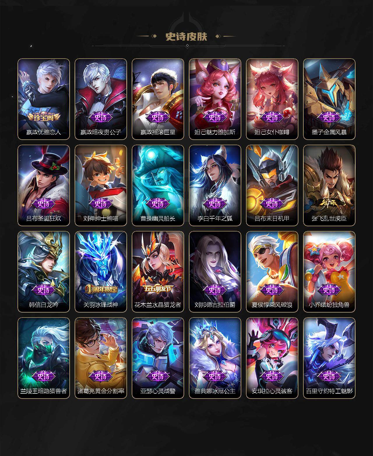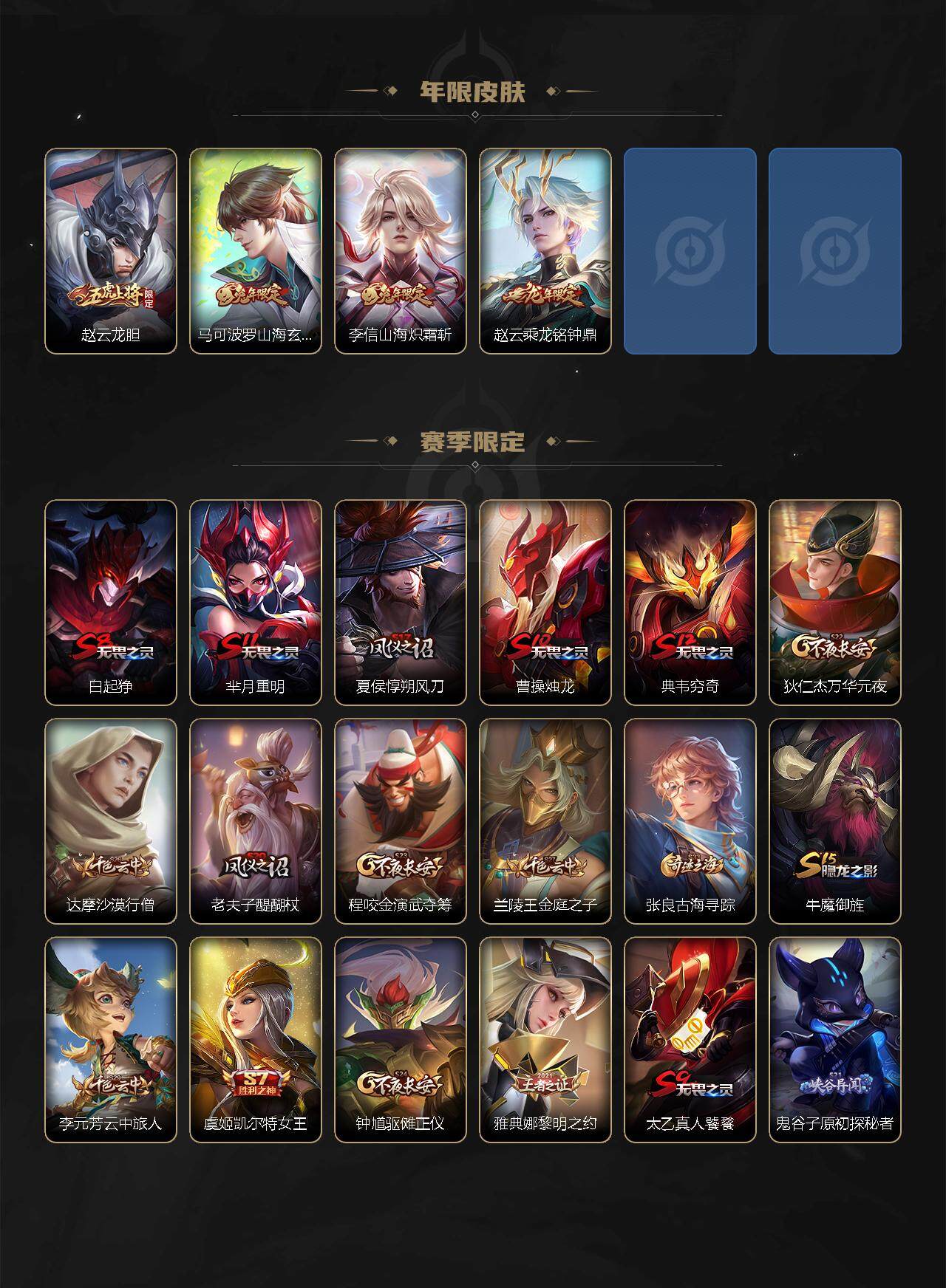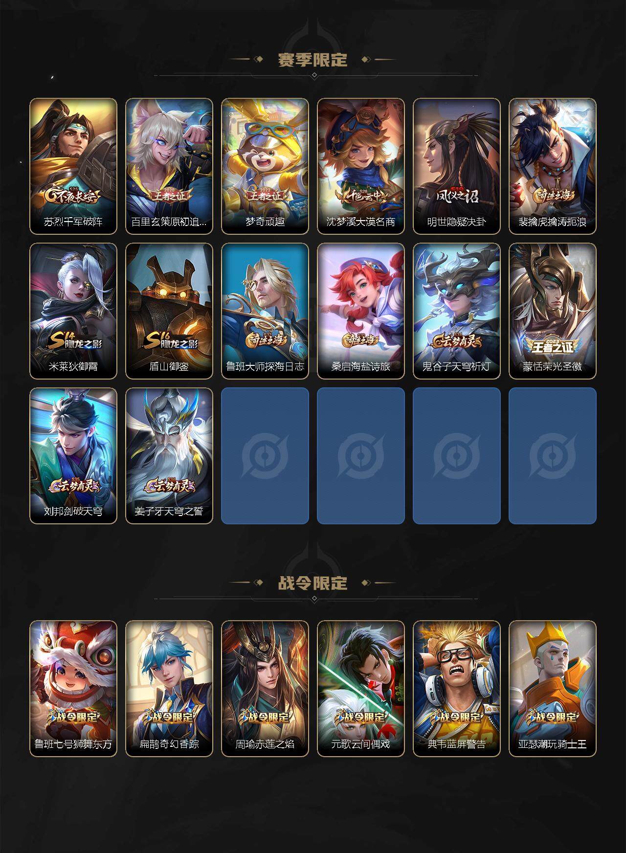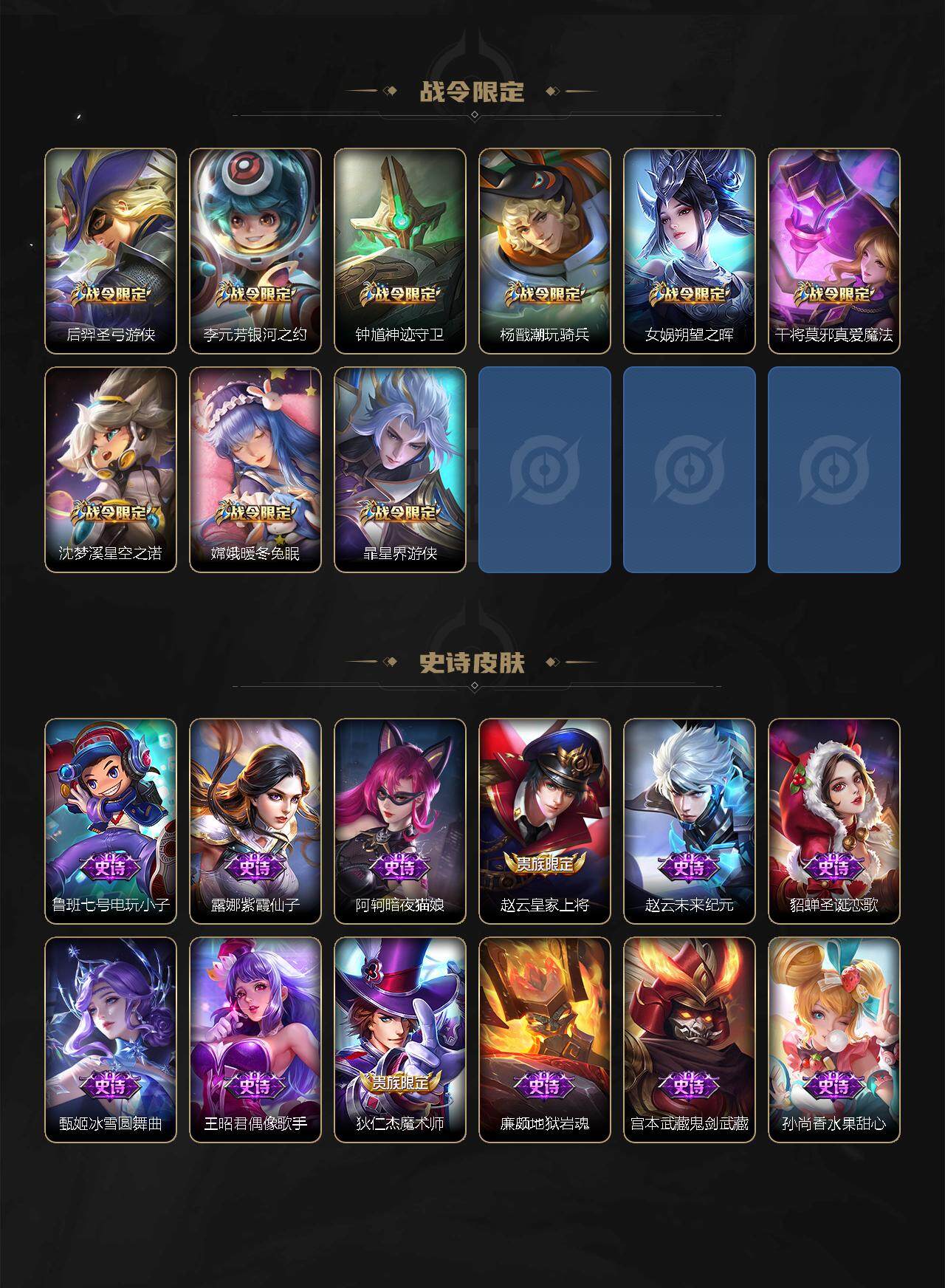 【限定皮肤】:白起狰,姜子牙天穹之誓,杨戬破阵退雄兵,狄仁杰阴阳师,虞姬凯尔特女王,赵云皇家上将,赵云龙胆,墨子降魔,嬴政优雅恋人,鲁班七号狮舞东方,庄周高山流水,高渐离玩趣恶龙,扁鹊奇幻香踪,芈月重明,吕布御风骁将,周瑜赤莲之焰,元歌云间偶戏,夏侯惇朔风刀,曹操烛龙,曹操天狼征服者,典韦穷奇,典韦蓝屏警告,马可波罗山海玄木吟,狄仁杰魔术师,狄仁杰万华元夜,达摩沙漠行僧,项羽海滩派对,老夫子醍醐杖,关羽冰锋战神,程咬金演武夺筹,韩信飞衡,兰陵王金庭之子,花木兰默契交锋,亚瑟潮玩骑士王,牛魔御旌,后羿圣弓游侠,李元芳银河之约,李元芳匿光侦查者,李元芳云中旅人,虞姬启明星使,钟馗神迹守卫,钟馗驱傩正仪,杨戬永曜之星,杨戬潮玩骑兵,女娲朔望之晖,干将莫邪真爱魔法,雅典娜黎明之约,蔡文姬繁星吟游,太乙真人饕餮,太乙真人华丽摇滚,鬼谷子原初探秘者,鬼谷子五谷丰年,诸葛亮时雨天司,苏烈千军破阵,百里玄策原初追逐者,弈星混沌棋,梦奇顽趣,公孙离祈雪灵祝,沈梦溪星空之诺,沈梦溪大漠名商,明世隐疑决卦,裴擒虎天狼狩猎者,裴擒虎擒涛扼浪,米莱狄御霄,李信山海炽霜斩,盾山御銮,上官婉儿梁祝,嫦娥暖冬兔眠,鲁班大师探海日志,镜匿光追影者,桑启海盐诗旅,暃星界游侠,阿古朵江河有灵,张良古海寻踪,蒙犽百解令,蒙恬荣光圣徽,鬼谷子天穹祈灯,姬小满妄想食味,赵云乘龙铭钟鼎,刘邦剑破天穹,程咬金群星魔术团,周瑜熔金海岸