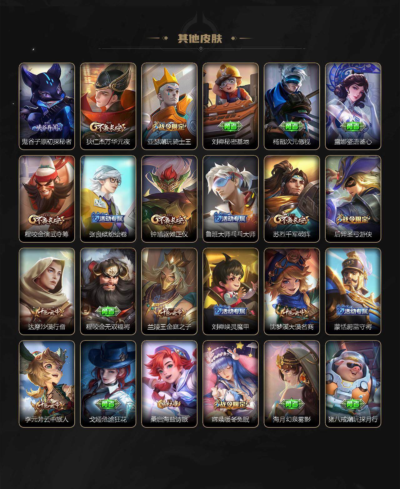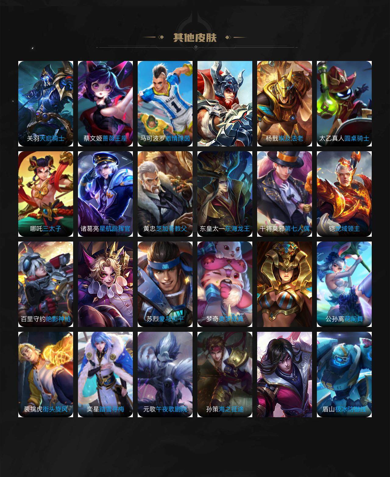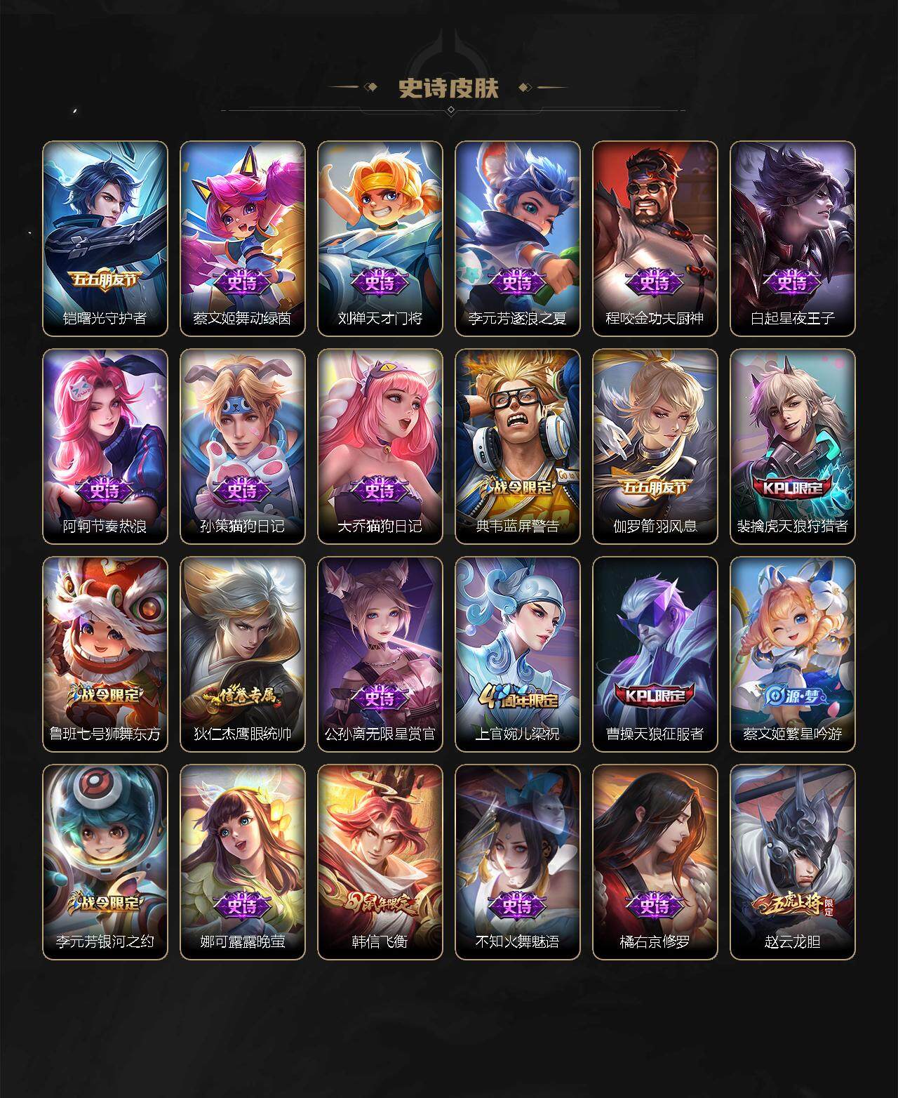 娜可露露晚萤,伽罗箭羽风息,李元芳逐浪之夏,不知火舞魅语,公孙离无限星赏官,大乔猫狗日记,孙策猫狗日记,阿轲节奏热浪,露娜紫霞仙子,诸葛亮黄金分割率,王昭君偶像歌手,韩信白龙吟,阿轲暗夜猫娘,雅典娜冰冠公主,吕布末日机甲,鲁班七号电玩小子,橘右京修罗,嬴政摇滚巨星,刘禅绅士熊喵,刘禅天才门将,白起星夜王子,安琪拉心灵骇客,程咬金功夫厨神,刘邦德古拉伯爵,兰陵王暗隐猎兽者,曹操幽灵船长,宫本武藏鬼剑武藏,司马懿暗渊魔法,亚瑟心灵战警,钟馗乐园奇幻夜,蔡文姬舞动绿茵,廉颇地狱岩魂,小乔缤纷独角兽,夏侯惇乘风破浪,花木兰水晶猎龙者,铠曙光守护者,百里玄策热力回旋,墨子金属风暴,百里玄策原初追逐者,吕布圣诞狂欢,貂蝉圣诞恋歌,百里守约特工魅影,嬴政暗夜贵公子,雅典娜黎明之约,李白千年之狐,夏洛特永昼,艾琳奇遇舞章,李元芳匿光侦查者,蒙犽百解令