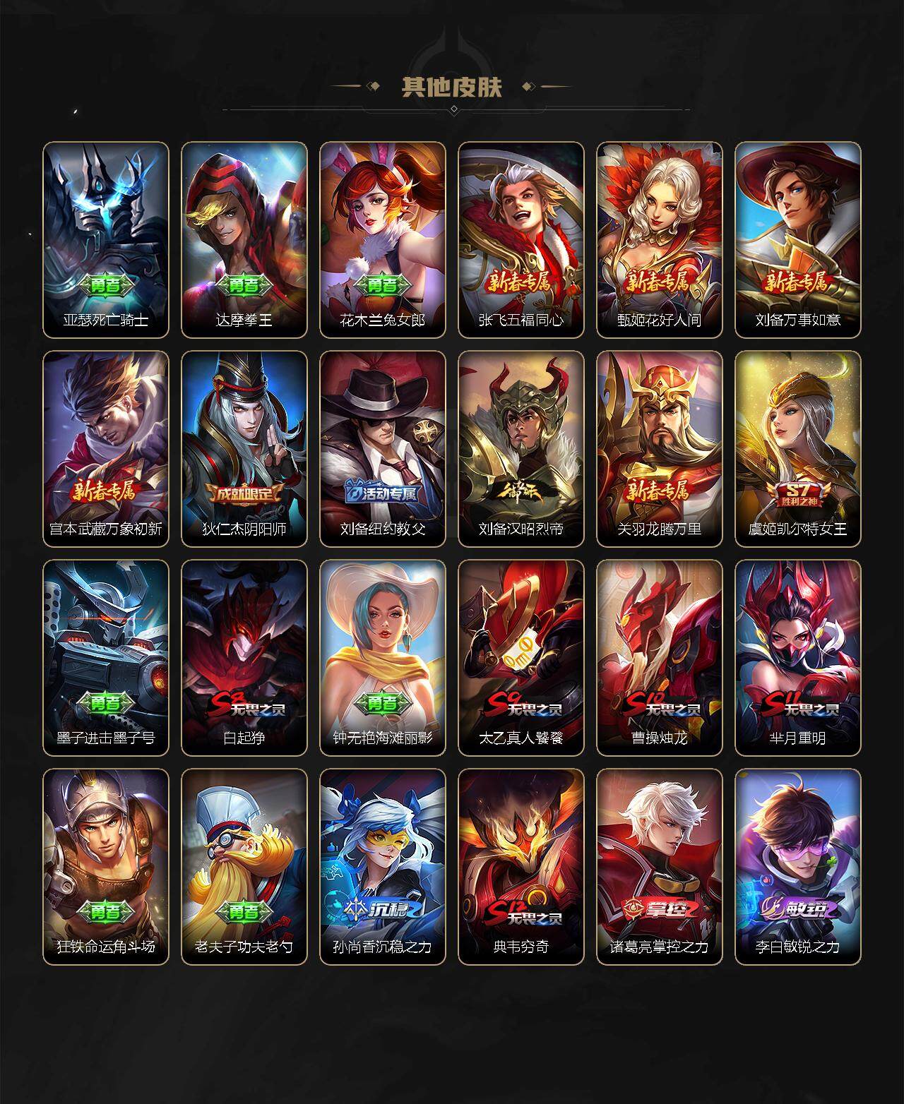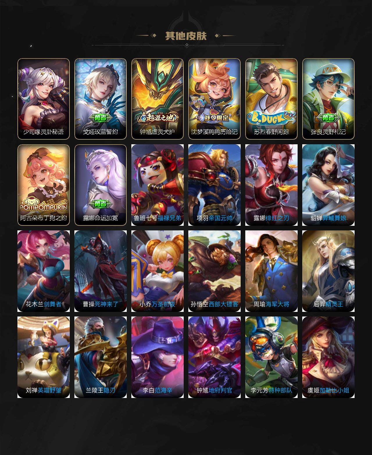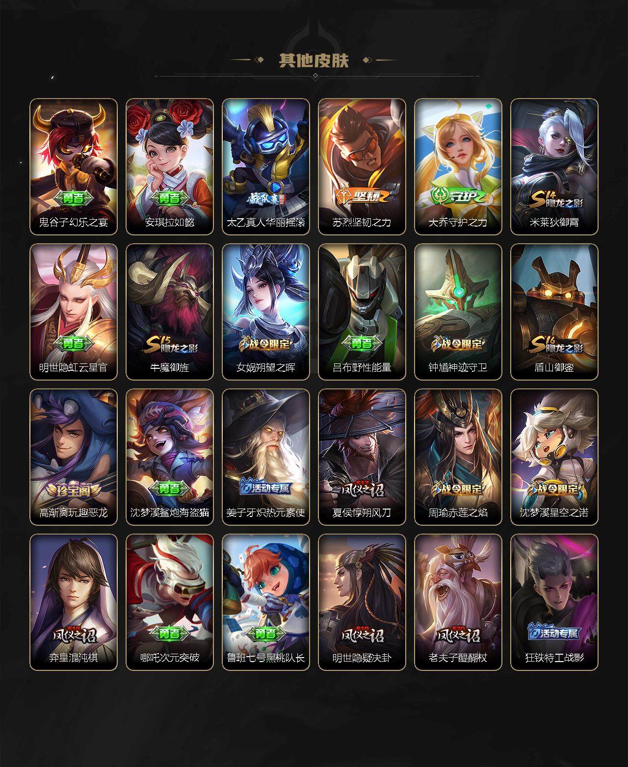 娜可露露晚萤,伽罗箭羽风息,李元芳逐浪之夏,不知火舞魅语,公孙离无限星赏官,大乔猫狗日记,孙策猫狗日记,阿轲节奏热浪,露娜紫霞仙子,诸葛亮黄金分割率,王昭君偶像歌手,韩信白龙吟,阿轲暗夜猫娘,雅典娜冰冠公主,吕布末日机甲,鲁班七号电玩小子,橘右京修罗,嬴政摇滚巨星,刘禅绅士熊喵,刘禅天才门将,白起星夜王子,安琪拉心灵骇客,程咬金功夫厨神,刘邦德古拉伯爵,兰陵王暗隐猎兽者,曹操幽灵船长,宫本武藏鬼剑武藏,司马懿暗渊魔法,亚瑟心灵战警,钟馗乐园奇幻夜,蔡文姬舞动绿茵,廉颇地狱岩魂,小乔缤纷独角兽,夏侯惇乘风破浪,花木兰水晶猎龙者,铠曙光守护者,百里玄策热力回旋,墨子金属风暴,百里玄策原初追逐者,吕布圣诞狂欢,貂蝉圣诞恋歌,百里守约特工魅影,嬴政暗夜贵公子,雅典娜黎明之约,李白千年之狐,夏洛特永昼,艾琳奇遇舞章,李元芳匿光侦查者,蒙犽百解令