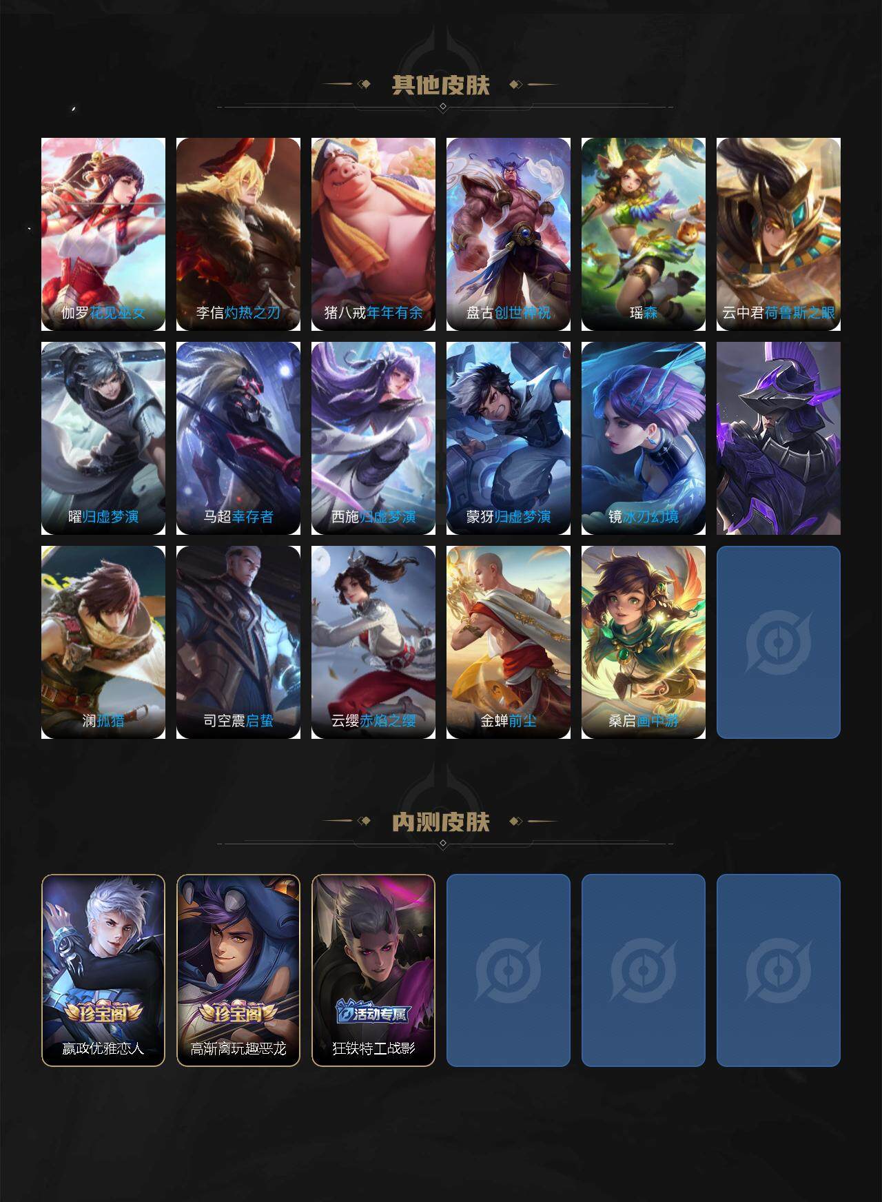 虞姬凯尔特女王,白起狰,太乙真人饕餮,曹操烛龙,芈月重明,典韦穷奇,米莱狄御霄,牛魔御旌,盾山御銮,夏侯惇朔风刀,明世隐疑决卦,老夫子醍醐杖,鬼谷子原初探秘者,狄仁杰万华元夜,程咬金演武夺筹,钟馗驱傩正仪,苏烈千军破阵,女娲朔望之晖,典韦蓝屏警告,钟馗神迹守卫,鲁班七号狮舞东方,沈梦溪星空之诺,李元芳银河之约,元歌云间偶戏,弈星混沌棋,达摩沙漠行僧,兰陵王金庭之子,沈梦溪大漠名商,李元芳云中旅人,桑启海盐诗旅,裴擒虎擒涛扼浪,鲁班大师探海日志,张良古海寻踪