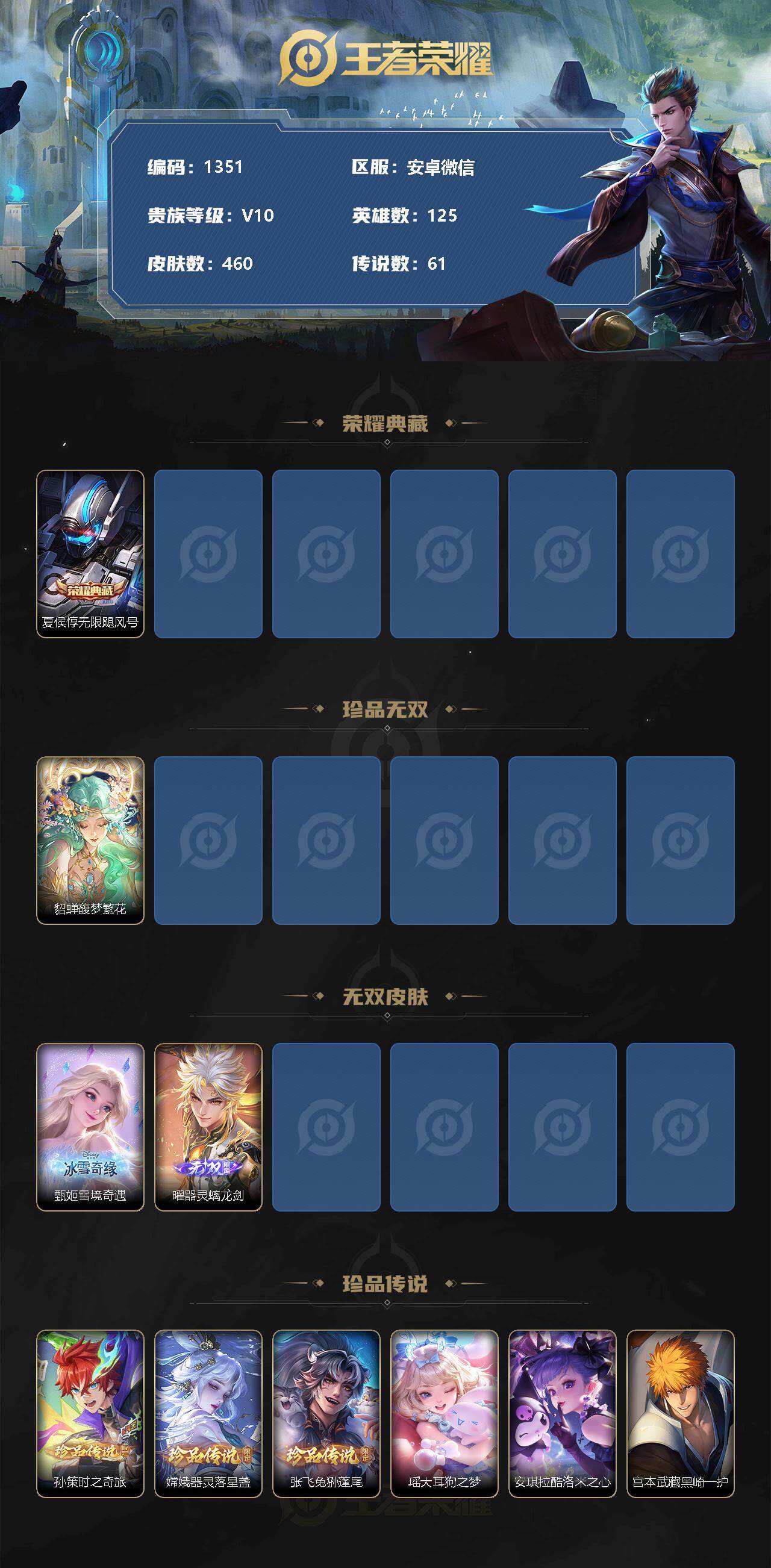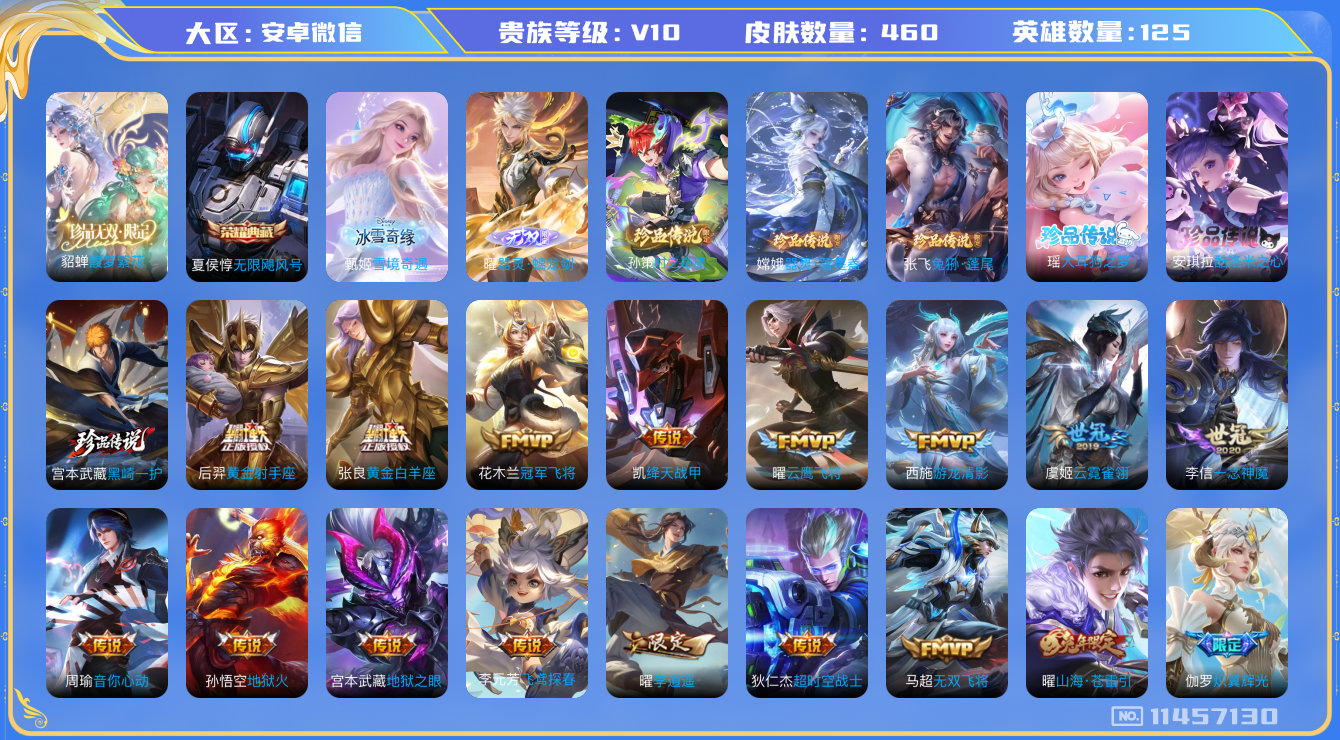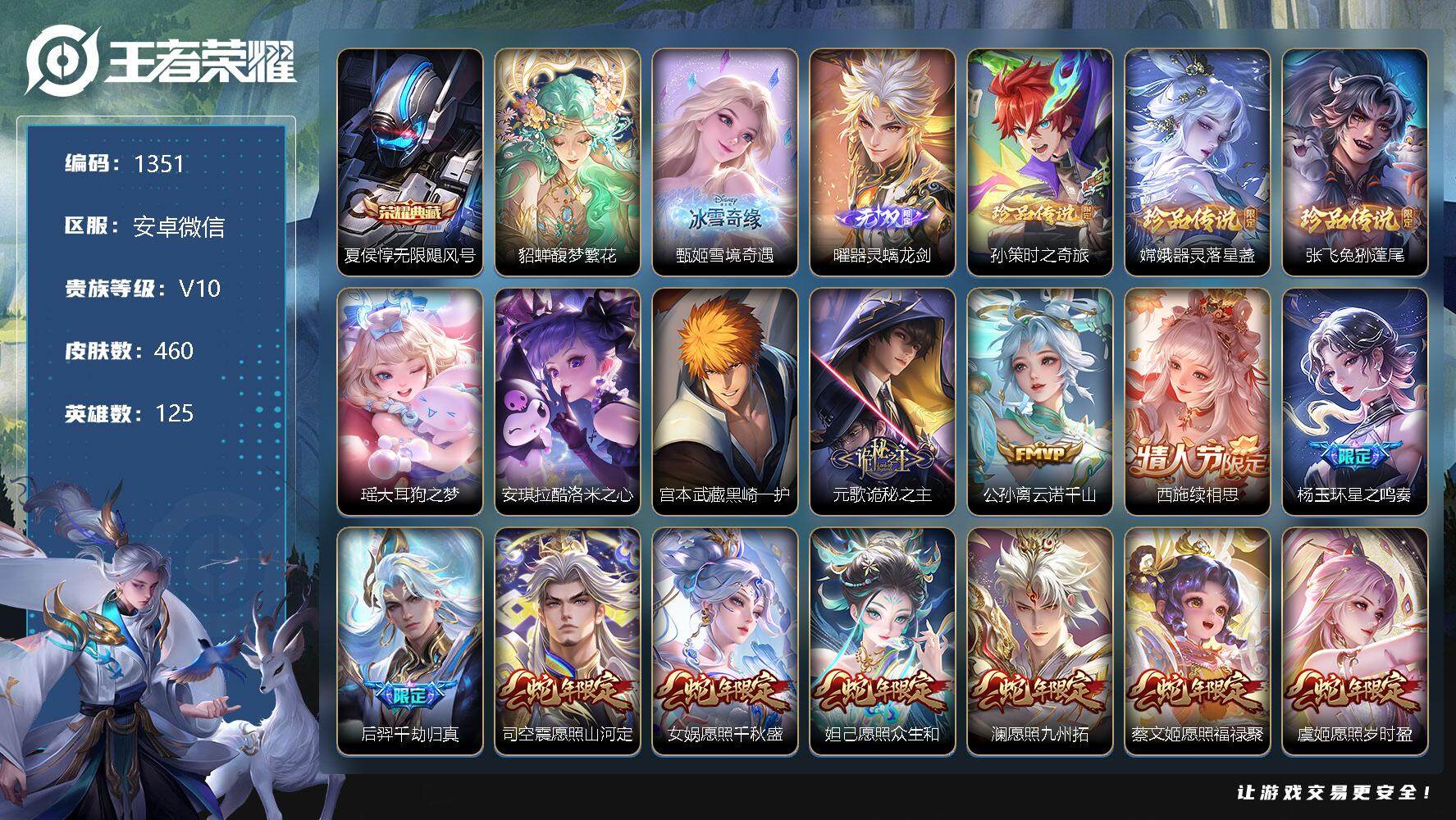 [11457130]【商品标题】:安卓WX-V10-最强王者段位-125英雄-460皮肤-1典藏-1珍品无双-2无双-6珍品传说-61传说-141史诗