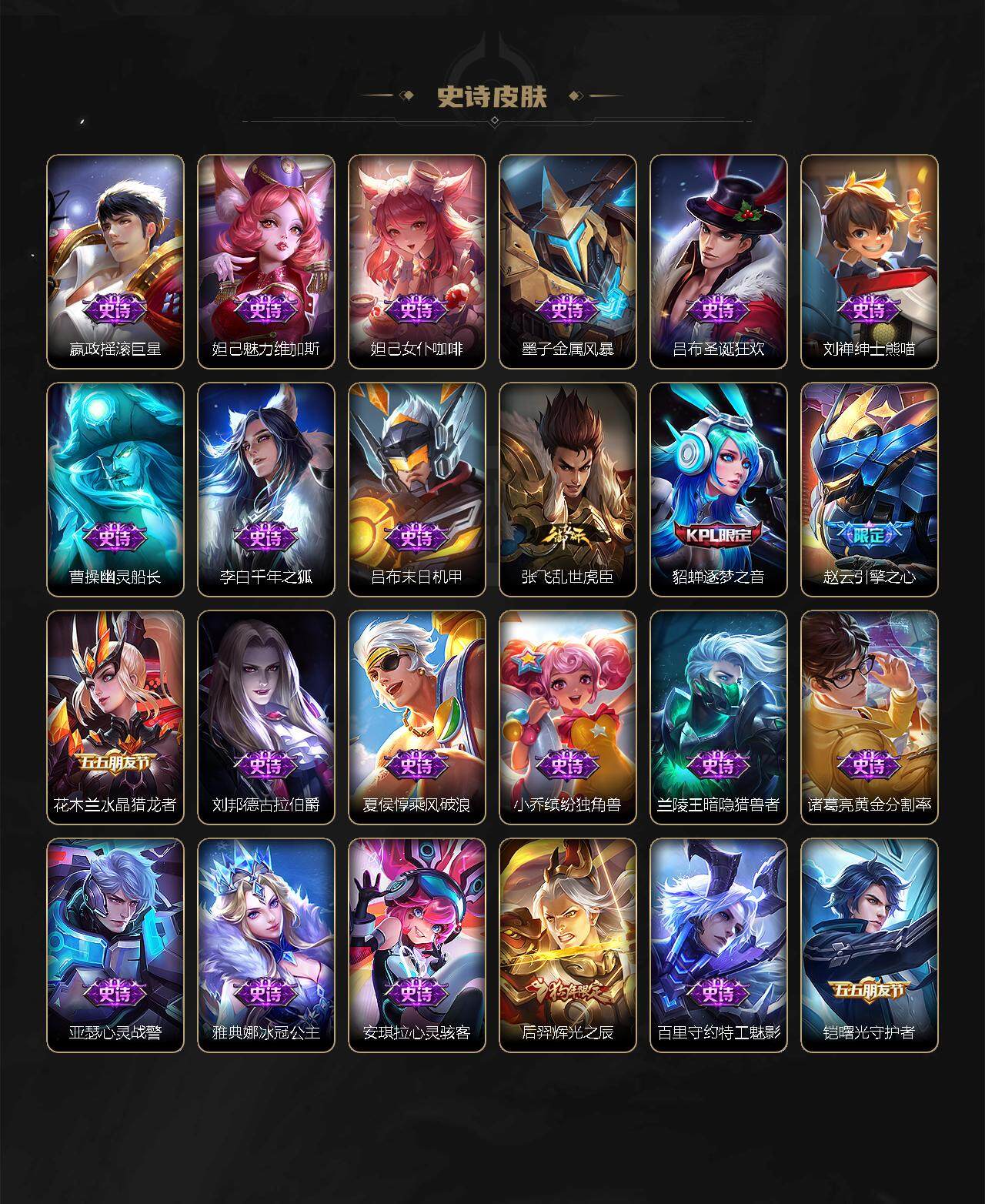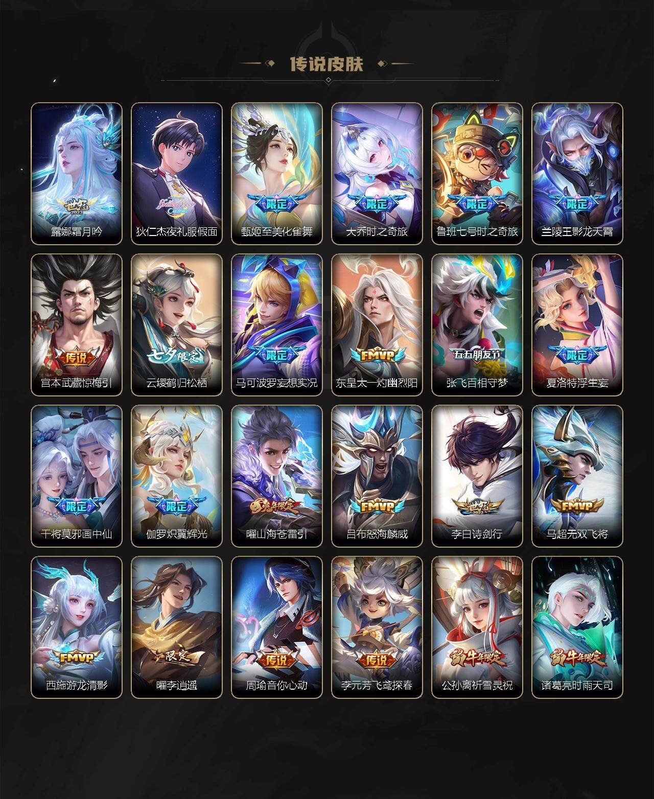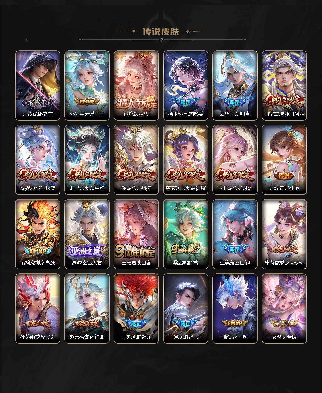 【传说皮肤】:元歌诡秘之主,公孙离云诺千山,西施续相思,杨玉环星之鸣奏,后羿千劫归真,司空震愿照山河定,女娲愿照千秋盛,妲己愿照众生和,澜愿照九州拓,蔡文姬愿照福禄聚,虞姬愿照岁时盈,云缨幻光神枪,裴擒虎祥瑞亨通,嬴政玄雷天君,王昭君映山客,桑启鸣野蒿,亚连落雪白狼,孙尚香乘龙问璇玑,孙策乘龙淬吴钩,赵云乘龙铭钟鼎,马超琥珀纪元,铠琥珀纪元,澜逐花归海,艾琳觅芳踪,露娜霜月吟,狄仁杰夜礼服假面,甄姬至美化雀舞,大乔时之奇旅,鲁班七号时之奇旅,兰陵王影龙天霄,宫本武藏惊梅引,云缨鹤归松栖,马可波罗妄想实况,东皇太一灼幽烈阳,张飞百相守梦,夏洛特浮生妄,干将莫邪画中仙,伽罗炽翼辉光,曜山海苍雷引,吕布怒海麟威,李白诗剑行,马超无双飞将,西施游龙清影,曜李逍遥 ,周瑜音你心动,李元芳飞鸢探春,公孙离祈雪灵祝,诸葛亮时雨天司,铠绛天战甲,虞姬启明星使,曜云鹰飞将,李信一念神魔,张良黄金白羊座,虞姬云霓雀翎,百里玄策白虎志,花木兰冠军飞将,后羿黄金射手座,杨戬永曜之星,宫本武藏地狱之眼,孙悟空地狱火,狄仁杰超时空战士