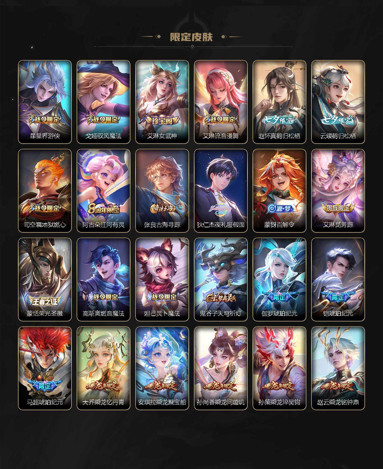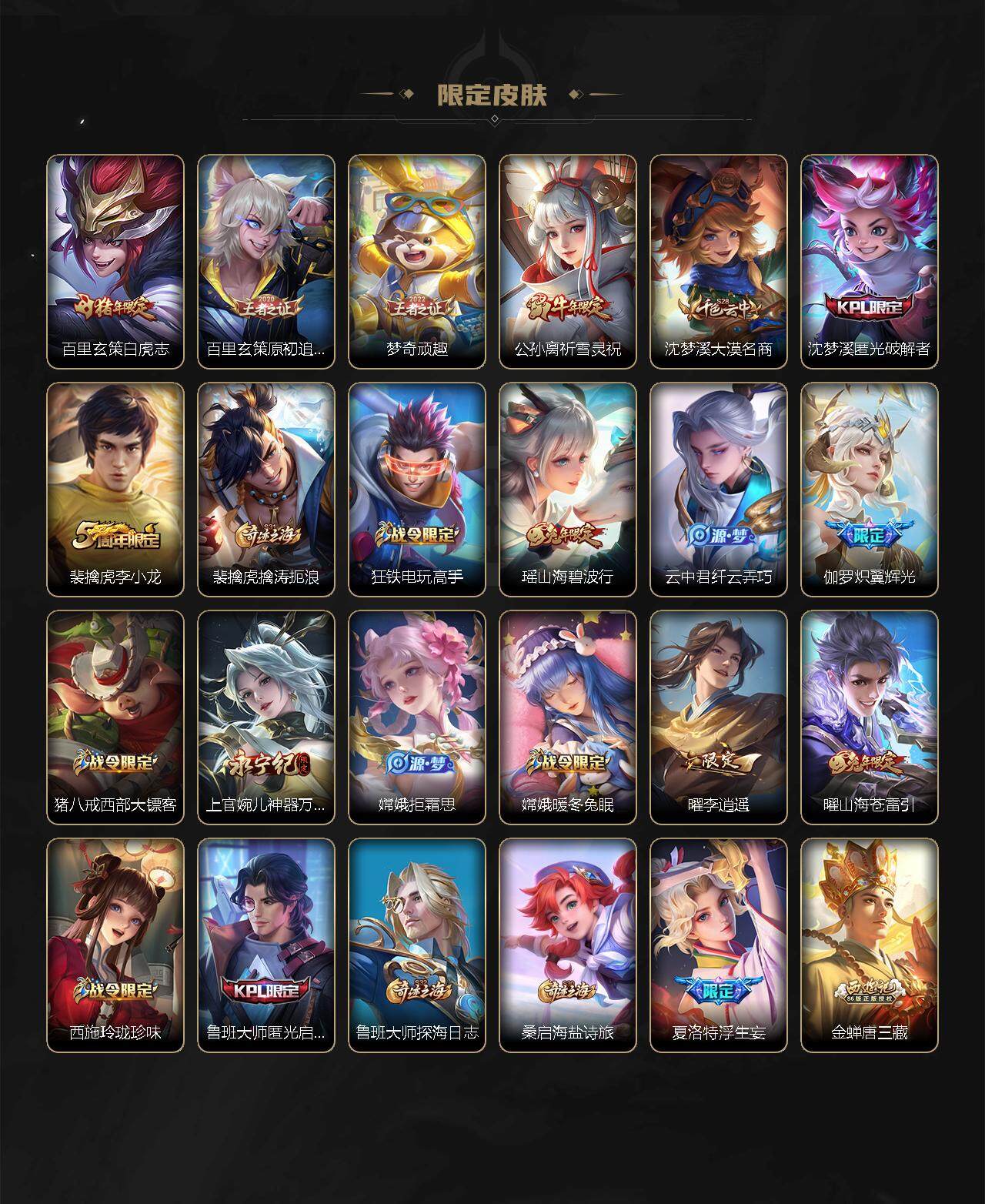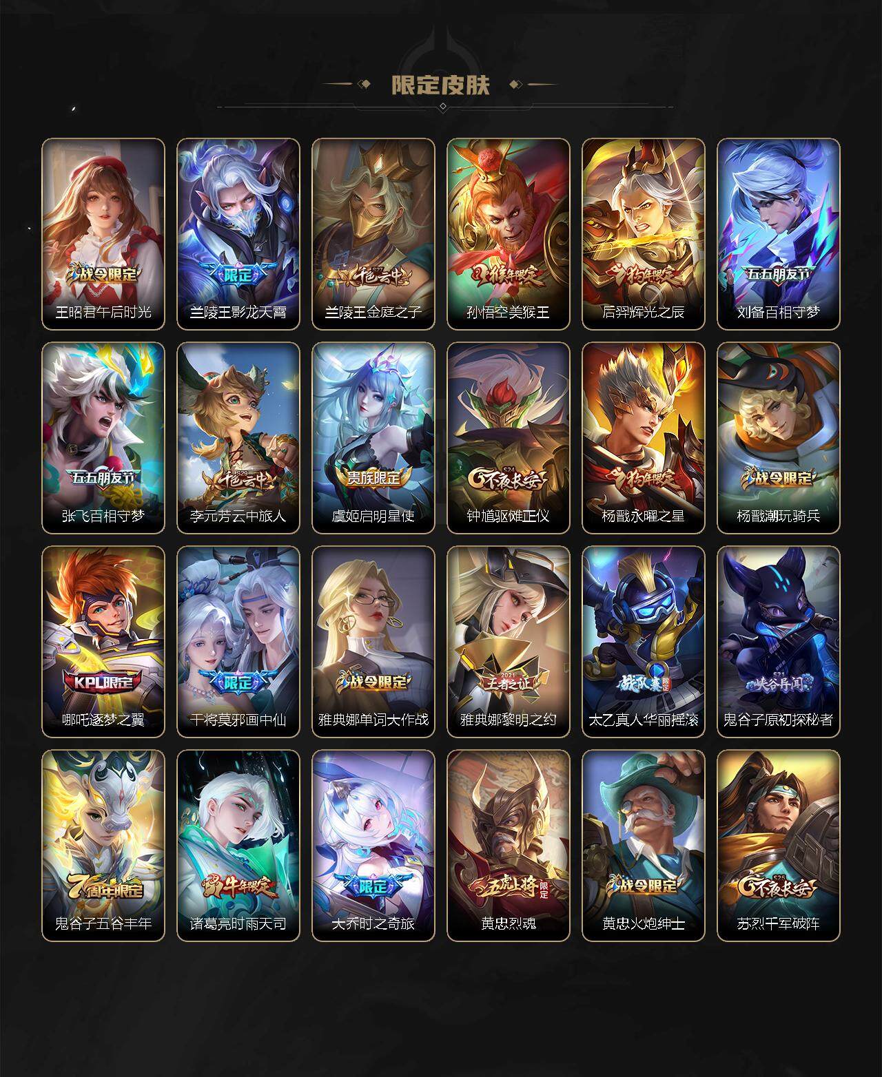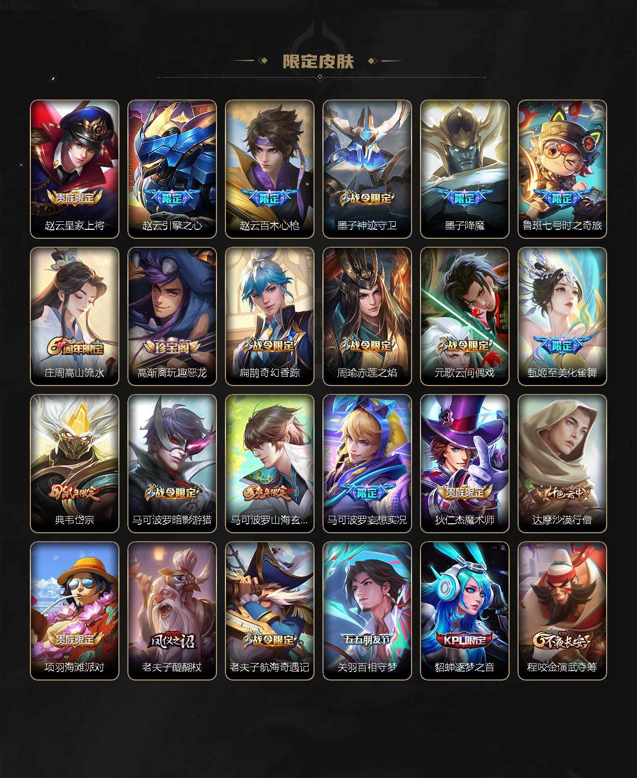 【限定皮肤】:蒙犽顽岩魄,蔡文姬夏日便利店,虞姬夏日便利店,姜子牙天穹之誓,狄仁杰阴阳师,廉颇寅虎御盾,赵云皇家上将,赵云引擎之心,赵云百木心枪,墨子神迹守卫,墨子降魔,鲁班七号时之奇旅,庄周高山流水,高渐离玩趣恶龙,扁鹊奇幻香踪,周瑜赤莲之焰,元歌云间偶戏,甄姬至美化雀舞,典韦岱宗,马可波罗暗影游猎,马可波罗山海玄木吟,马可波罗妄想实况,狄仁杰魔术师,达摩沙漠行僧,项羽海滩派对,老夫子醍醐杖,老夫子航海奇遇记,关羽百相守梦,貂蝉逐梦之音,程咬金演武夺筹,王昭君午后时光,兰陵王影龙天霄,兰陵王金庭之子,孙悟空美猴王,后羿辉光之辰,刘备百相守梦,张飞百相守梦,李元芳云中旅人,虞姬启明星使,钟馗驱傩正仪,杨戬永曜之星,杨戬潮玩骑兵,哪吒逐梦之翼,干将莫邪画中仙,雅典娜单词大作战,雅典娜黎明之约,太乙真人华丽摇滚,鬼谷子原初探秘者
