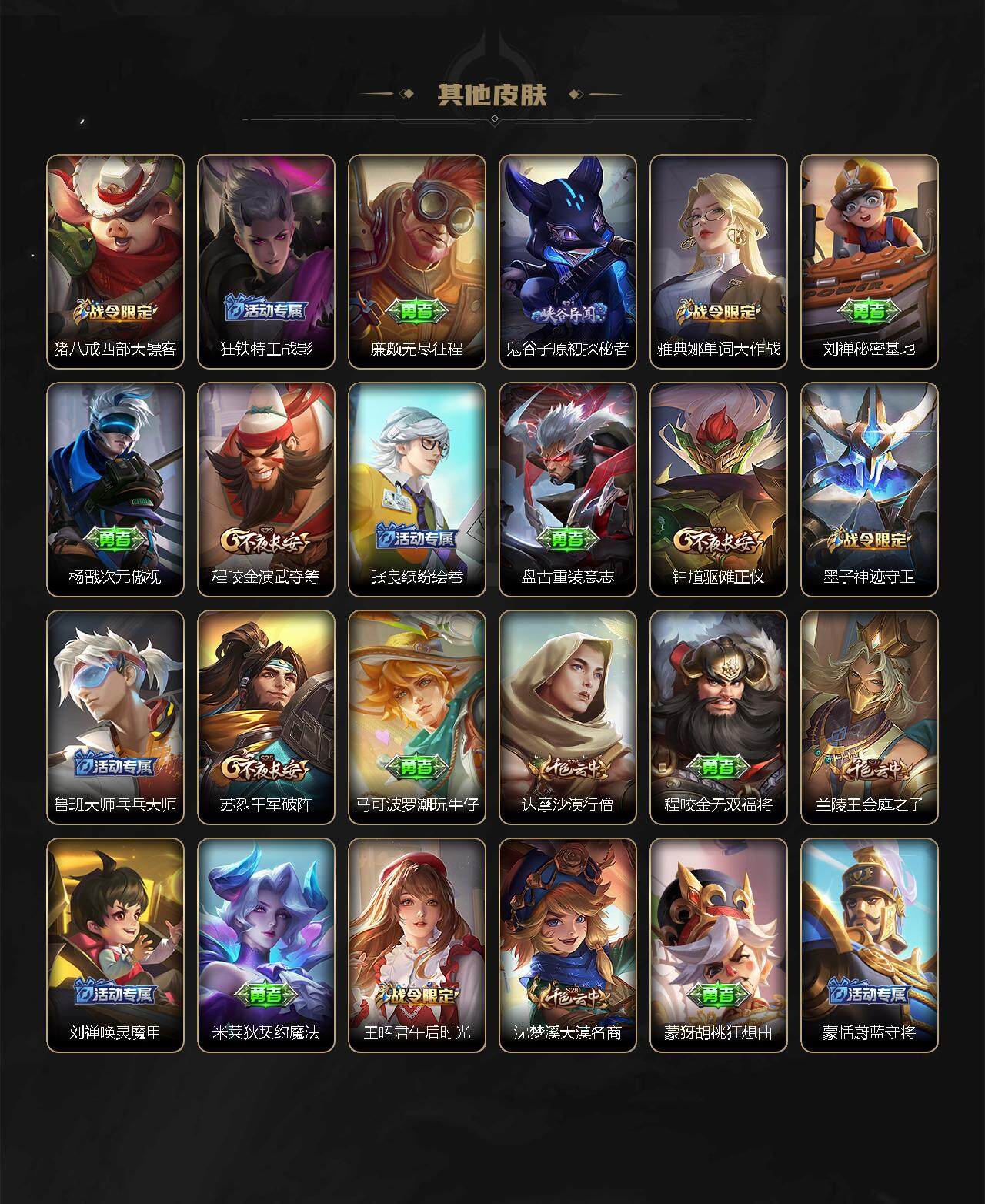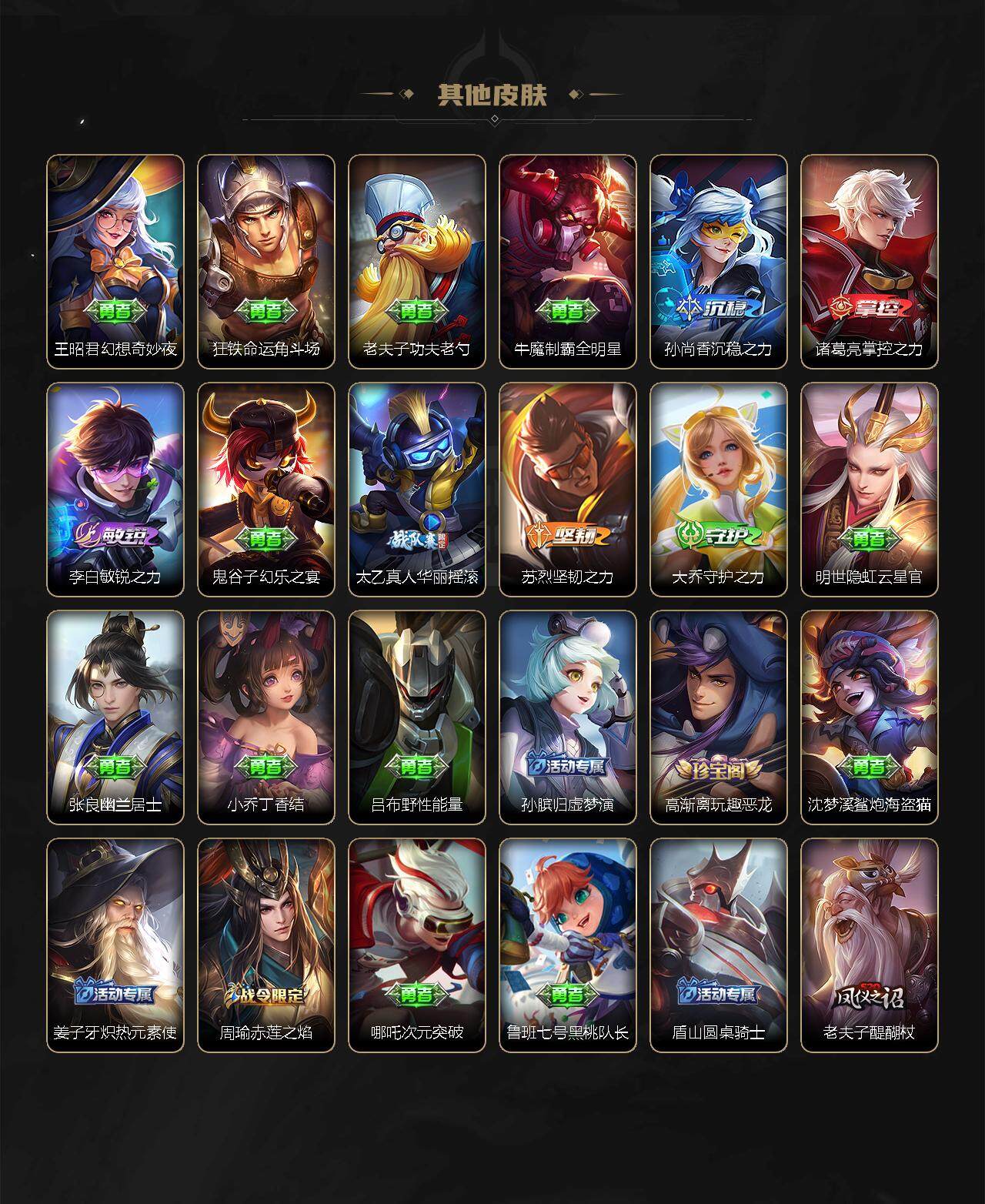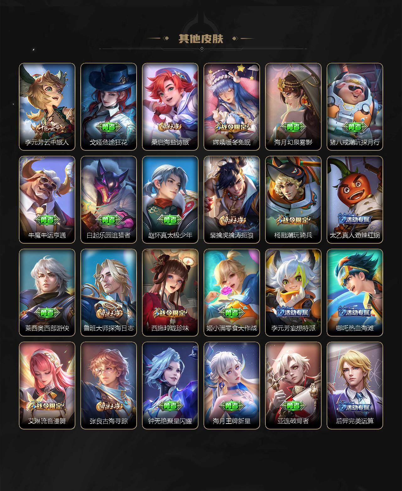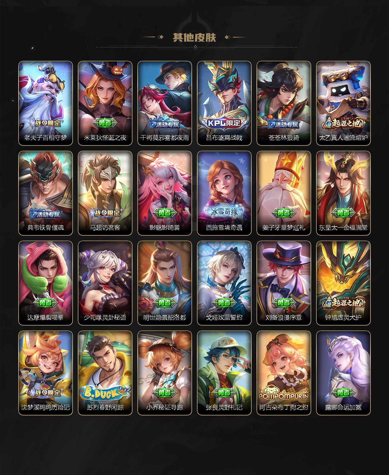 【限定皮肤】:蒙犽顽岩魄,蔡文姬夏日便利店,虞姬夏日便利店,姜子牙天穹之誓,狄仁杰阴阳师,廉颇寅虎御盾,赵云皇家上将,赵云引擎之心,赵云百木心枪,墨子神迹守卫,墨子降魔,鲁班七号时之奇旅,庄周高山流水,高渐离玩趣恶龙,扁鹊奇幻香踪,周瑜赤莲之焰,元歌云间偶戏,甄姬至美化雀舞,典韦岱宗,马可波罗暗影游猎,马可波罗山海玄木吟,马可波罗妄想实况,狄仁杰魔术师,达摩沙漠行僧,项羽海滩派对,老夫子醍醐杖,老夫子航海奇遇记,关羽百相守梦,貂蝉逐梦之音,程咬金演武夺筹,王昭君午后时光,兰陵王影龙天霄,兰陵王金庭之子,孙悟空美猴王,后羿辉光之辰,刘备百相守梦,张飞百相守梦,李元芳云中旅人,虞姬启明星使,钟馗驱傩正仪,杨戬永曜之星,杨戬潮玩骑兵,哪吒逐梦之翼,干将莫邪画中仙,雅典娜单词大作战,雅典娜黎明之约,太乙真人华丽摇滚,鬼谷子原初探秘者