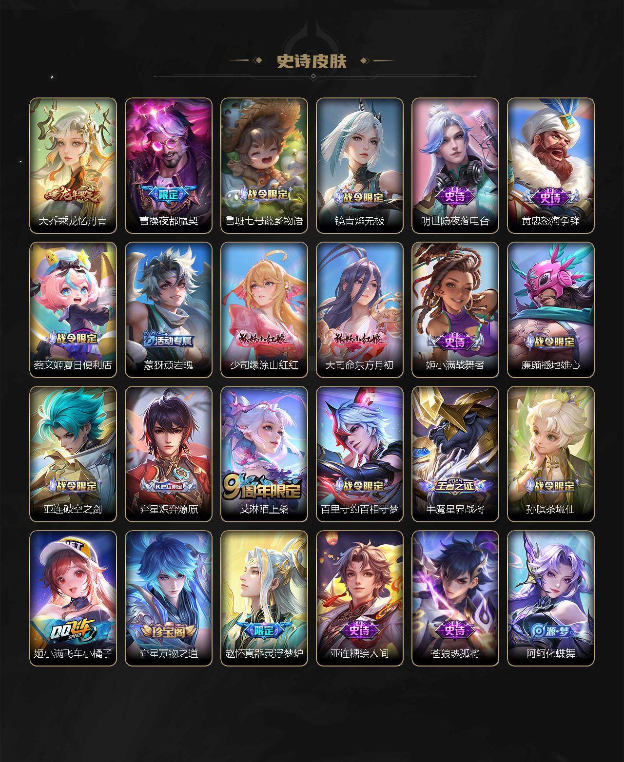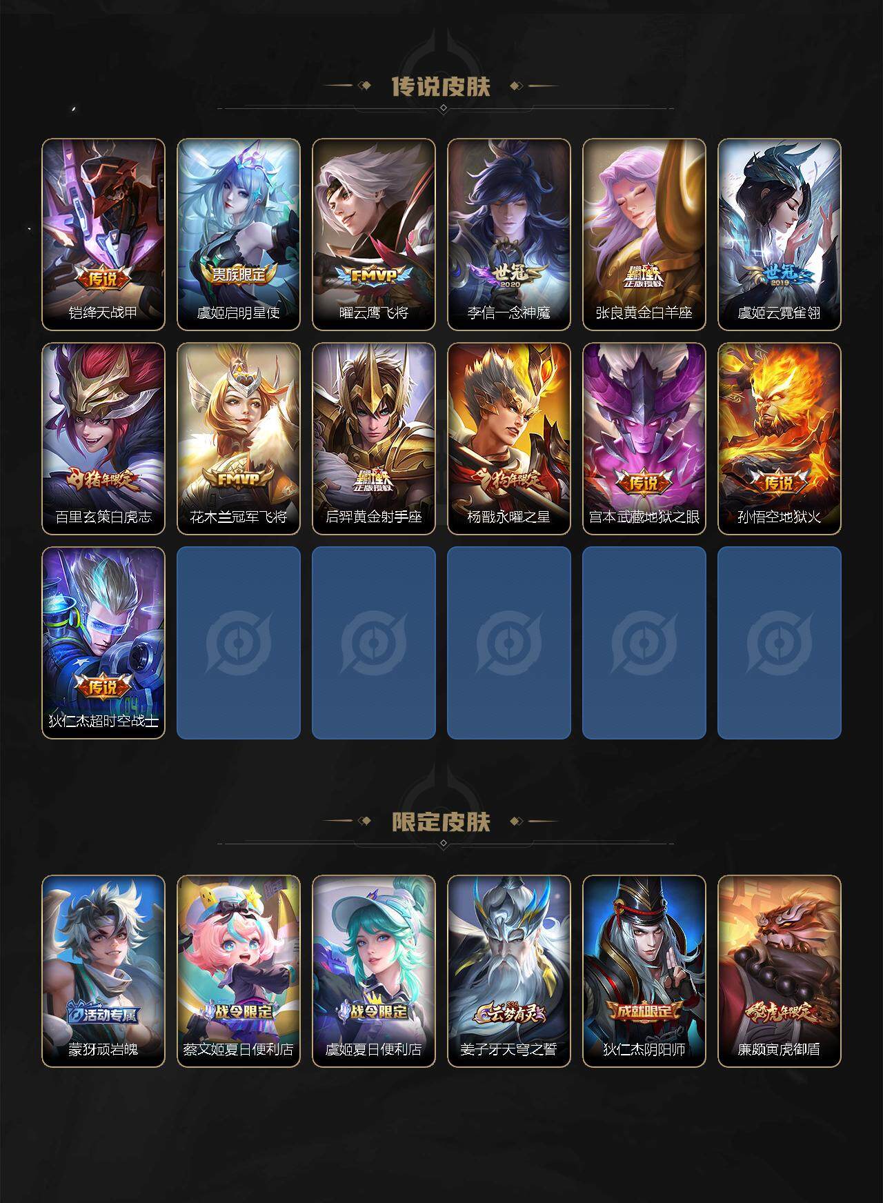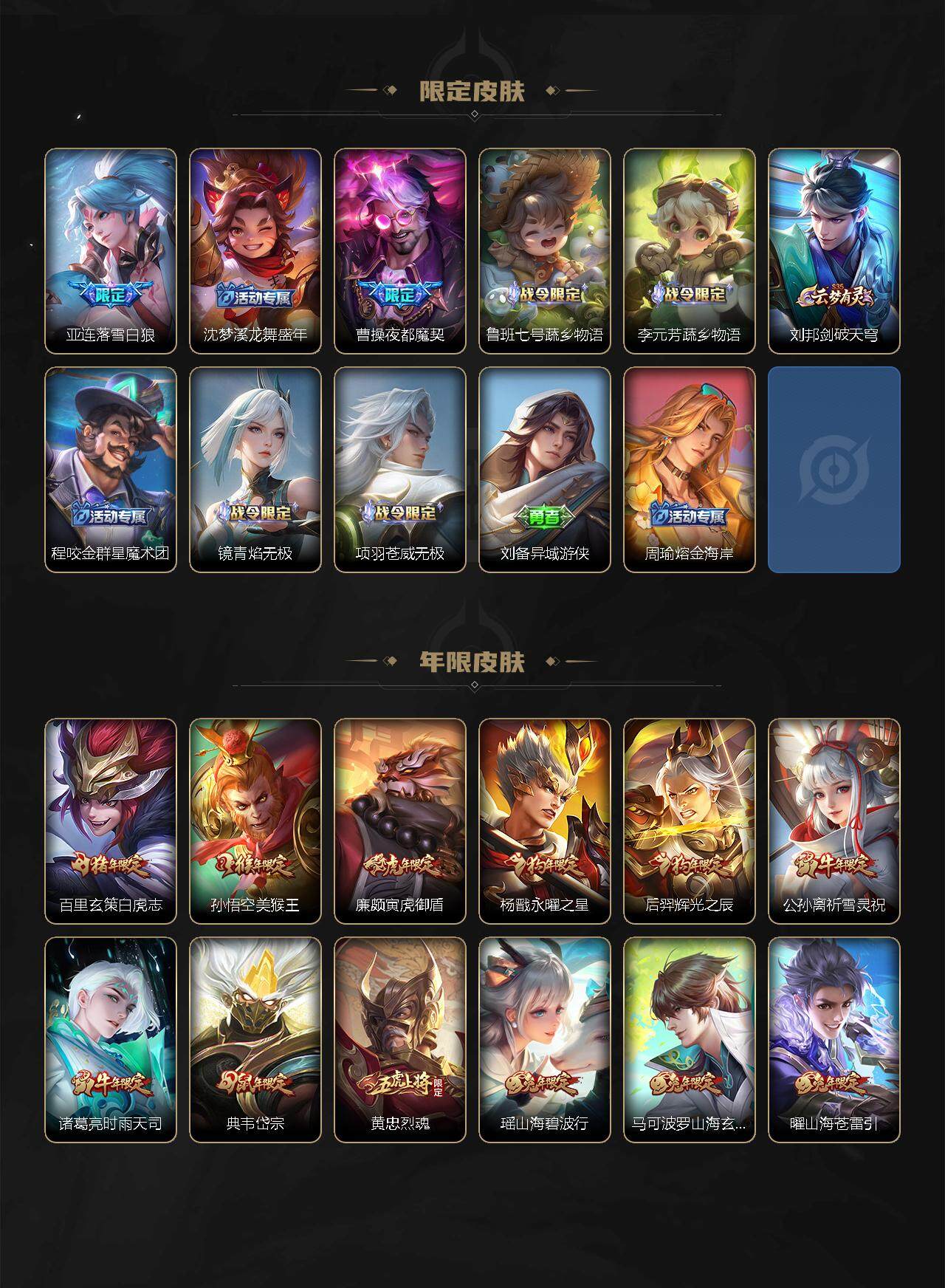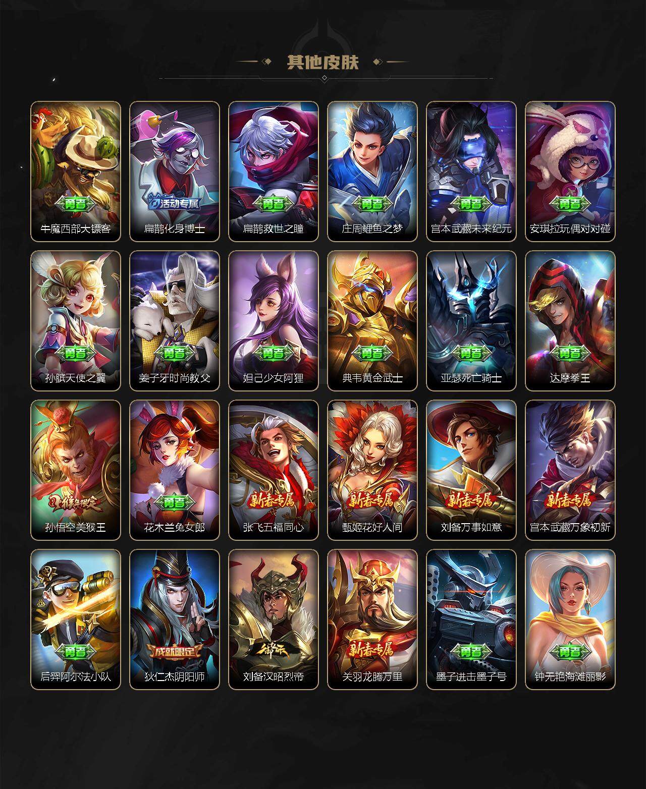 【限定皮肤】:蒙犽顽岩魄,蔡文姬夏日便利店,虞姬夏日便利店,姜子牙天穹之誓,狄仁杰阴阳师,廉颇寅虎御盾,赵云皇家上将,赵云引擎之心,赵云百木心枪,墨子神迹守卫,墨子降魔,鲁班七号时之奇旅,庄周高山流水,高渐离玩趣恶龙,扁鹊奇幻香踪,周瑜赤莲之焰,元歌云间偶戏,甄姬至美化雀舞,典韦岱宗,马可波罗暗影游猎,马可波罗山海玄木吟,马可波罗妄想实况,狄仁杰魔术师,达摩沙漠行僧,项羽海滩派对,老夫子醍醐杖,老夫子航海奇遇记,关羽百相守梦,貂蝉逐梦之音,程咬金演武夺筹,王昭君午后时光,兰陵王影龙天霄,兰陵王金庭之子,孙悟空美猴王,后羿辉光之辰,刘备百相守梦,张飞百相守梦,李元芳云中旅人,虞姬启明星使,钟馗驱傩正仪,杨戬永曜之星,杨戬潮玩骑兵,哪吒逐梦之翼,干将莫邪画中仙,雅典娜单词大作战,雅典娜黎明之约,太乙真人华丽摇滚,鬼谷子原初探秘者