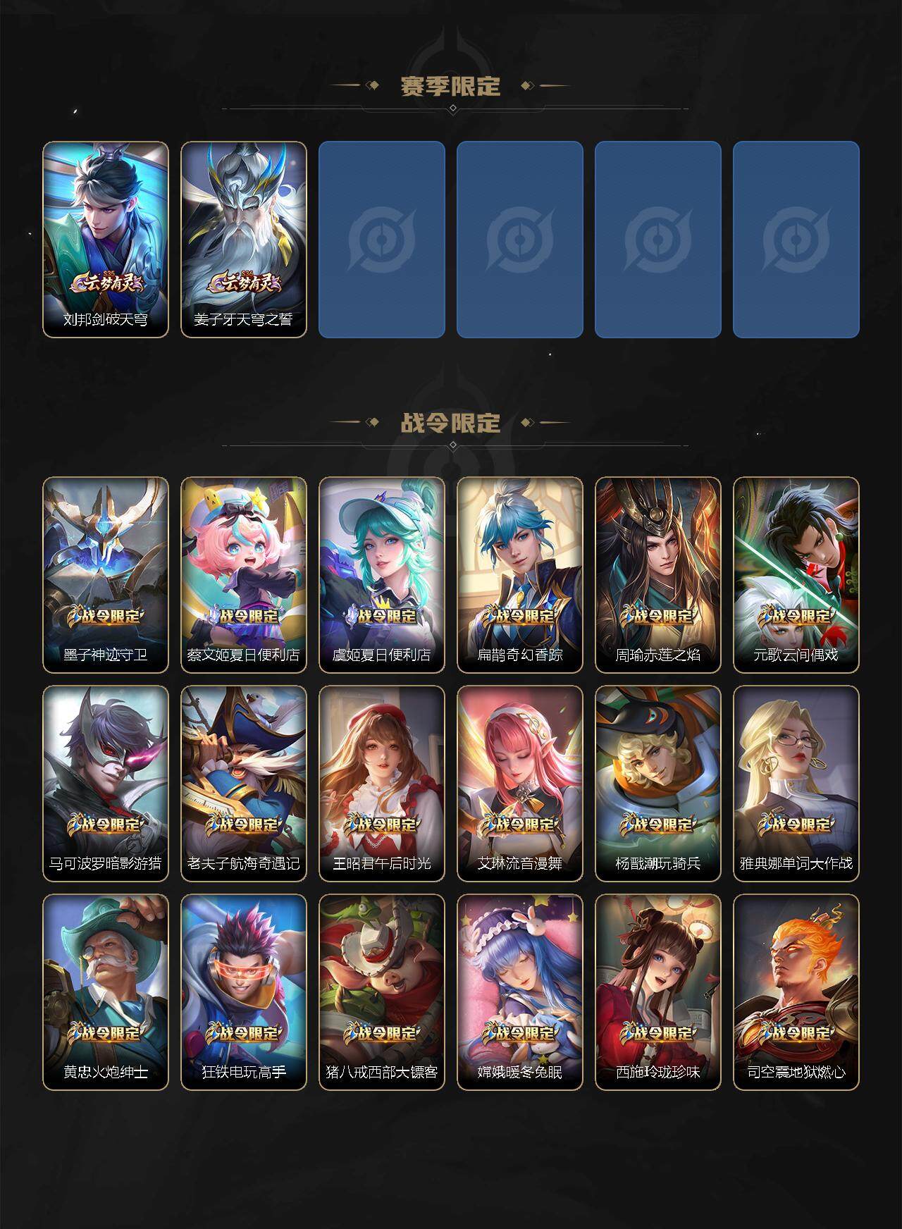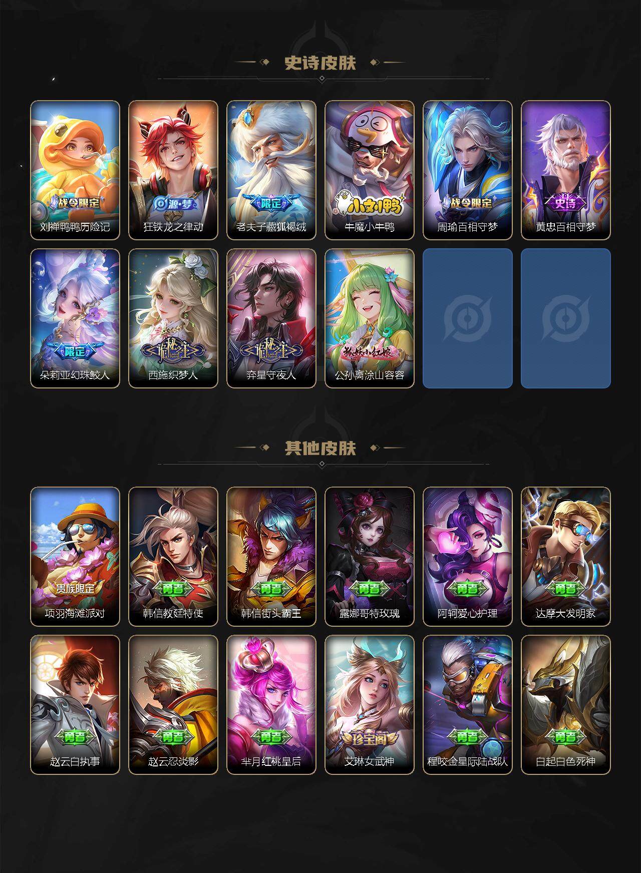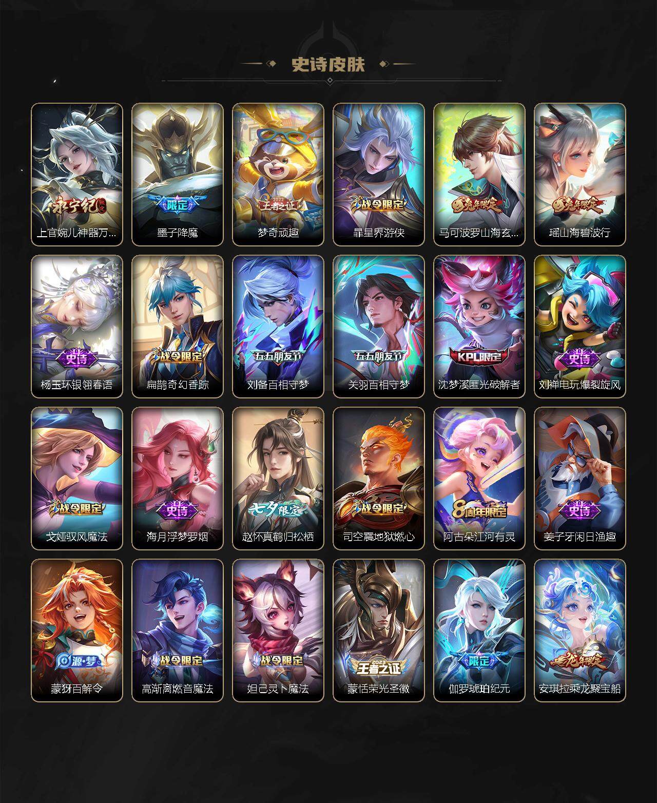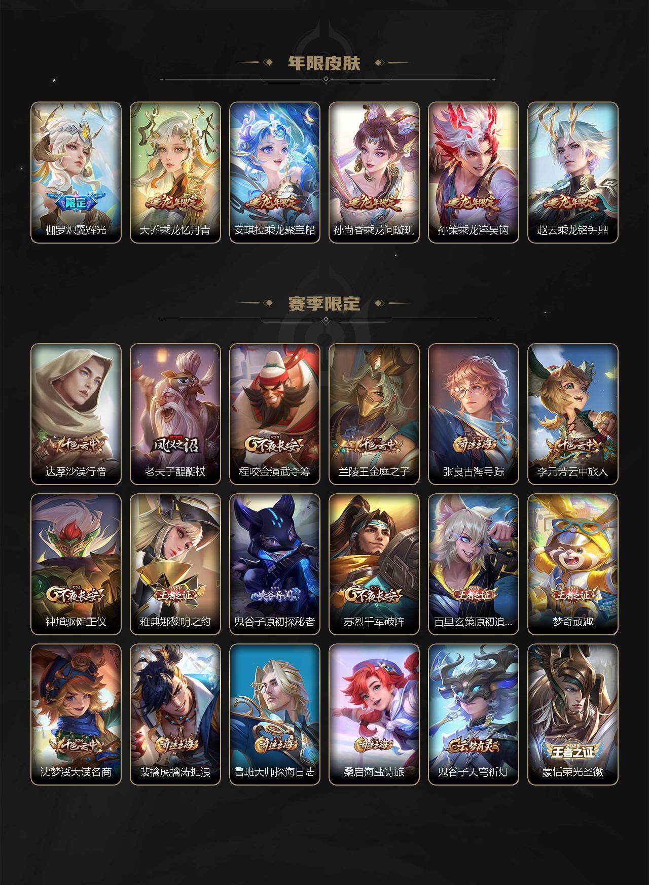 【限定皮肤】:蒙犽顽岩魄,蔡文姬夏日便利店,虞姬夏日便利店,姜子牙天穹之誓,狄仁杰阴阳师,廉颇寅虎御盾,赵云皇家上将,赵云引擎之心,赵云百木心枪,墨子神迹守卫,墨子降魔,鲁班七号时之奇旅,庄周高山流水,高渐离玩趣恶龙,扁鹊奇幻香踪,周瑜赤莲之焰,元歌云间偶戏,甄姬至美化雀舞,典韦岱宗,马可波罗暗影游猎,马可波罗山海玄木吟,马可波罗妄想实况,狄仁杰魔术师,达摩沙漠行僧,项羽海滩派对,老夫子醍醐杖,老夫子航海奇遇记,关羽百相守梦,貂蝉逐梦之音,程咬金演武夺筹,王昭君午后时光,兰陵王影龙天霄,兰陵王金庭之子,孙悟空美猴王,后羿辉光之辰,刘备百相守梦,张飞百相守梦,李元芳云中旅人,虞姬启明星使,钟馗驱傩正仪,杨戬永曜之星,杨戬潮玩骑兵,哪吒逐梦之翼,干将莫邪画中仙,雅典娜单词大作战,雅典娜黎明之约,太乙真人华丽摇滚,鬼谷子原初探秘者