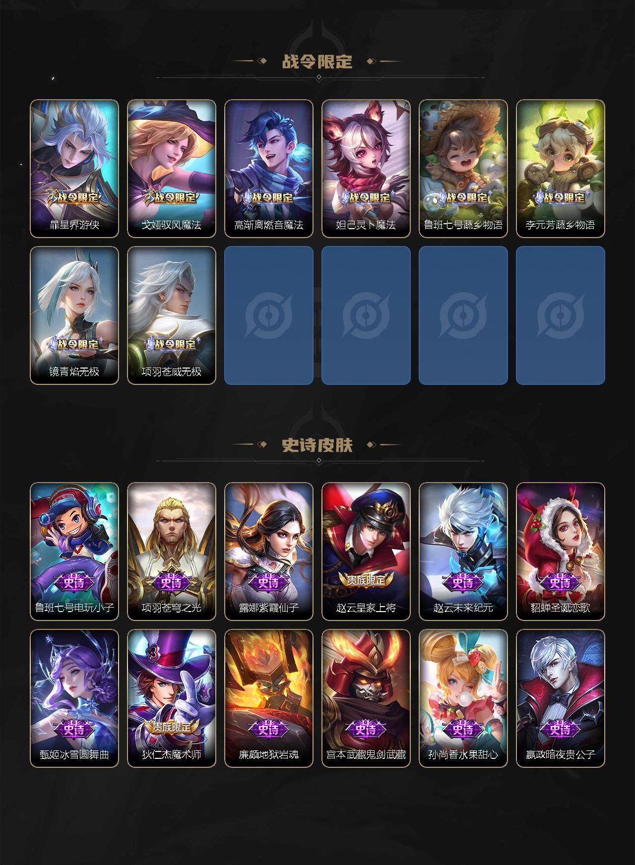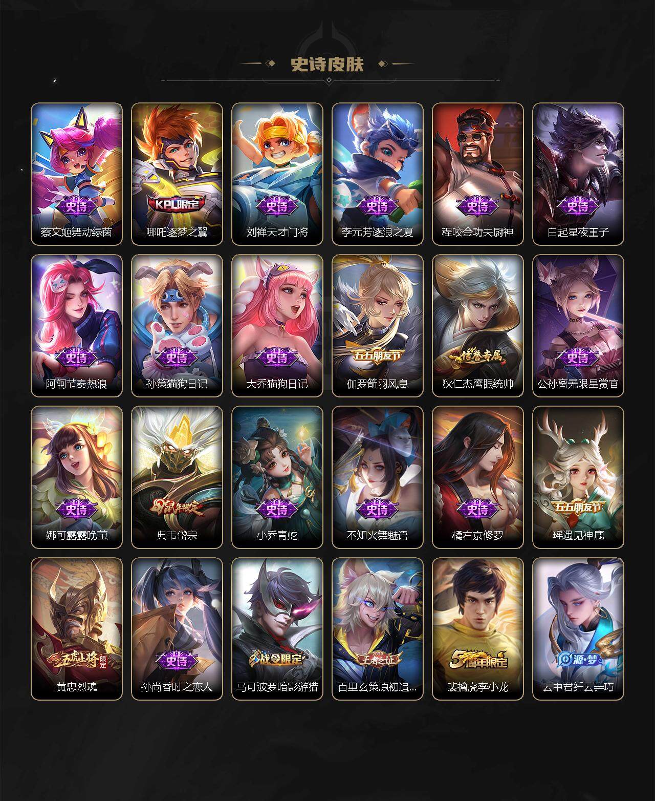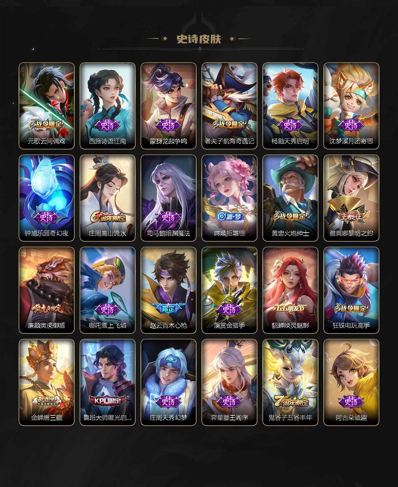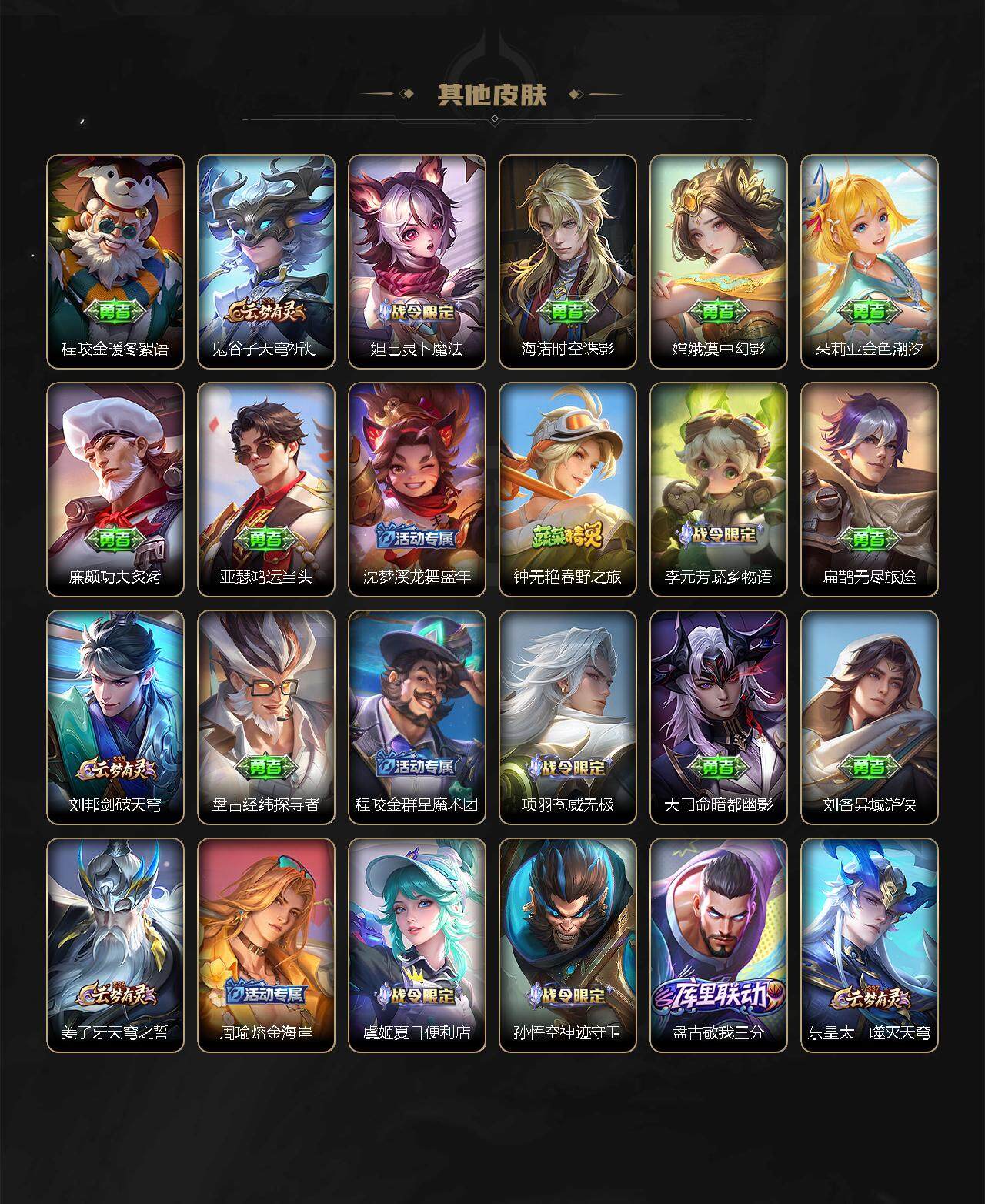 裴擒虎李小龙,貂蝉逐梦之音,公孙离祈雪灵祝,诸葛亮时雨天司,黄忠烈魂,后羿辉光之辰,典韦岱宗,哪吒逐梦之翼,百里玄策白虎志,赵云引擎之心,孙悟空美猴王,廉颇寅虎·御盾,赵云百木心枪,金蝉唐三藏,鲁班大师匿光启智者,上官婉儿神器·万象笔,墨子降魔,李白诗剑行,马可波罗山海·玄木吟,瑶山海·碧波行,兰陵王影龙天霄,甄姬至美·化雀舞,桑启鸣野蒿,艾琳陌上桑,王昭君映山客,澜愿照·九州拓,蔡文姬愿照·福禄聚,虞姬愿照·岁时盈,司空震愿照·山河定,妲己愿照·众生和,女娲愿照·千秋盛