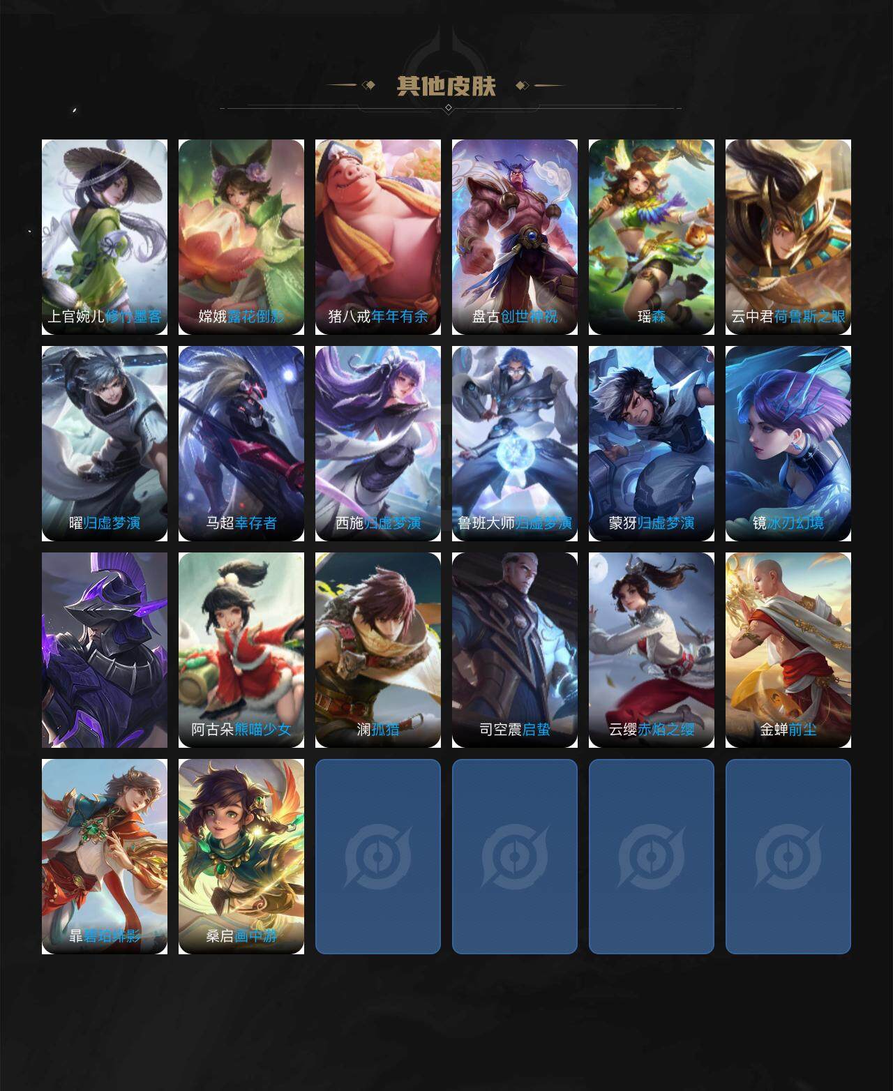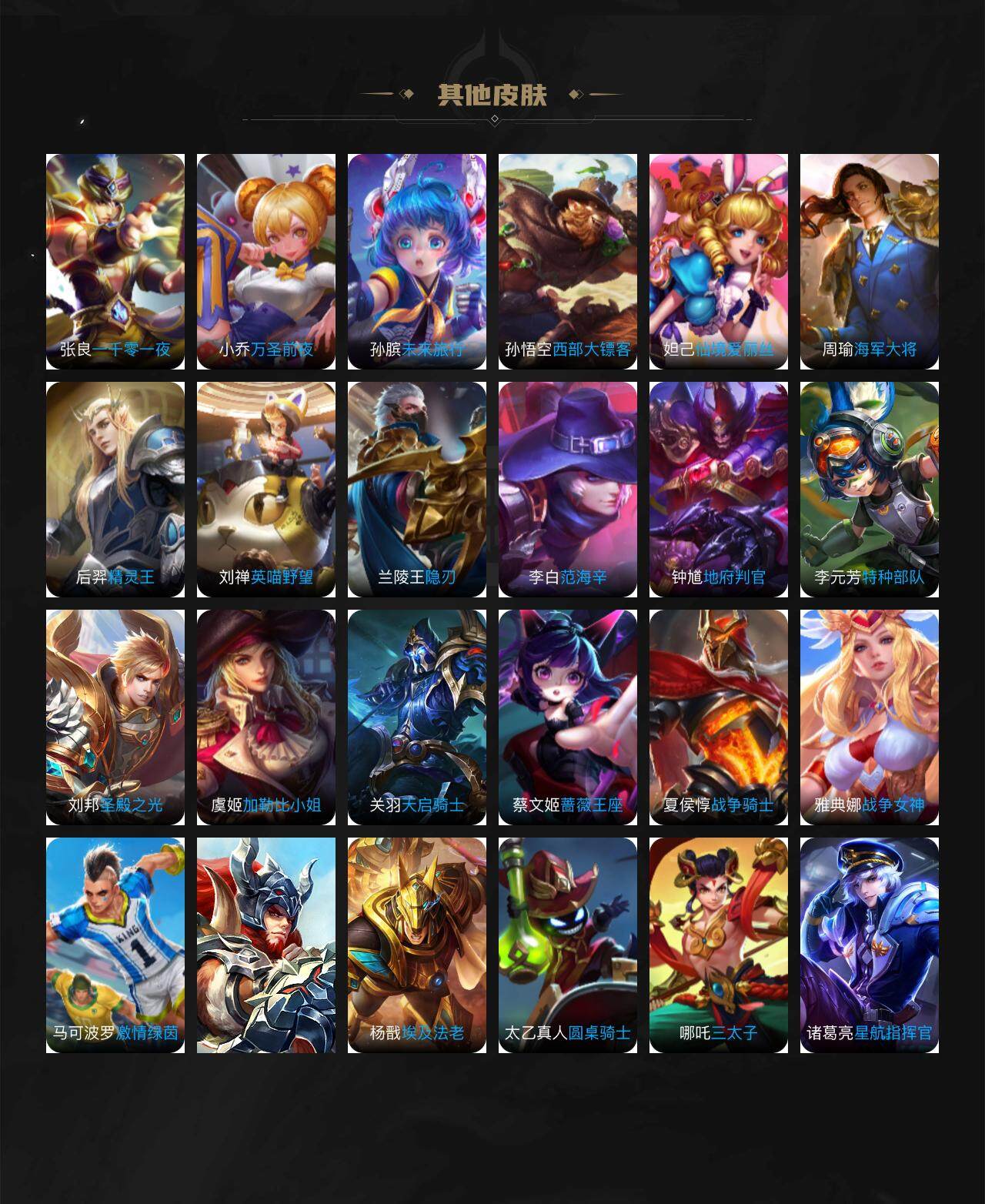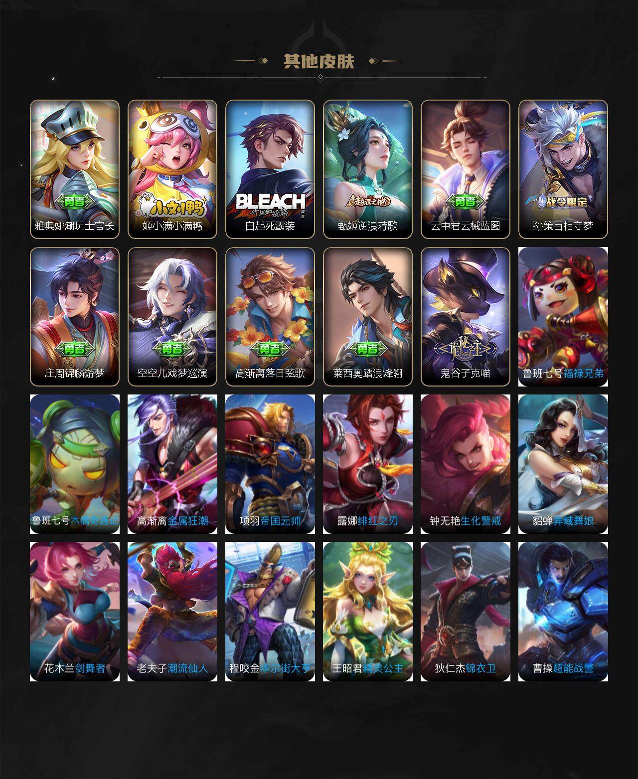 小乔青蛇,瑶遇见神鹿,娜可露露晚萤,伽罗箭羽风息,李元芳逐浪之夏,不知火舞魅语,公孙离无限星赏官,大乔猫狗日记,孙策猫狗日记,阿轲节奏热浪,露娜紫霞仙子,诸葛亮黄金分割率,项羽苍穹之光,孙尚香时之恋人,雅典娜冰冠公主,吕布末日机甲,鲁班七号电玩小子,蒙犽龙鼓争鸣,橘右京修罗,嬴政摇滚巨星,刘禅绅士熊喵,刘禅天才门将,白起星夜王子,安琪拉心灵骇客,程咬金功夫厨神,刘邦德古拉伯爵,兰陵王暗隐猎兽者,曹操幽灵船长,宫本武藏鬼剑武藏,司马懿暗渊魔法,亚瑟心灵战警,钟馗乐园奇幻夜,杨戬天秀·启明,蔡文姬舞动绿茵,廉颇地狱岩魂,西施诗语江南,小乔缤纷独角兽,夏侯惇乘风破浪,花木兰水晶猎龙者,铠曙光守护者,墨子金属风暴,百里玄策原初追逐者,吕布圣诞狂欢,貂蝉圣诞恋歌,百里守约特工魅影,嬴政暗夜贵公子,嫦娥拒霜思,雅典娜黎明之约,李白千年之狐,哪吒雪上飞焰,澜赏金猎手,貂蝉唤灵魅影,庄周天秀·幻梦,弈星滕王阁序,阿古朵顽趣,杨玉环银翎春语,刘备百相守梦,关羽百相守梦,沈梦溪匿光破解者,刘禅电玩·爆裂旋风,海月浮梦罗烟,赵怀真鹤归松栖,姜子牙闲日渔趣,蒙犽百解令,高渐离燃音魔法,伽罗琥珀纪元,大乔乘龙·忆丹青,安琪拉乘龙·聚宝船,曹操夜都魔契,明世隐夜落电台,姬小满飞车小橘子,赵怀真器灵·浮梦炉,亚连糖绘人间,苍狼魂孤将