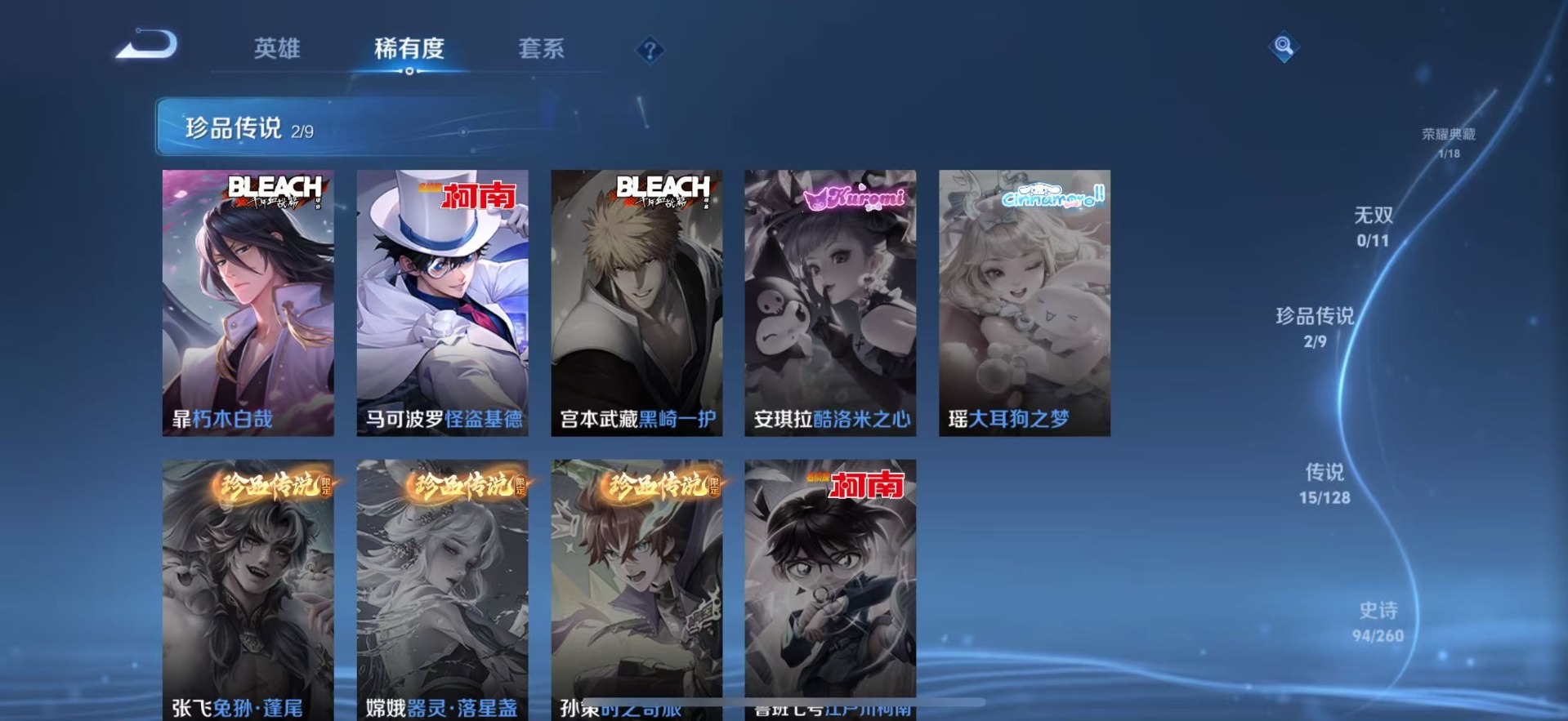 - [11528512]V8 3珍品传说 27传说 124英雄 217皮肤 可修改实名 优质装备:江户川柯南,大耳狗之梦,黄金射手座,云鹰飞将(小将军),绛天战甲(鸡嘴战神),炽阳神光,一念神魔,云霓雀翎,海洋之心,超时空战士-狄仁杰,无双飞将,浮生妄,鹤羽星尊,妄想实况,玄雷天君 珍品传说:兔狲·蓬尾 传说皮:云诺千山,续相思,祥瑞亨通,幻光神枪 珍宝阁皮:女武神 限定皮:愿照·九州拓(澜年限),愿照·福禄聚(蔡文姬年限),愿照·岁时盈(虞姬年限),愿照·山河定(司空震年限),愿照·众生和(妲己年限),愿照·千秋盛(女娲年限),逐霄战戟,陌上桑,鸣野蒿,绯月行,怒海麟威,李小龙,山海·玄木吟(马可年限) 史诗皮:鸭鸭历险记-刘禅,苍鳞隐世,器灵·浮梦炉,糖绘人间,狼魂孤将,绮世丹青,瑰影绮梦,化蝶舞,谪仙醉月,龙之律动,雪豹·霜爪,藏狐·褐绒,布丁狗之誓,茶境仙,怒海争锋,蒙犽顽岩魄,琥珀纪元伽罗,遇见神鹿,紫霞仙子,特工魅影,江河有灵,青蛇,偶像歌手,白蛇,晚萤,末日机甲-吕布,时之恋人-孙尚香,乱世虎臣,修罗,摇滚巨星,水果甜心,功夫厨神,暗隐猎兽者,幽灵船长,鬼剑武藏,乐园奇幻夜,缤纷独角兽,乘风破浪,逐浪之夏,水晶猎龙者,热力回旋,箭羽风息,金属风暴,圣诞狂欢,鹰眼统帅,魅力维加斯,赏金猎手