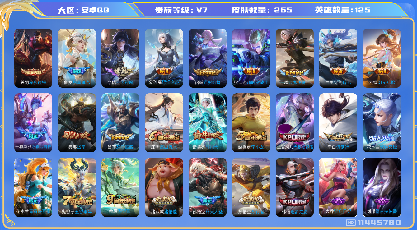 [11445780]V7 1典藏 13传说 125英雄 265皮肤 可修改实名 优质装备:赤影疾锋,云鹰飞将(小将军),猫影幻舞,一念神魔,超时空战士-狄仁杰,碎云,炽翼辉光(娃娃菜牛角包),记忆之芯(机甲兔) 传说皮:幻光神枪 珍宝阁皮:妄想食味,蔷薇恋人,玩趣恶龙 限定皮:鸣野蒿,时雨天司(水龙头),高山流水,诗剑行,齐天大圣,怒海麟威,五谷丰年,岱宗(典韦年限),天狼绘梦者,李小龙,逐梦之影,默契交锋-花木兰,孙行者,猪悟能,青春决赛季,冰霜恋舞曲 史诗皮:破空之剑,紫霞仙子,白龙吟,黄金分割率,特工魅影,千年之狐,永昼,百相守梦(关羽),江河有灵,百解令(蒙犽),魅语,冰冠公主,青蛇,末日机甲-吕布,猫狗日记-孙策,猫狗日记-大乔,时之恋人-孙尚香,乱世虎臣,节奏热浪,修罗,女仆咖啡,摇滚巨星,水果甜心,绅士熊喵,天才门将,星夜王子,心灵骇客,德古拉伯爵,幽灵船长,鬼剑武藏,心灵战警,舞动绿茵,繁星吟游(呼啦呼啦),拒霜思,缤纷独角兽,乘风破浪,逐浪之夏,水晶猎龙者,曙光守护者,唤灵魅影,金属风暴,圣诞狂欢,圣诞恋歌,鹰眼统帅,魅力维加斯,无心,未来纪元-赵云